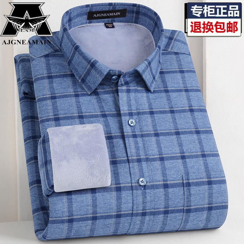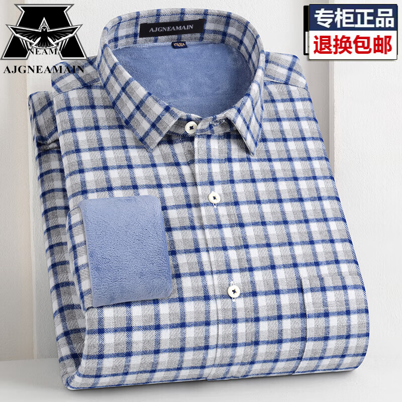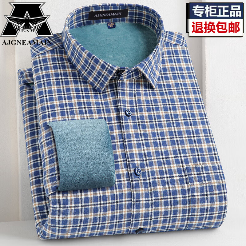 AJGNEAMAIN男装秋冬款全棉磨毛格子衬衫男士加绒加厚长袖衬衣商务休闲爸爸装 111-1上青大格子 加绒 39码 【建议125-135斤】