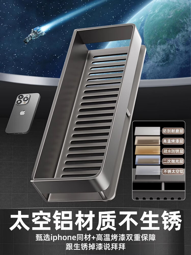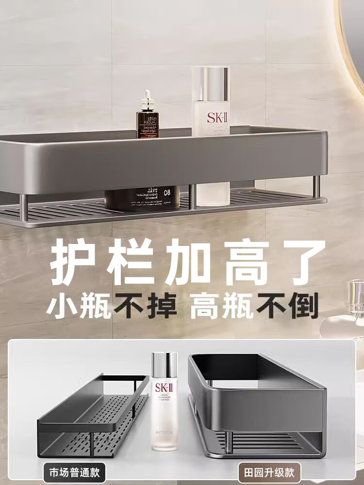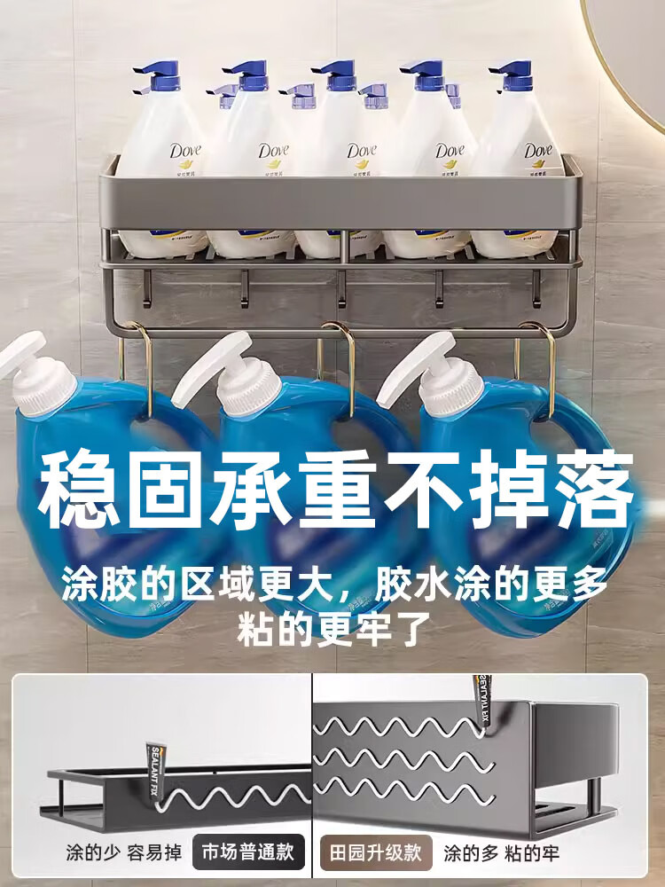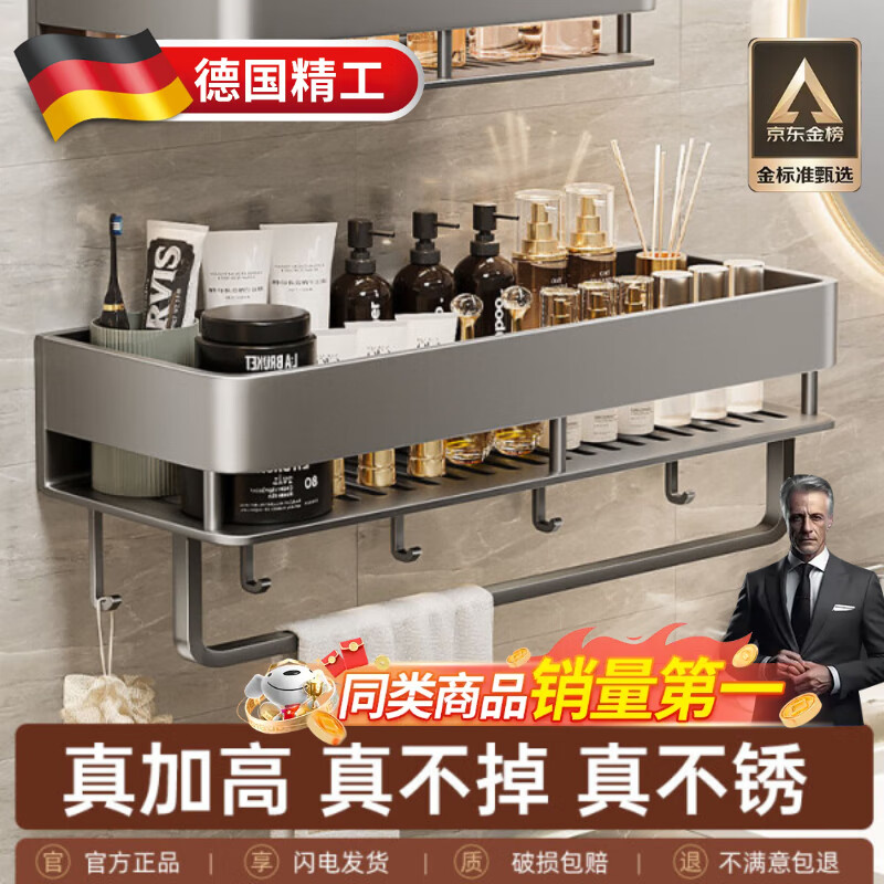 【德国精工】灰浴室置物架免打孔壁挂卫生间铝防水沐浴露收纳架 单层-【加高】灰60CM+毛巾杆+5钩