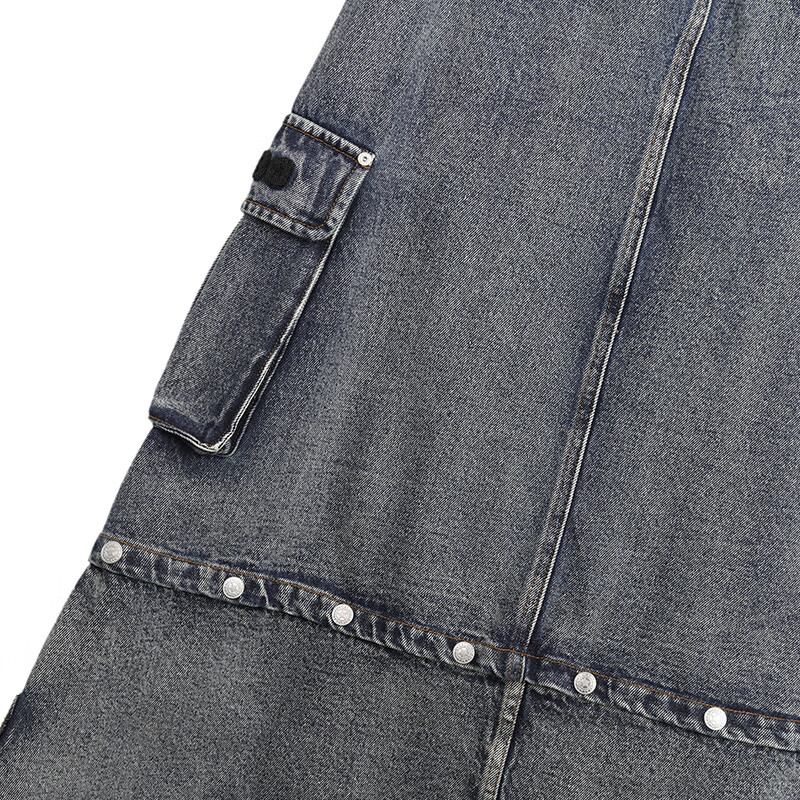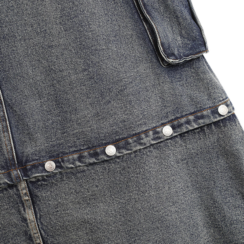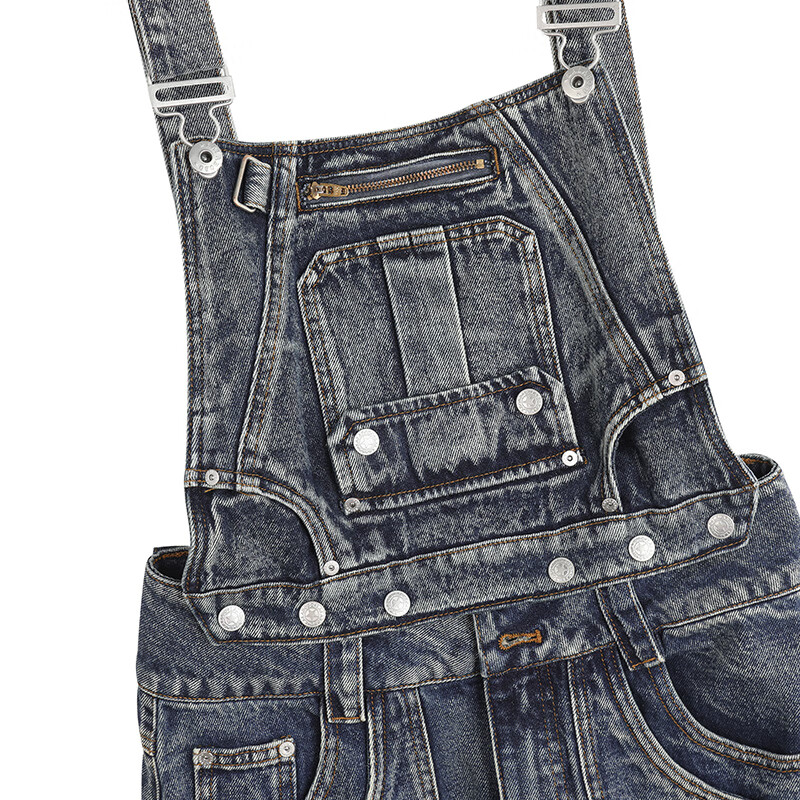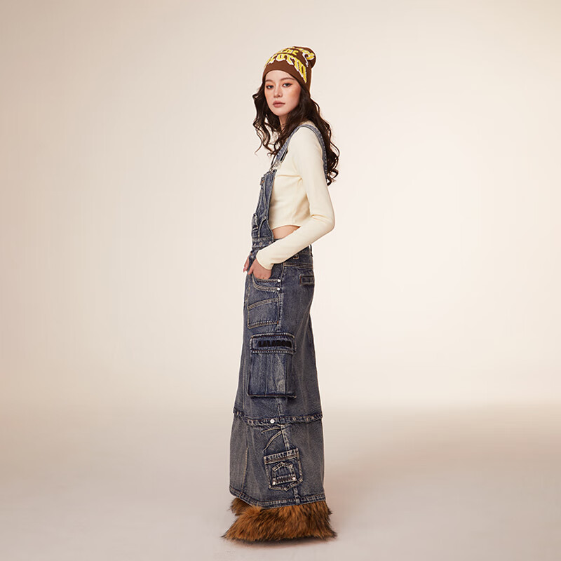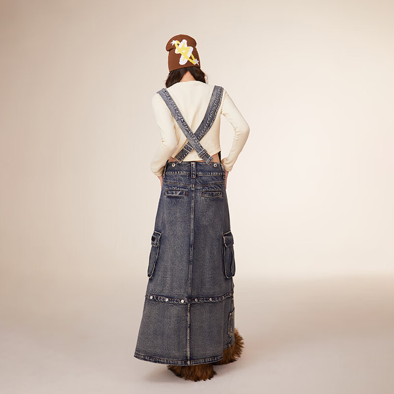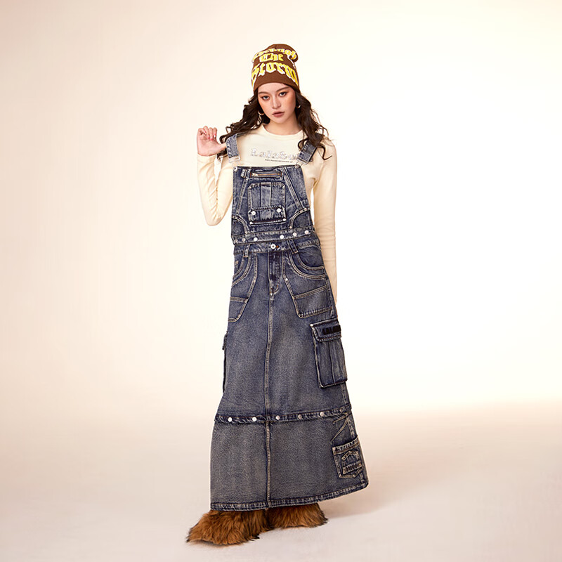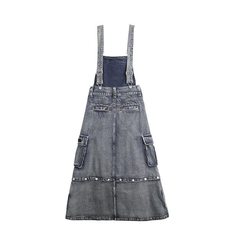 拉拉波波新款100纯棉多口袋休闲可拆卸背带牛仔连衣长裙女LBCD-WLZY12 深蓝白 M