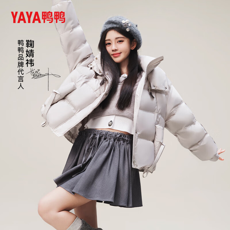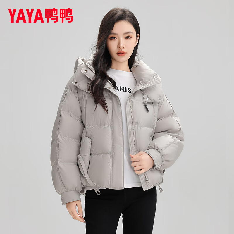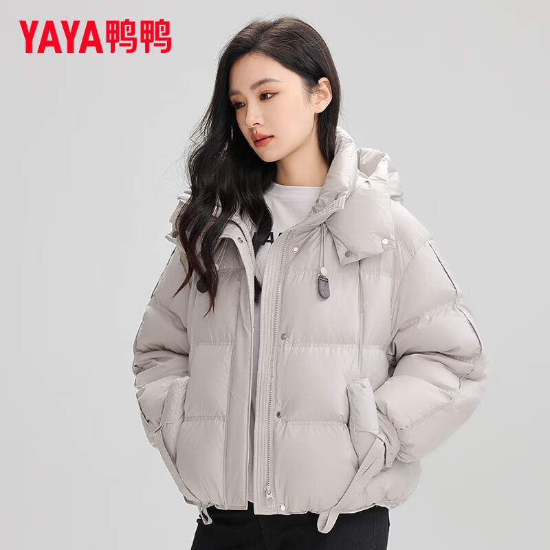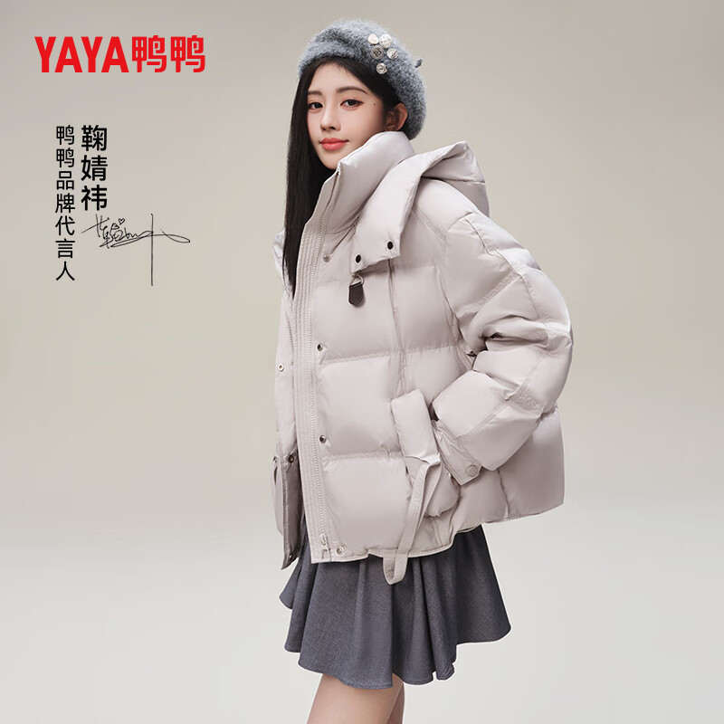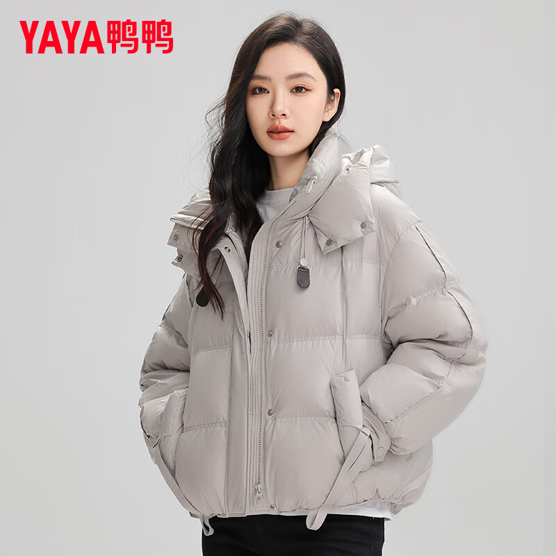 鸭鸭(YAYA)鞠婧祎同款羽绒服女短款2024冬季新款连帽时尚潮流鸭绒保暖外套XH 浅灰色 160/84A(M)