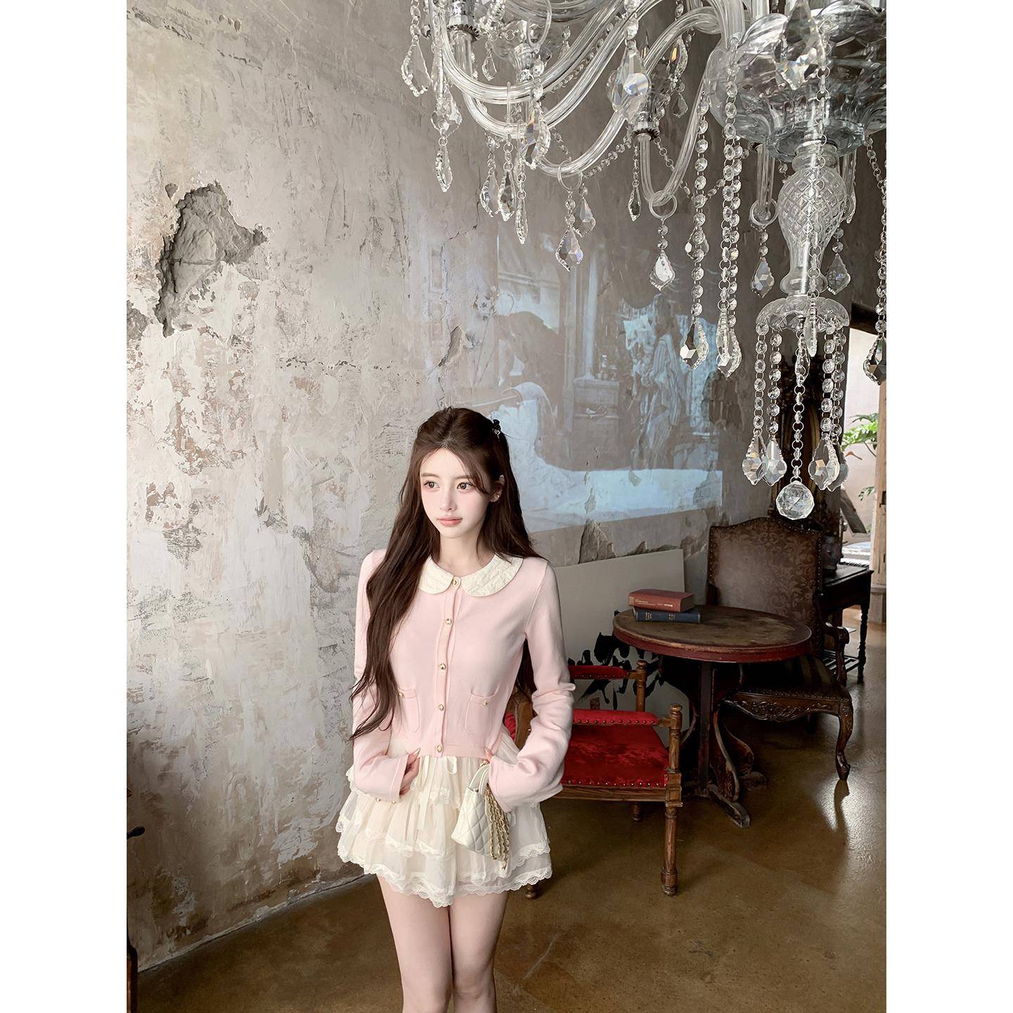 若语定制奶油小香 25B粉色小香可拆卸娃娃领针织开衫外套早秋上衣
