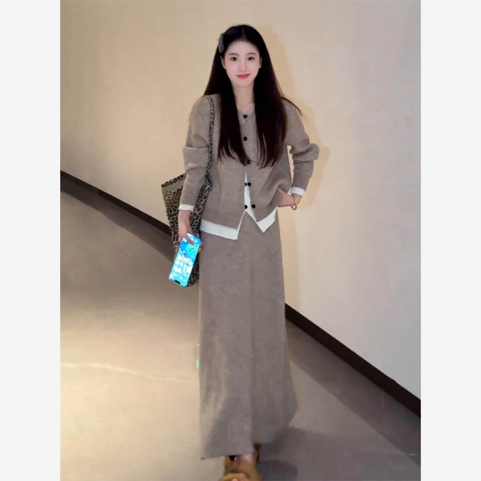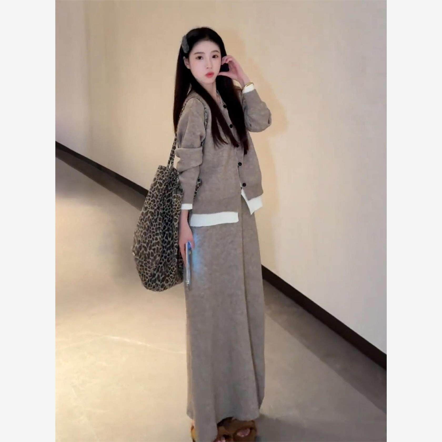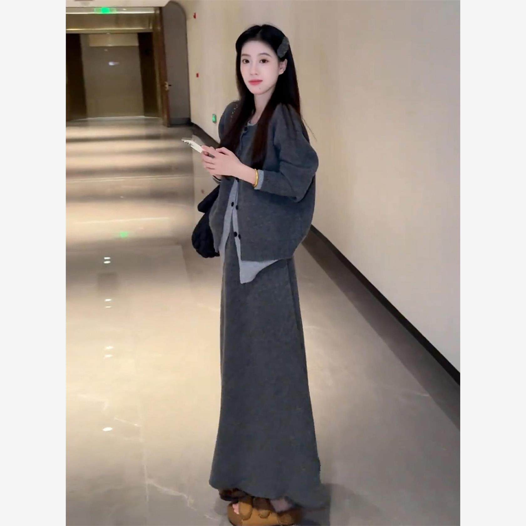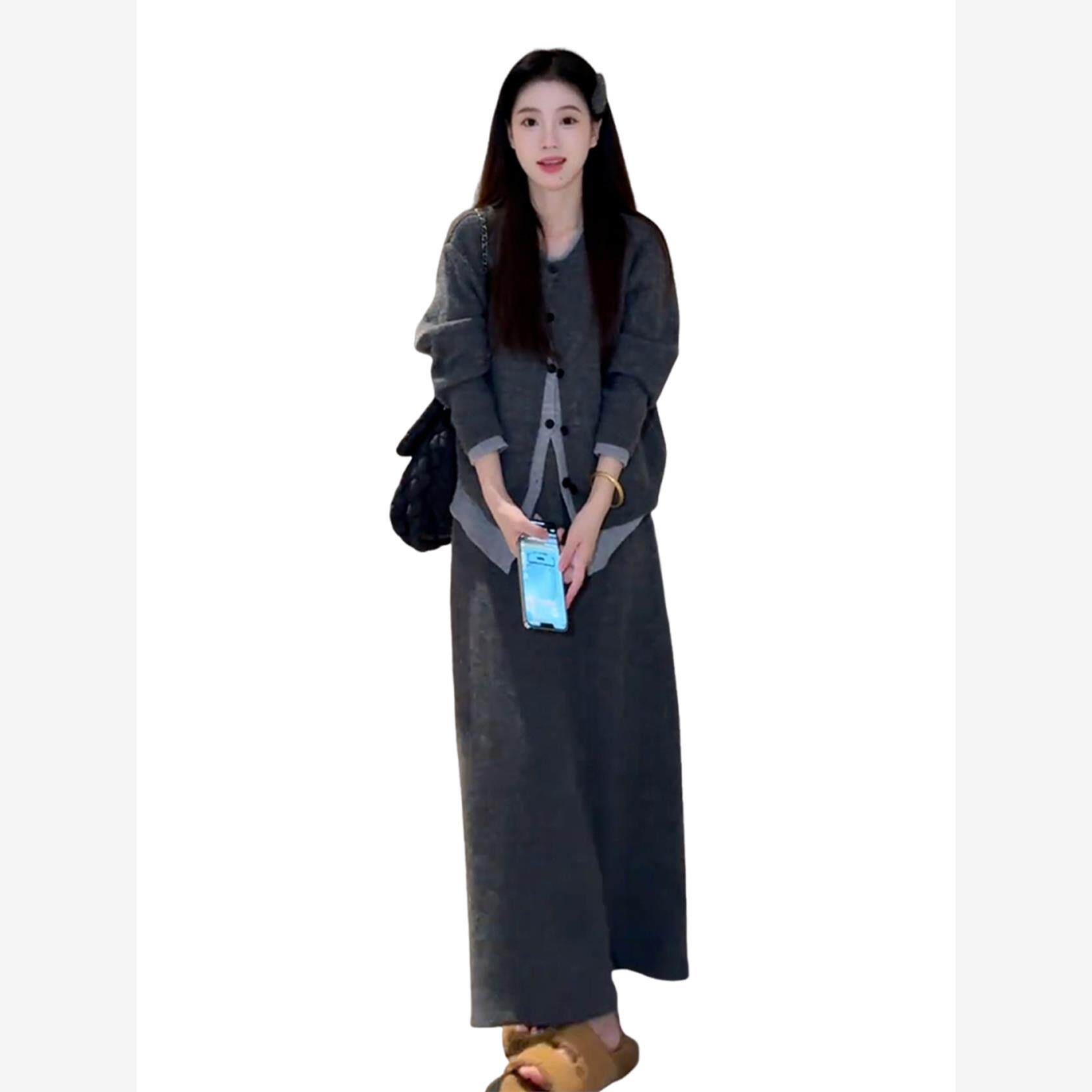 2025新款韩系高级感穿搭针织连衣裙子女秋冬季慵懒风灰色套装长裙