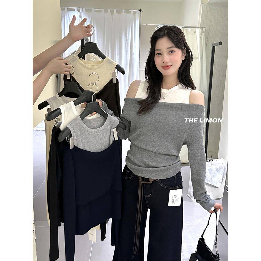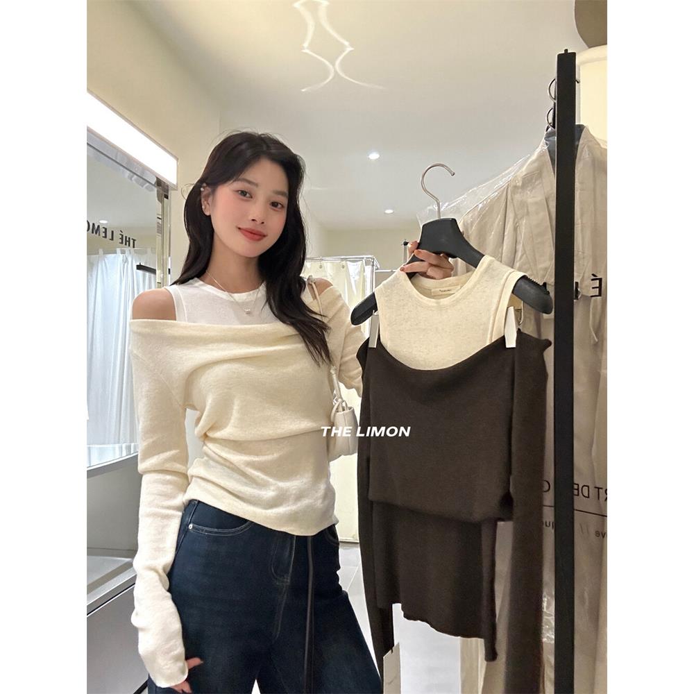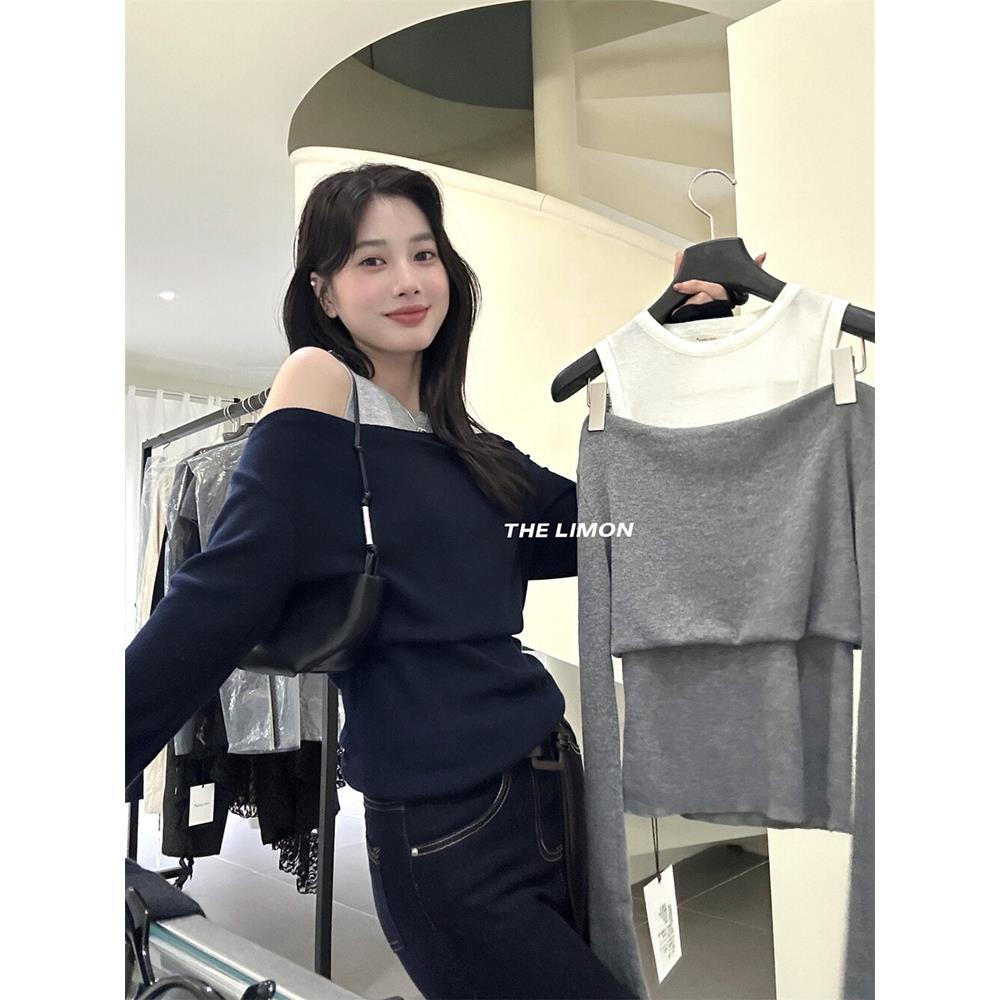 撞色一字肩假两件针织长袖T恤女秋季设计感修身显瘦露肩气质上衣