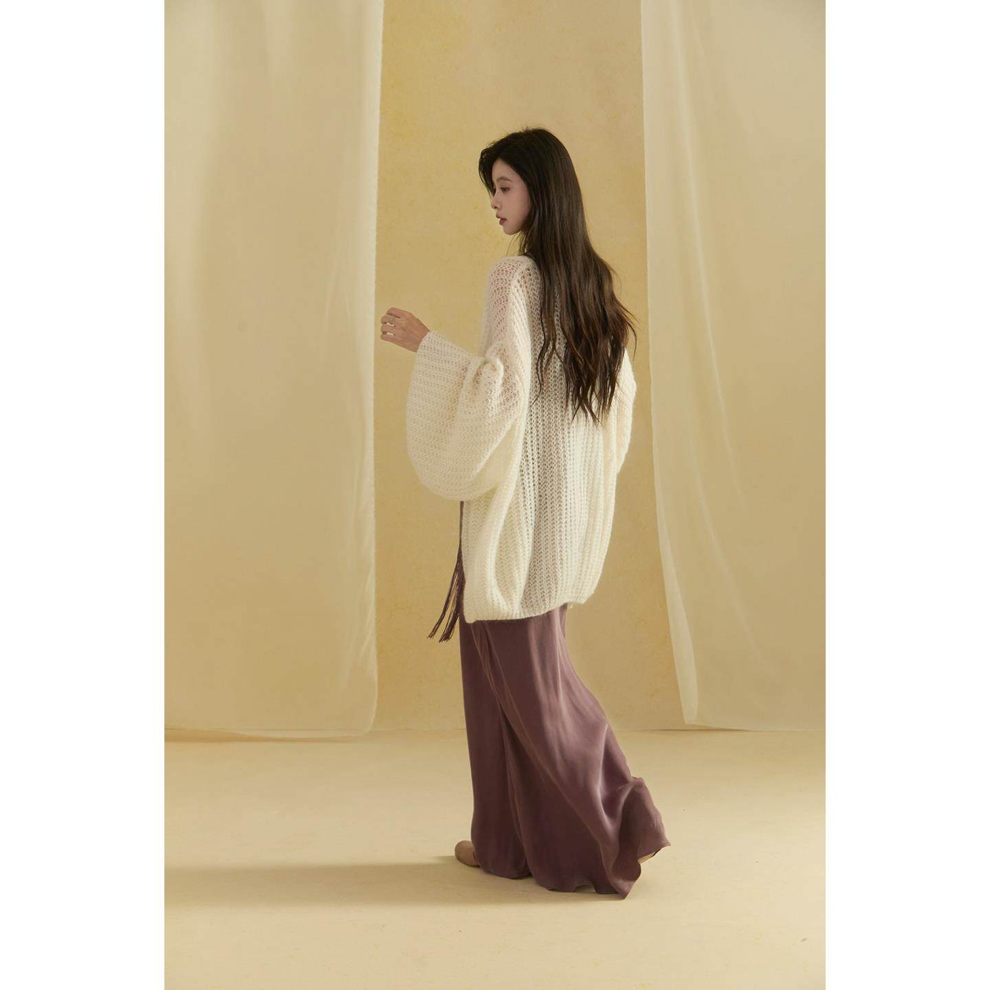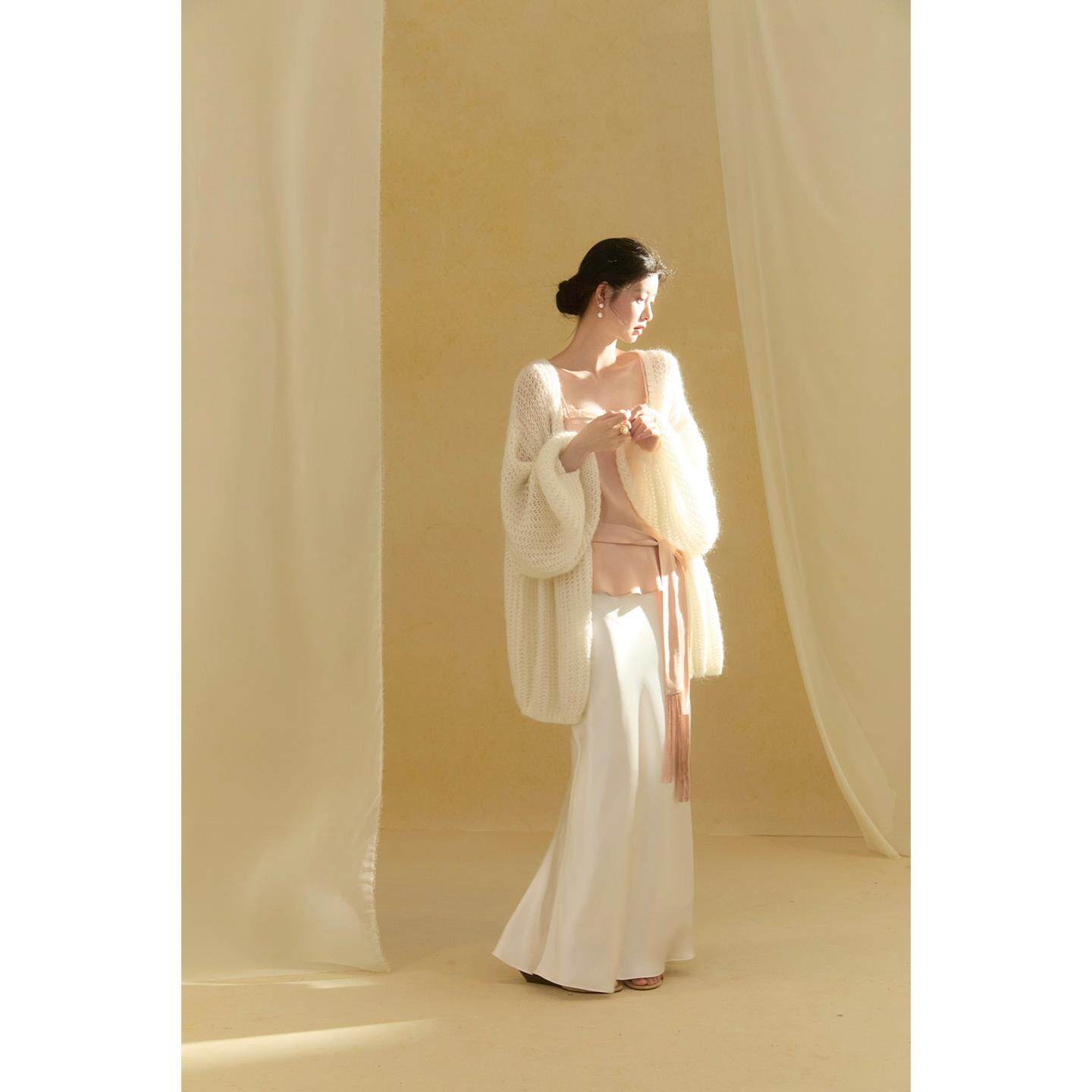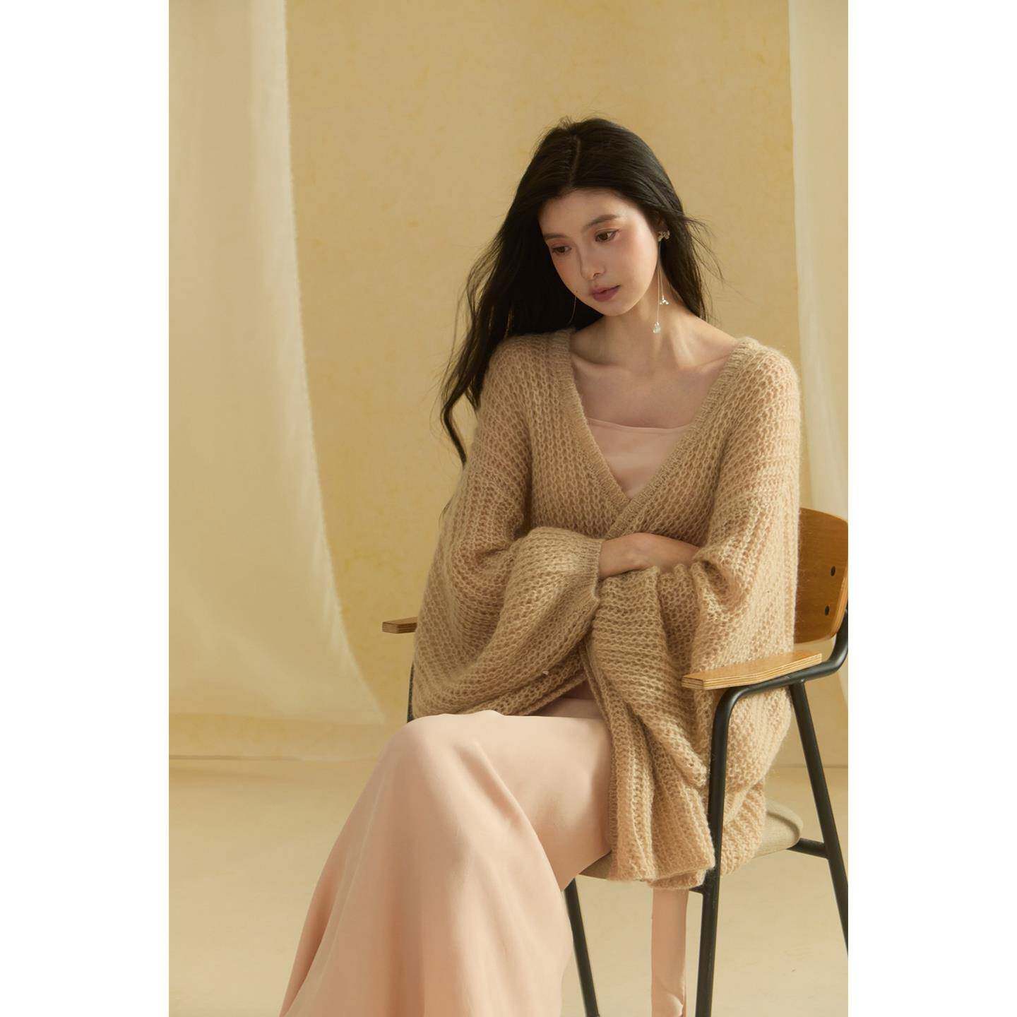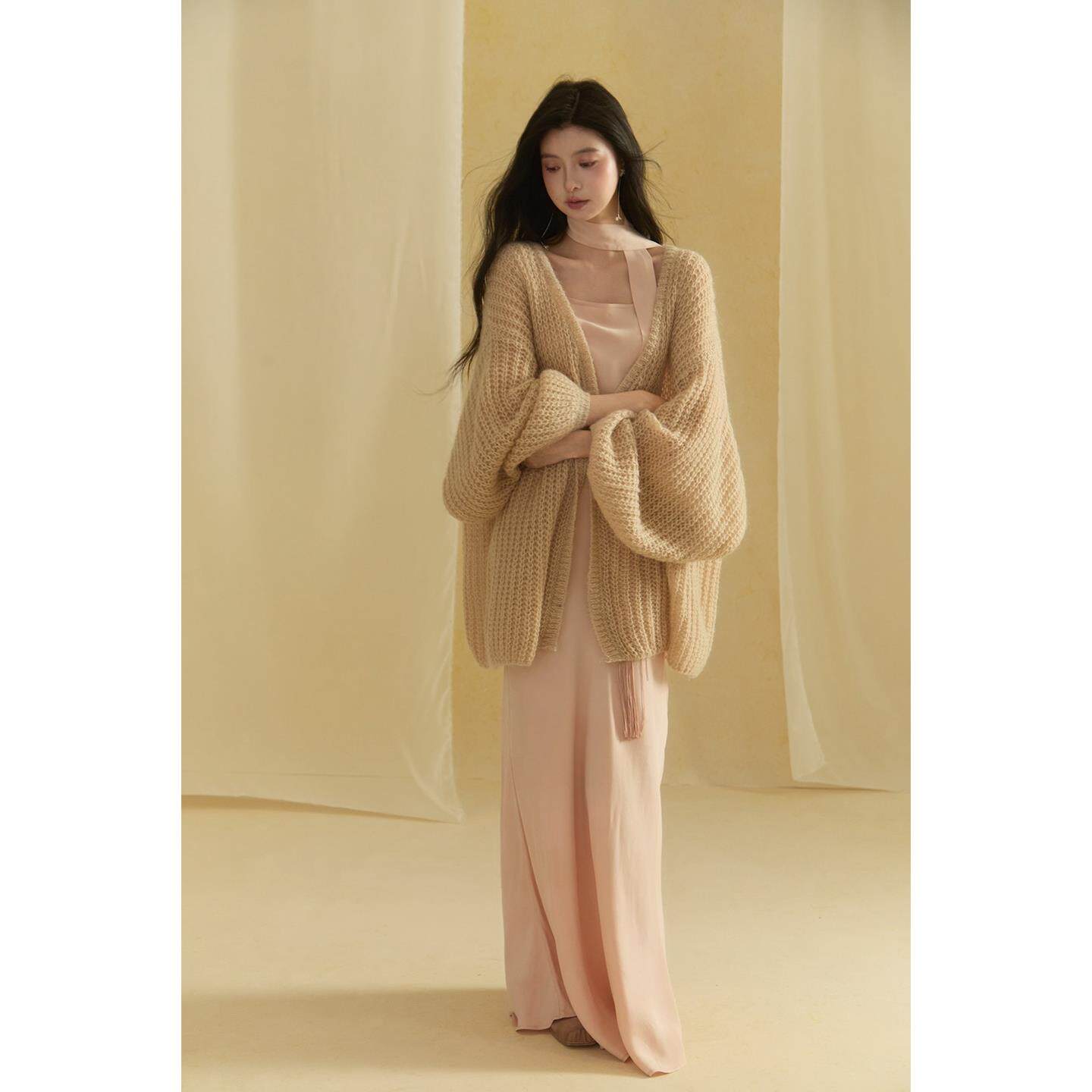 秋季镂空灯笼袖马海毛针织开衫上衣女秋中长款慵懒风宽松显瘦外套