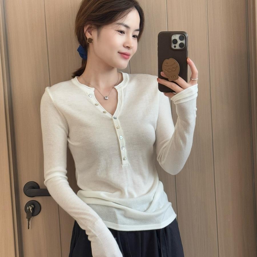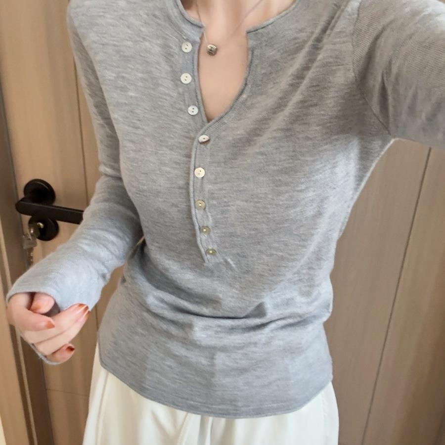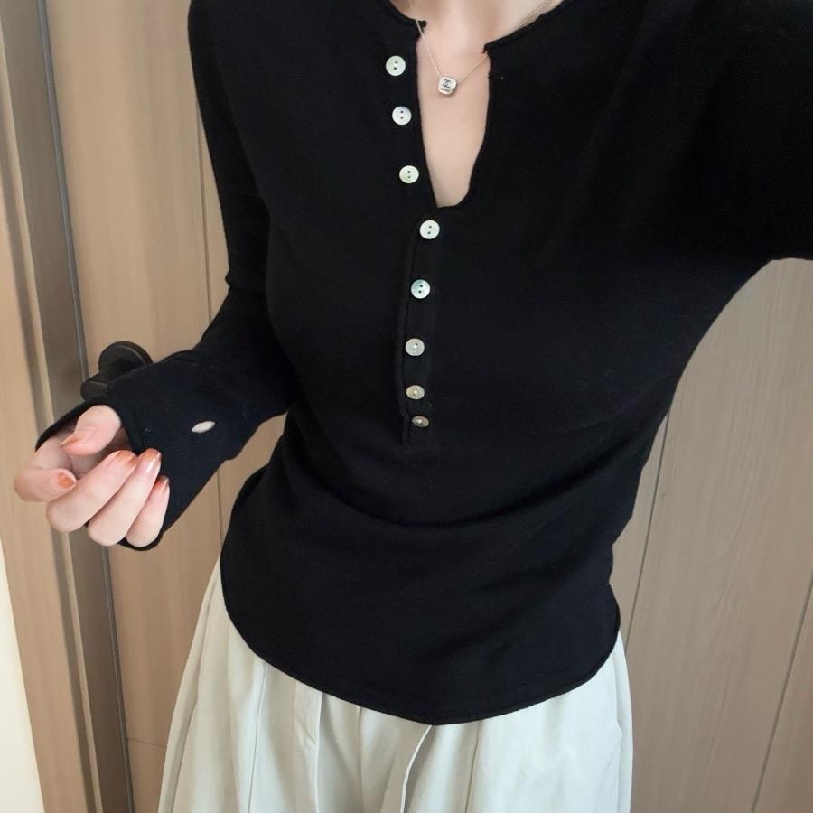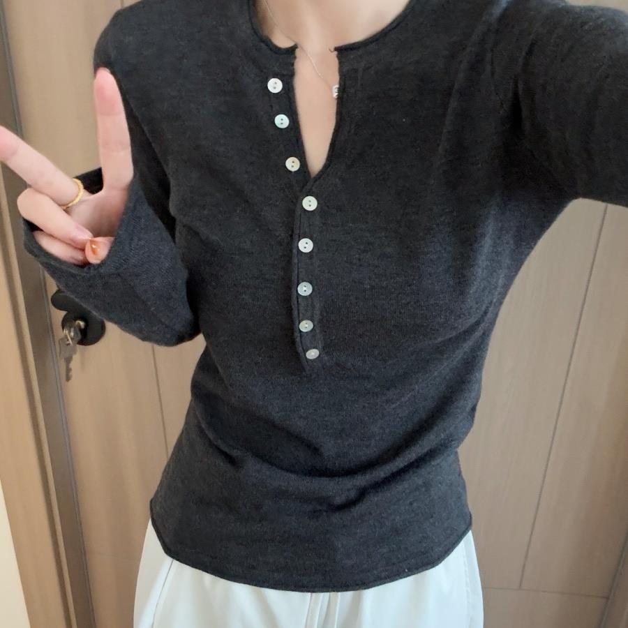 此外 纽扣半开领修身针织长袖女2025秋季新款弹力T恤打底衫上衣潮