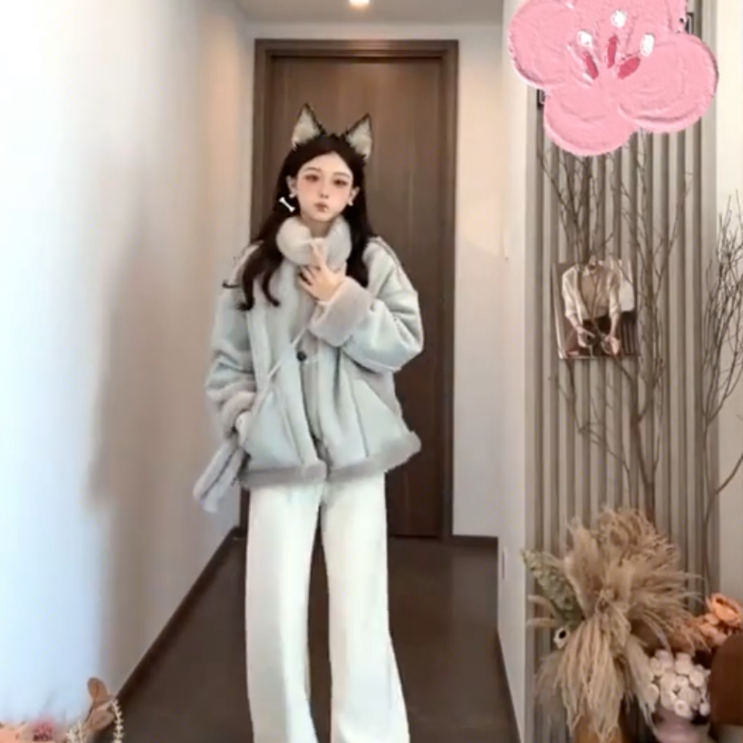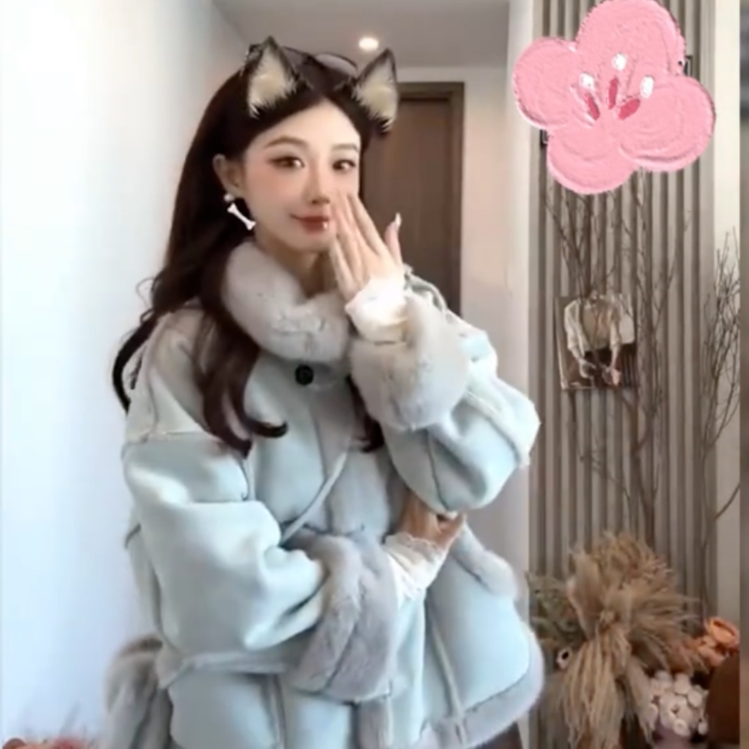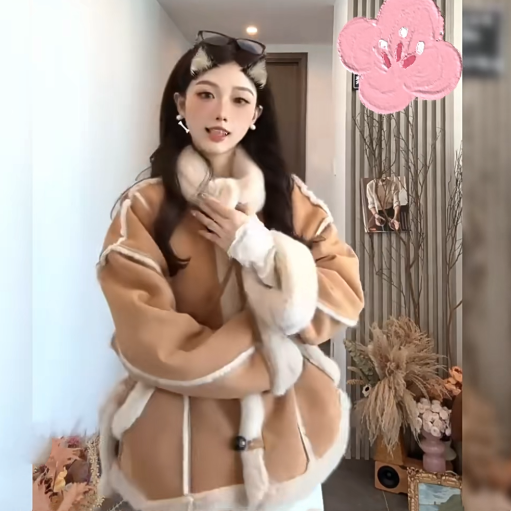 韩版高级感皮毛一体加厚外套女2024秋冬新款宽松小个子麂皮绒外套