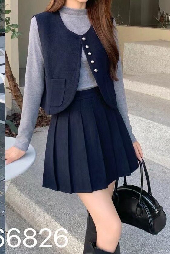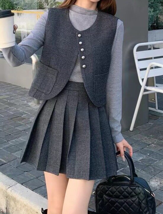首页> 女装> 66826秋冬新款韩版宽松显瘦百搭休闲马甲+体恤+百褶裙三件套女装