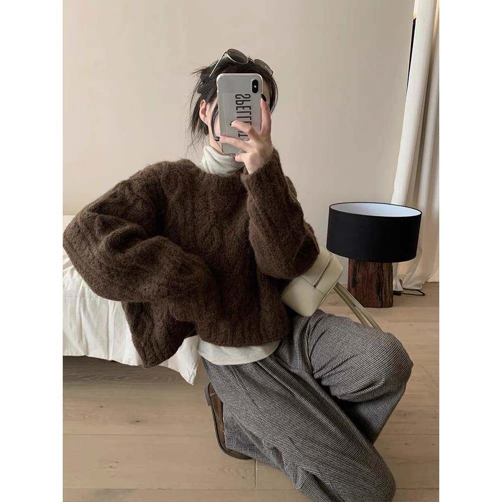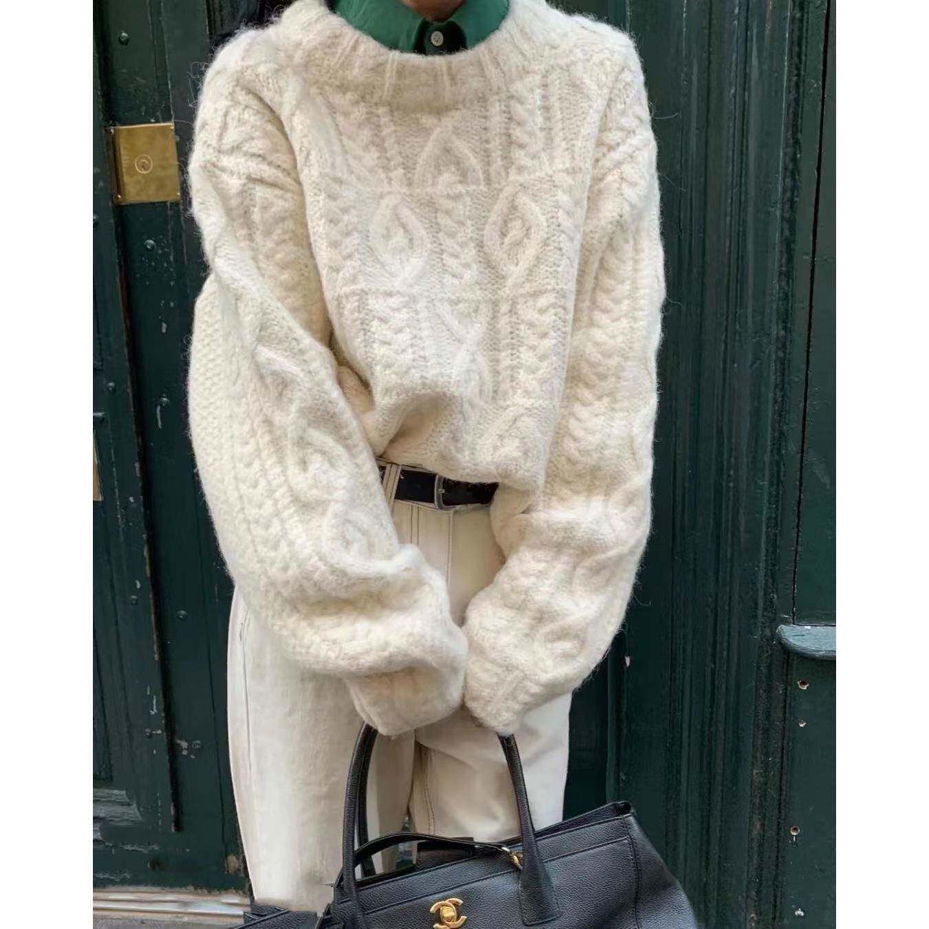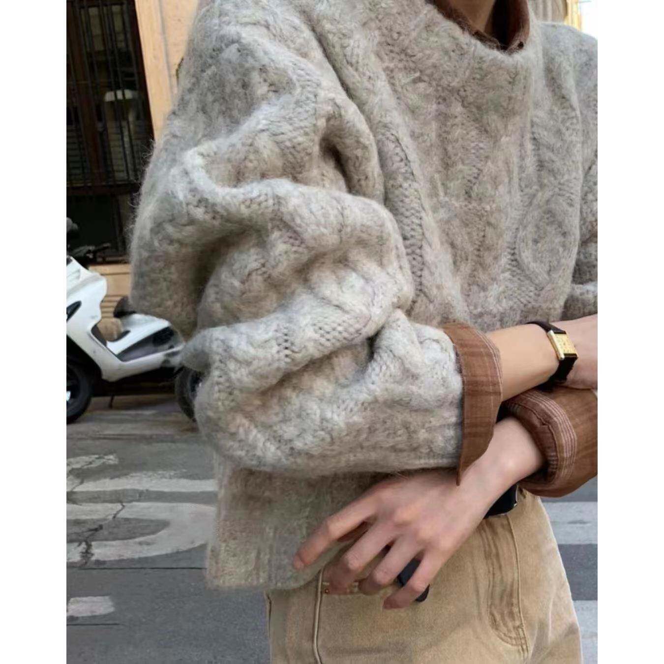 落日橘!秋冬高级感日系复古宽松慵懒风圆领粗毛线外穿麻花毛衣女