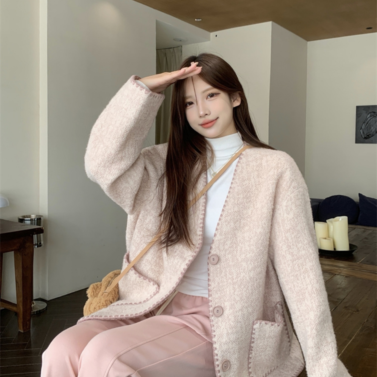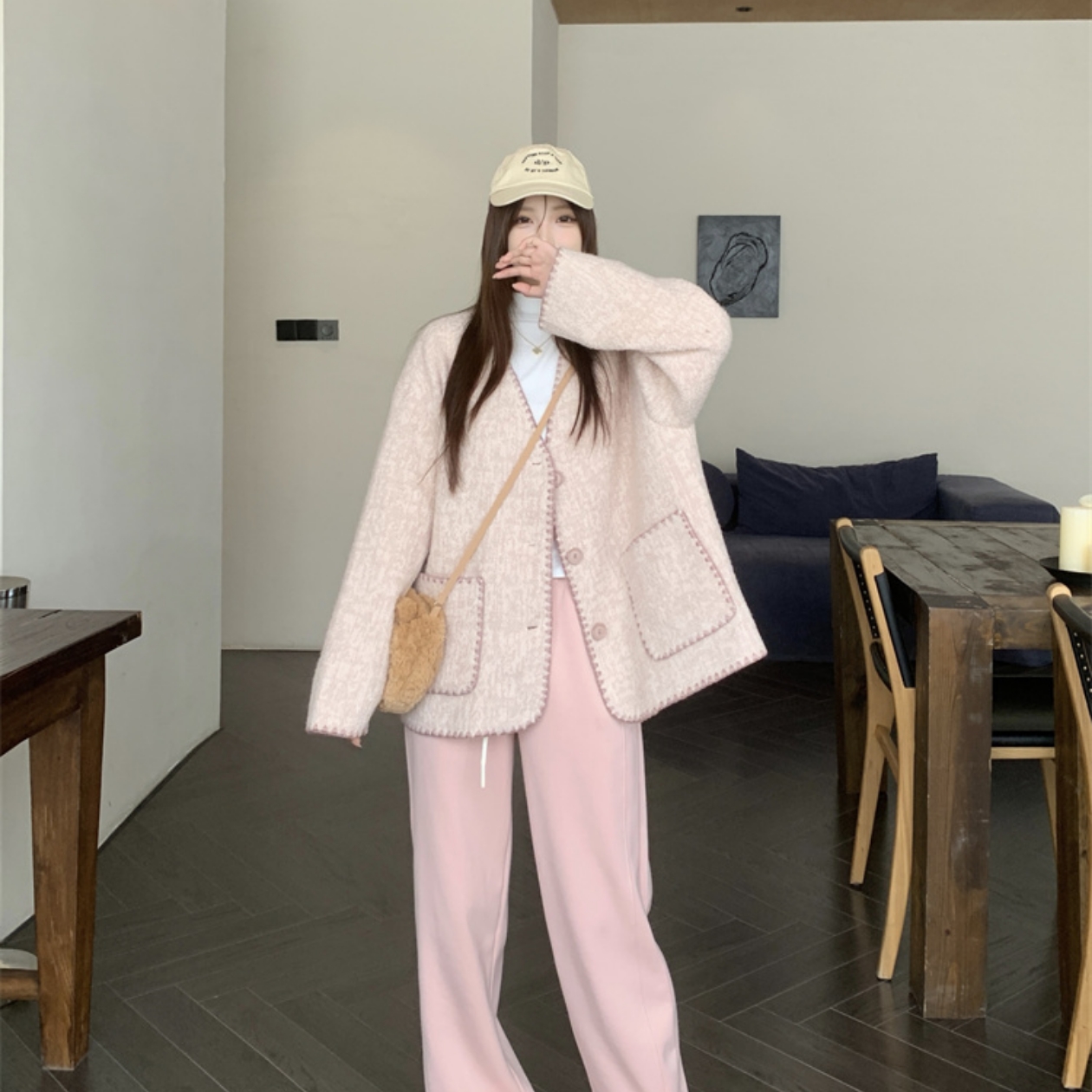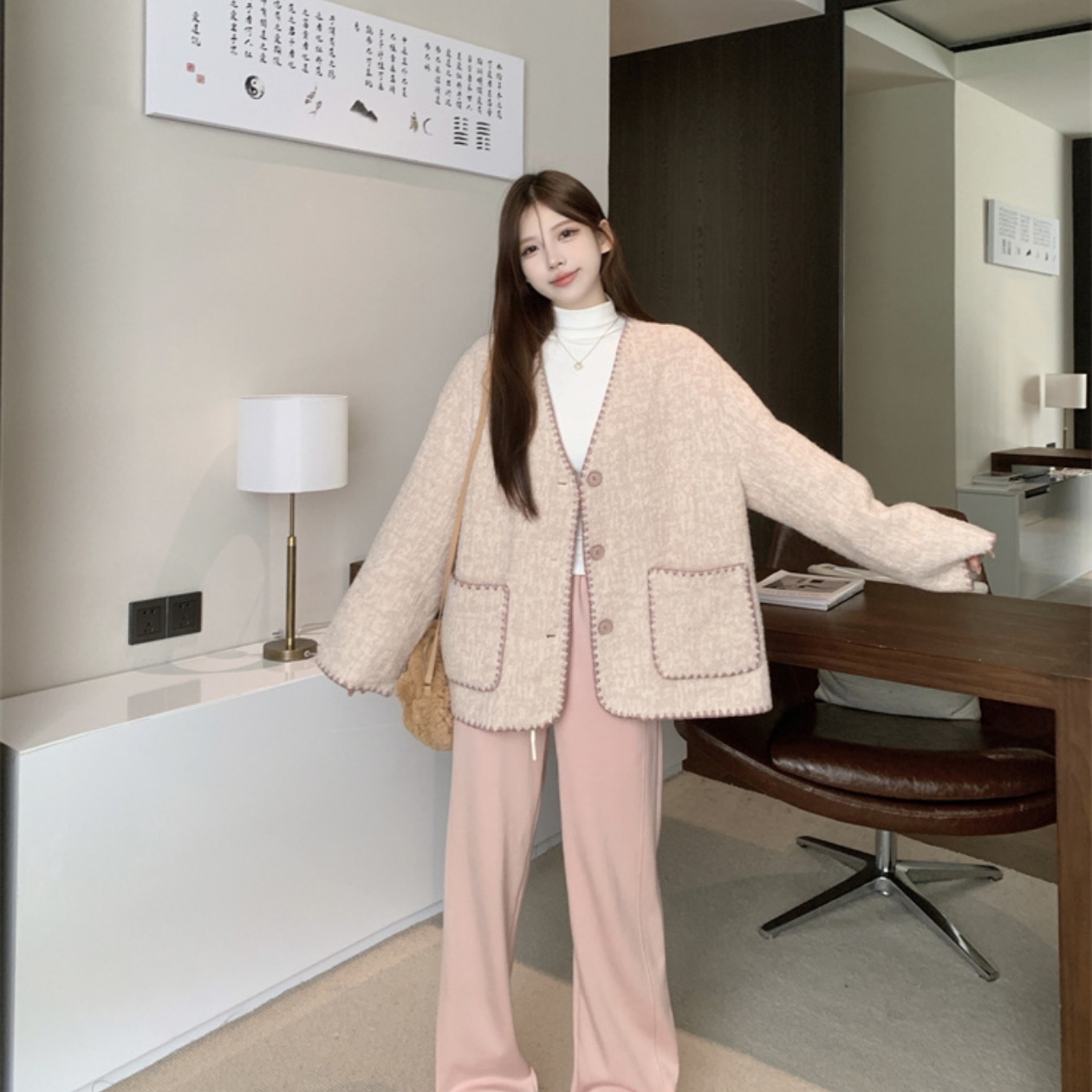 毛呢外套女秋冬新款韩版宽松百搭V领羊毛外衣