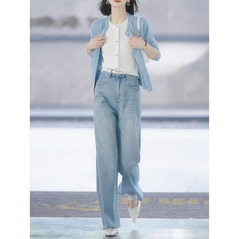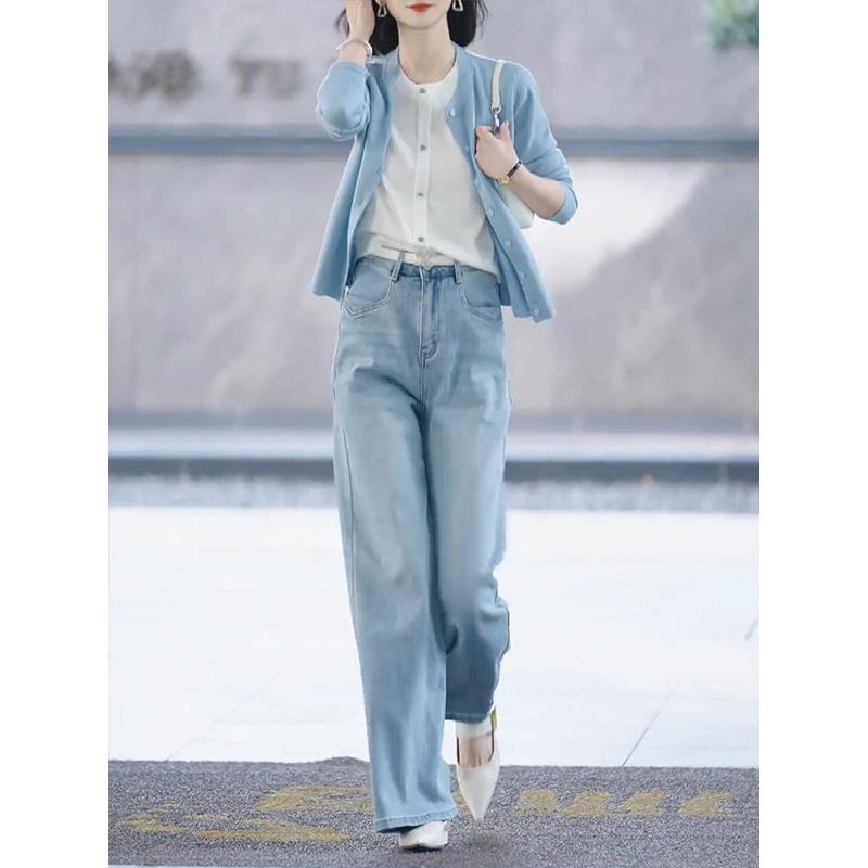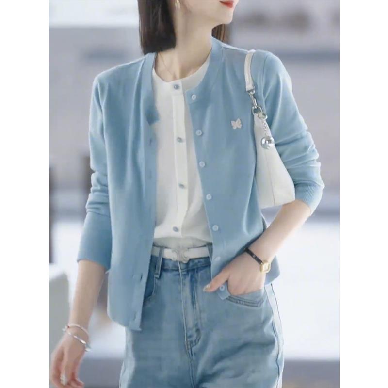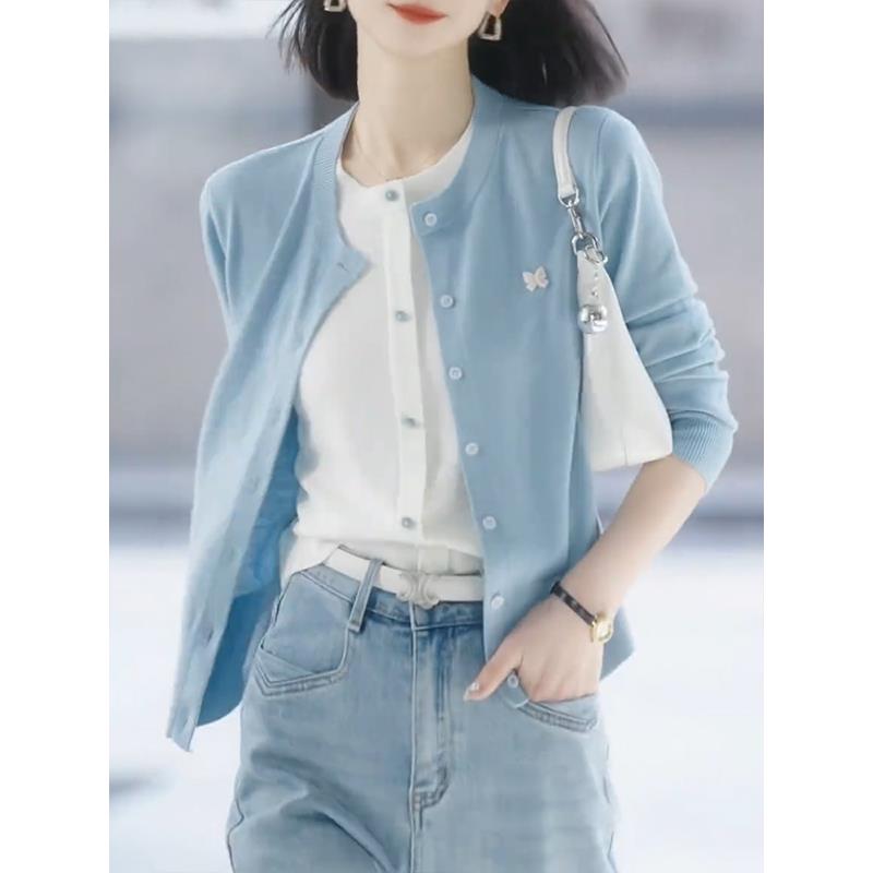 假两件蓝色针织开衫女2025年春季新款软糯百搭毛衣外套高级感上衣