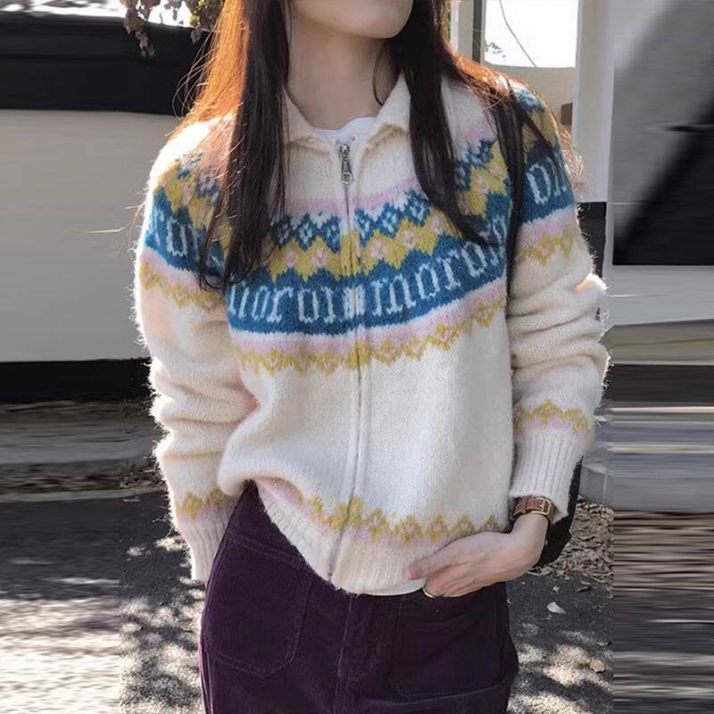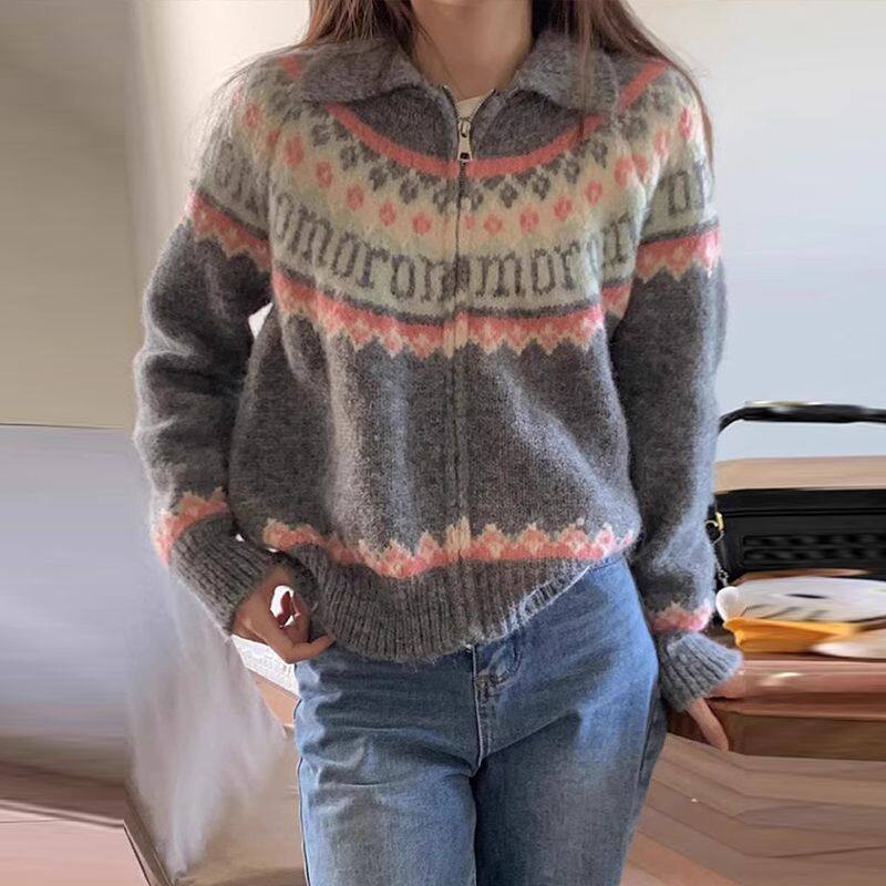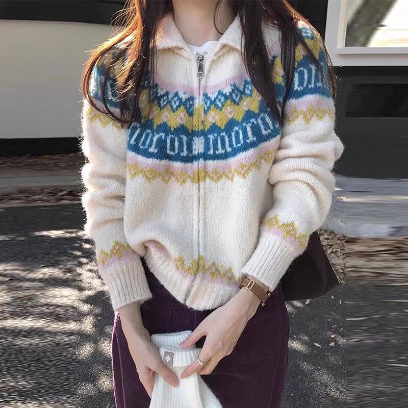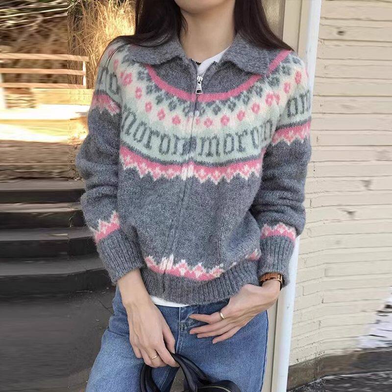 复古费尔岛2025提花针织衫外套女休闲慵懒风宽松显示百搭上衣