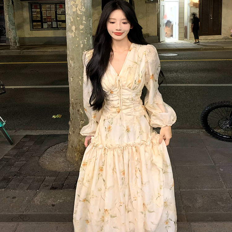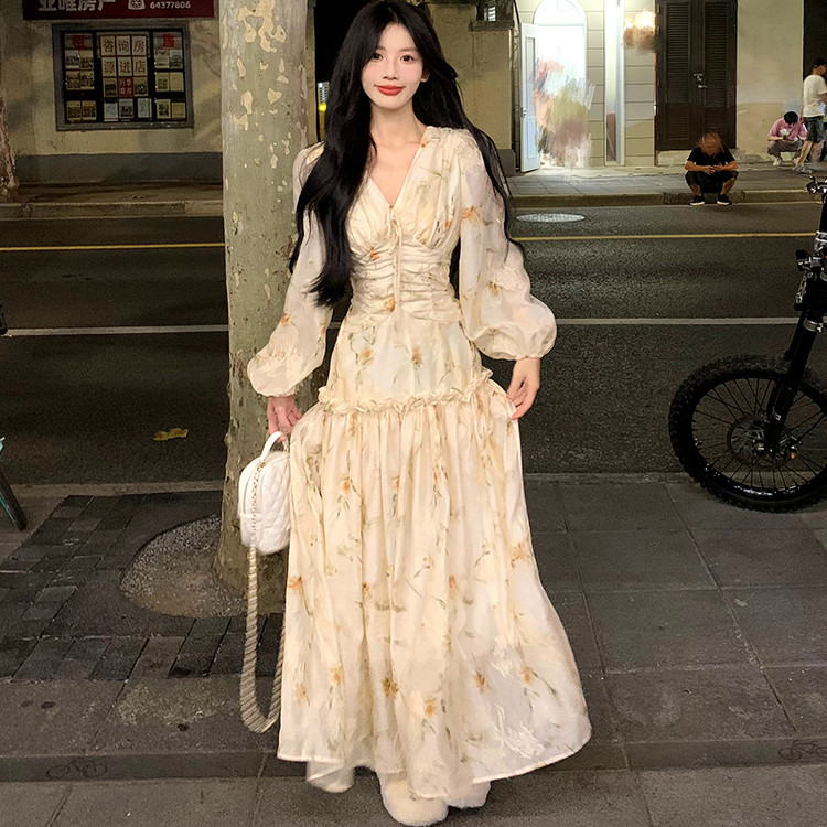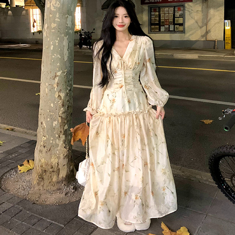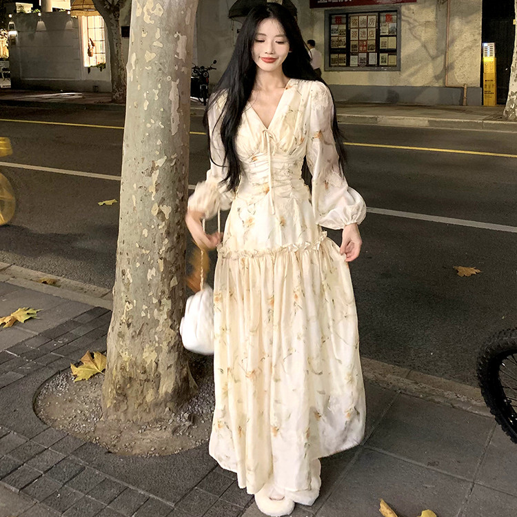 晚风秋日 法式优雅印花长袖连衣裙女秋季新款气质收腰显瘦长裙子
