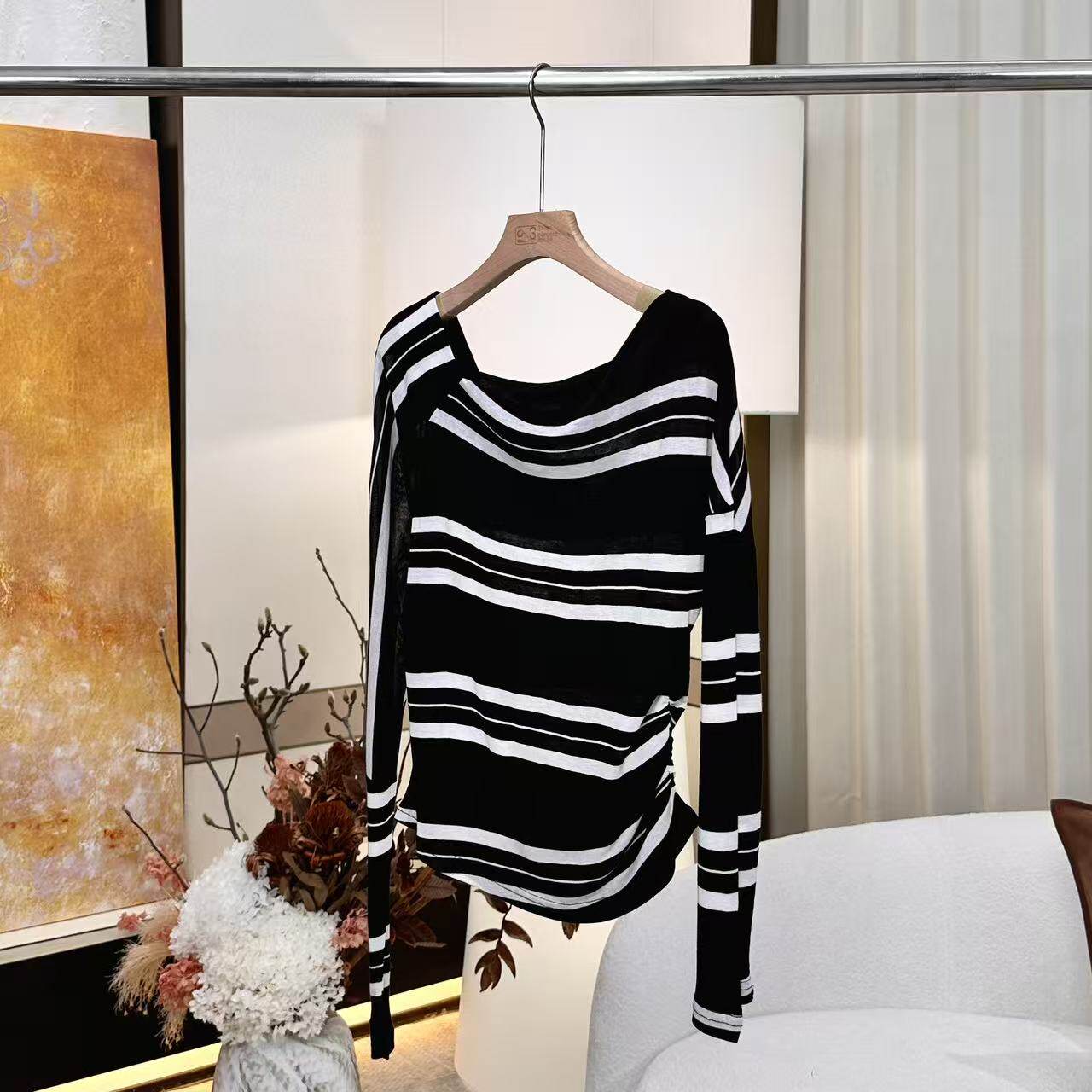 【妍妍】天丝/羊毛 超显瘦斜肩条纹上衣 ONKT156636232