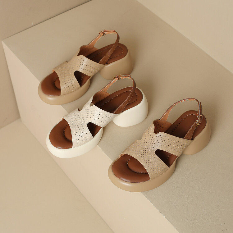 粗跟凉鞋女羊皮一字扣带踩屎感夏季新款镂空露趾百搭防水台罗马鞋