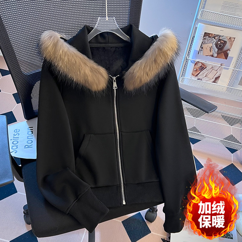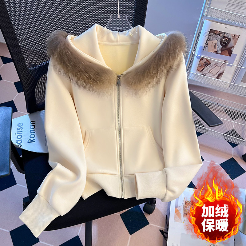 实拍美式复古可拆卸毛领连帽卫衣女2025冬新款显瘦开衫短款外套女
