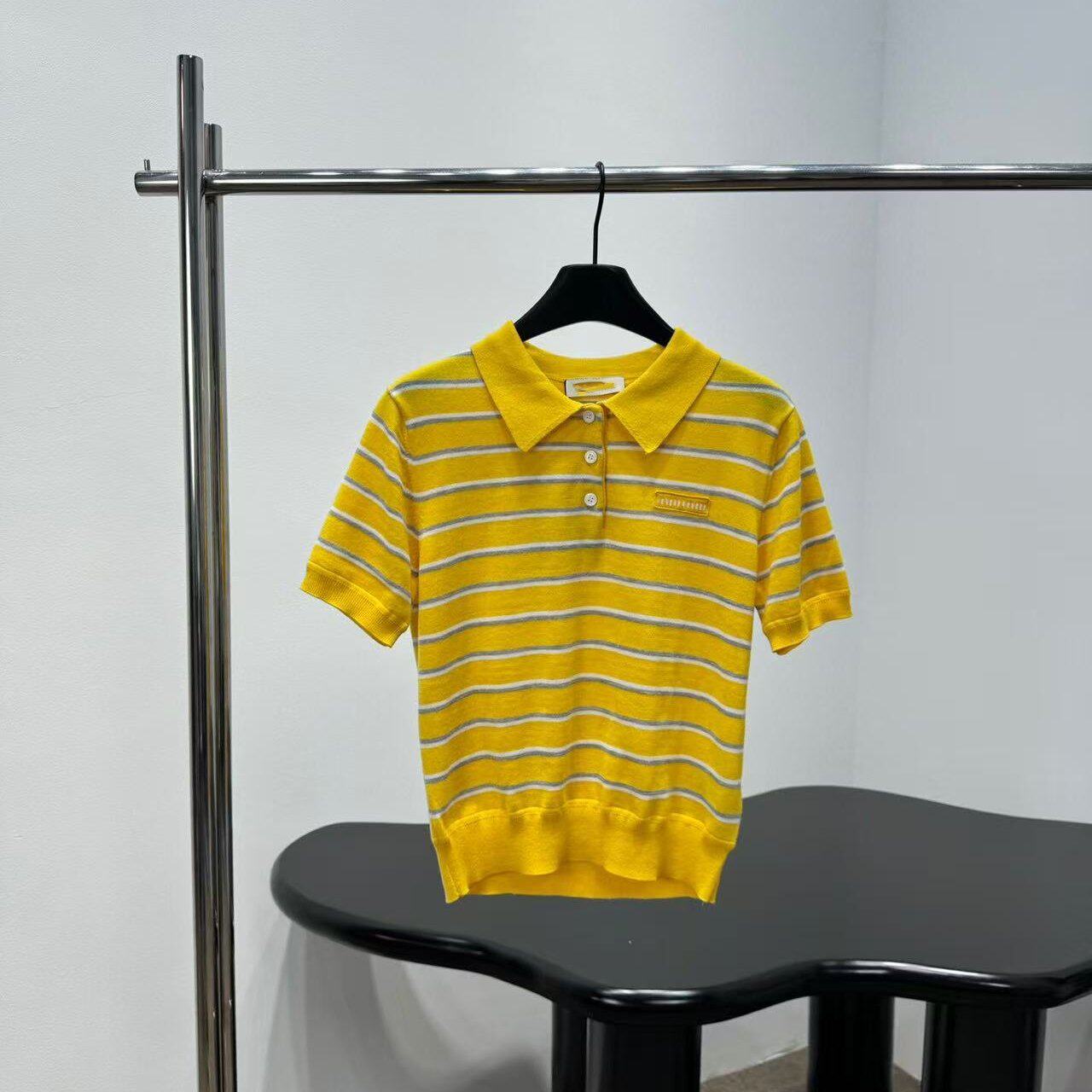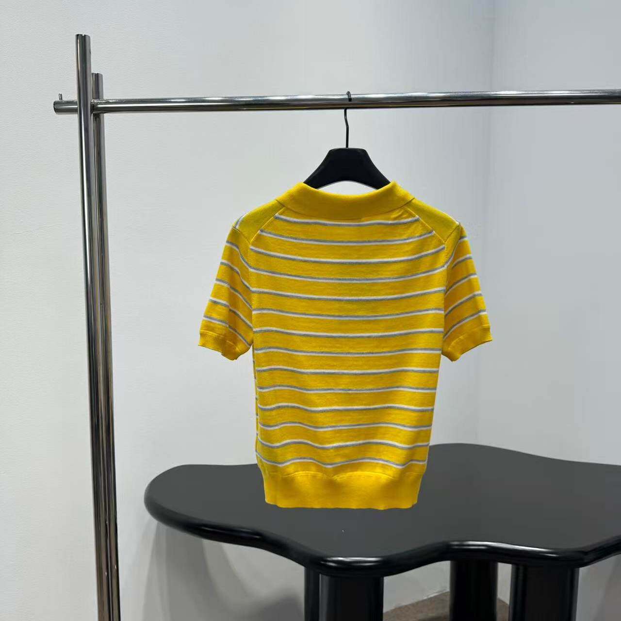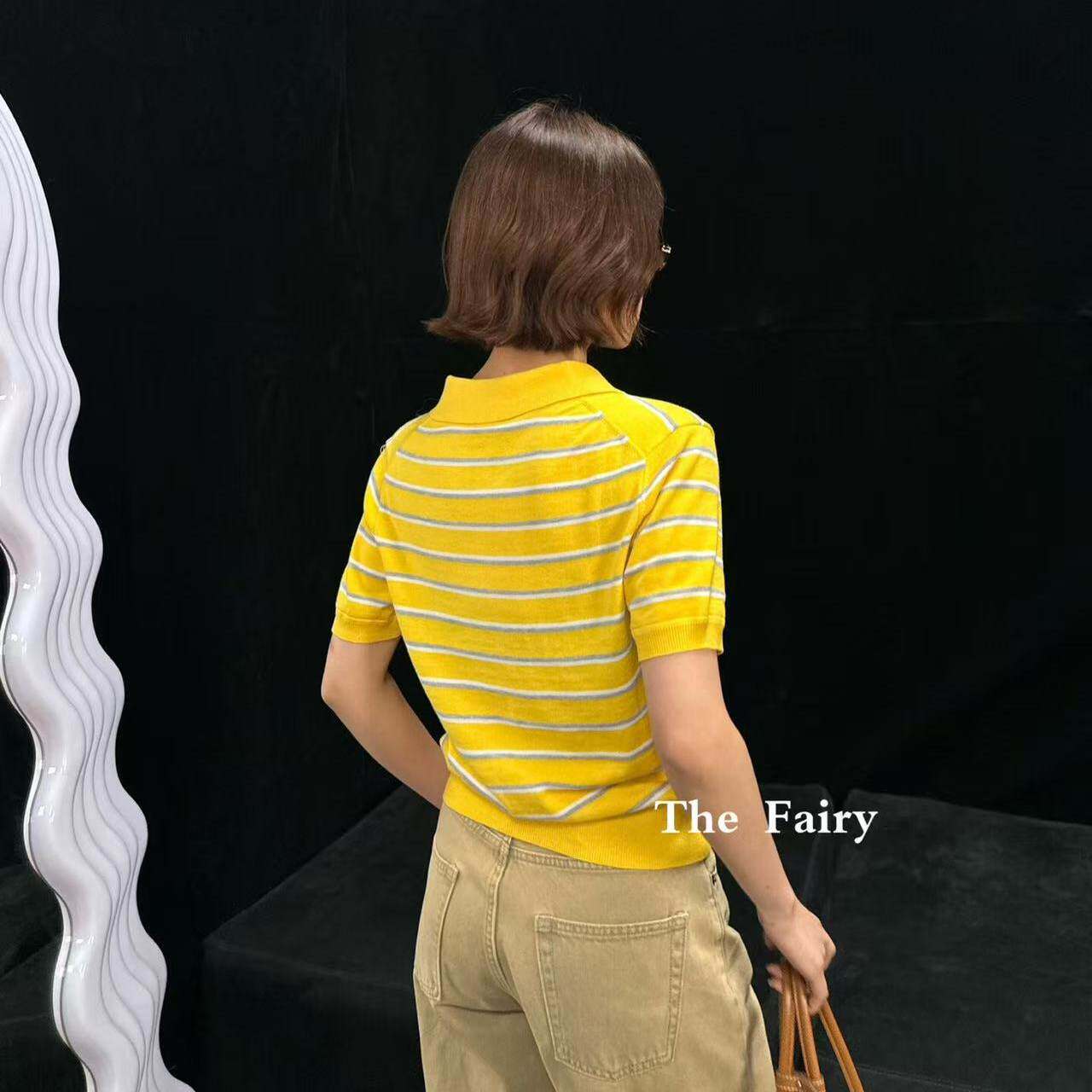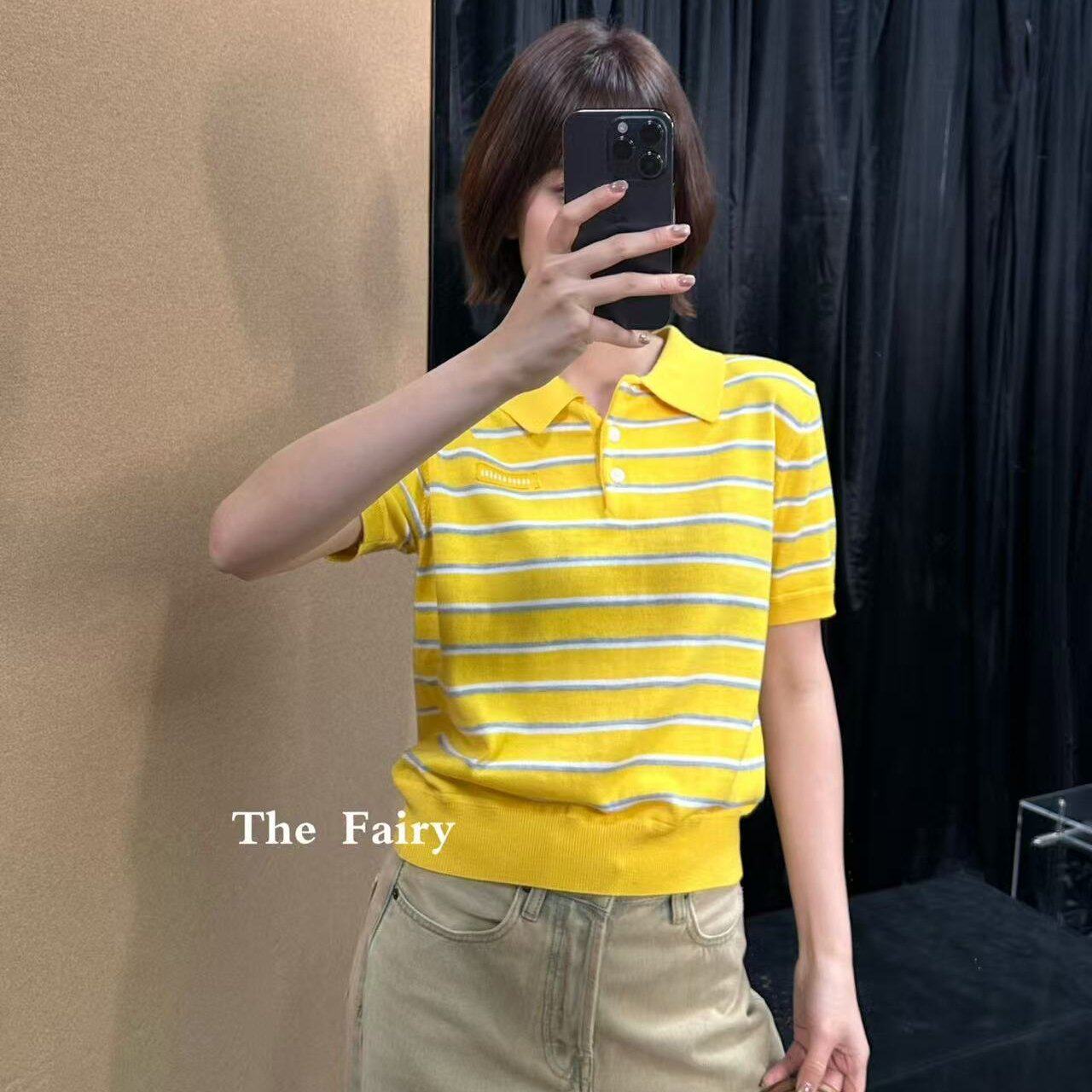 好漂亮黄色条纹翻领针织半袖打底衫女 2026年早春新款短上衣宽松