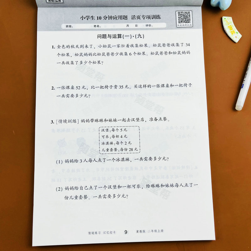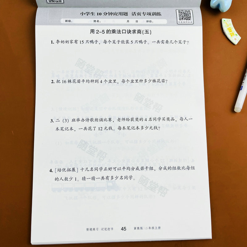 【随堂帮】冀教版二年级上册数学应用题卡活页练习册专项训练课本同步练习册每天10分钟认识乘法认识除法乘法口诀求商表内乘法除法