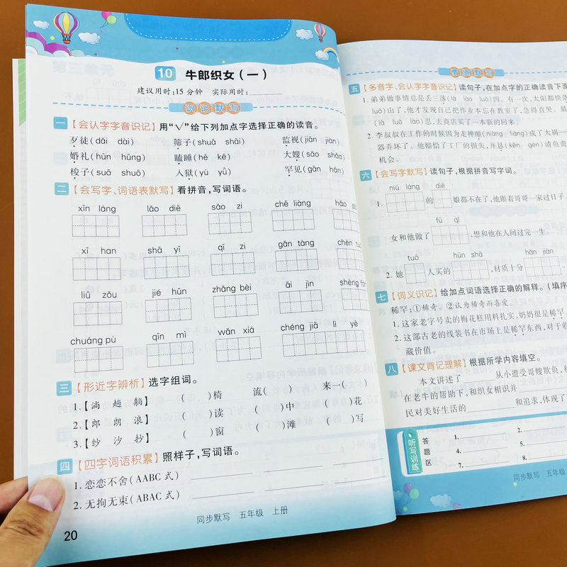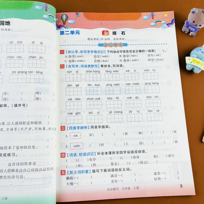 五年级上册语文同步默写人教版同步练习册看拼音写词语选择正确读音选字填空背诵默写听写训练生字组词造句词语积累同音字形近字
