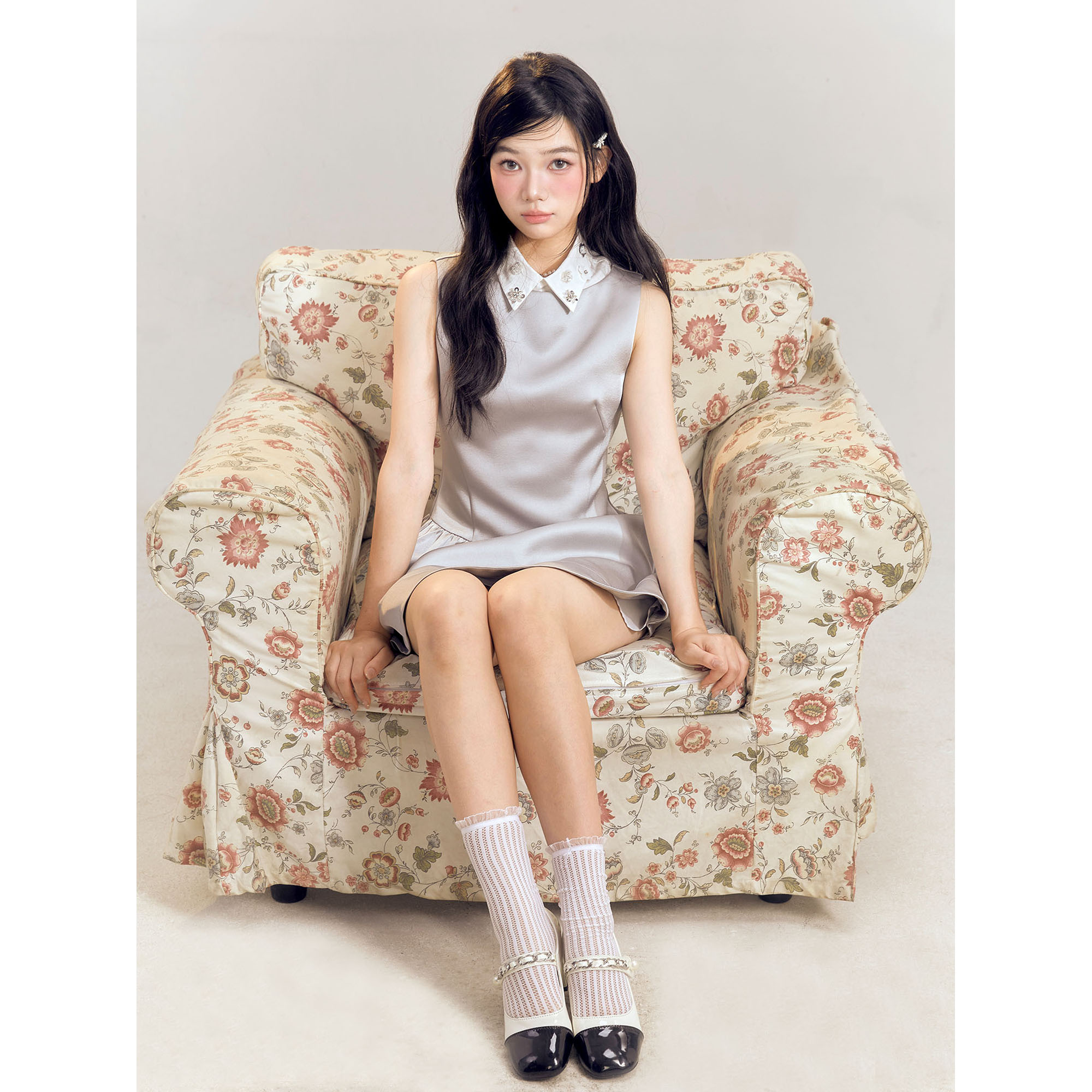 AlinsHouse千金感银色缎面无袖连衣裙钉珠褶皱收腰设计显瘦气质裙