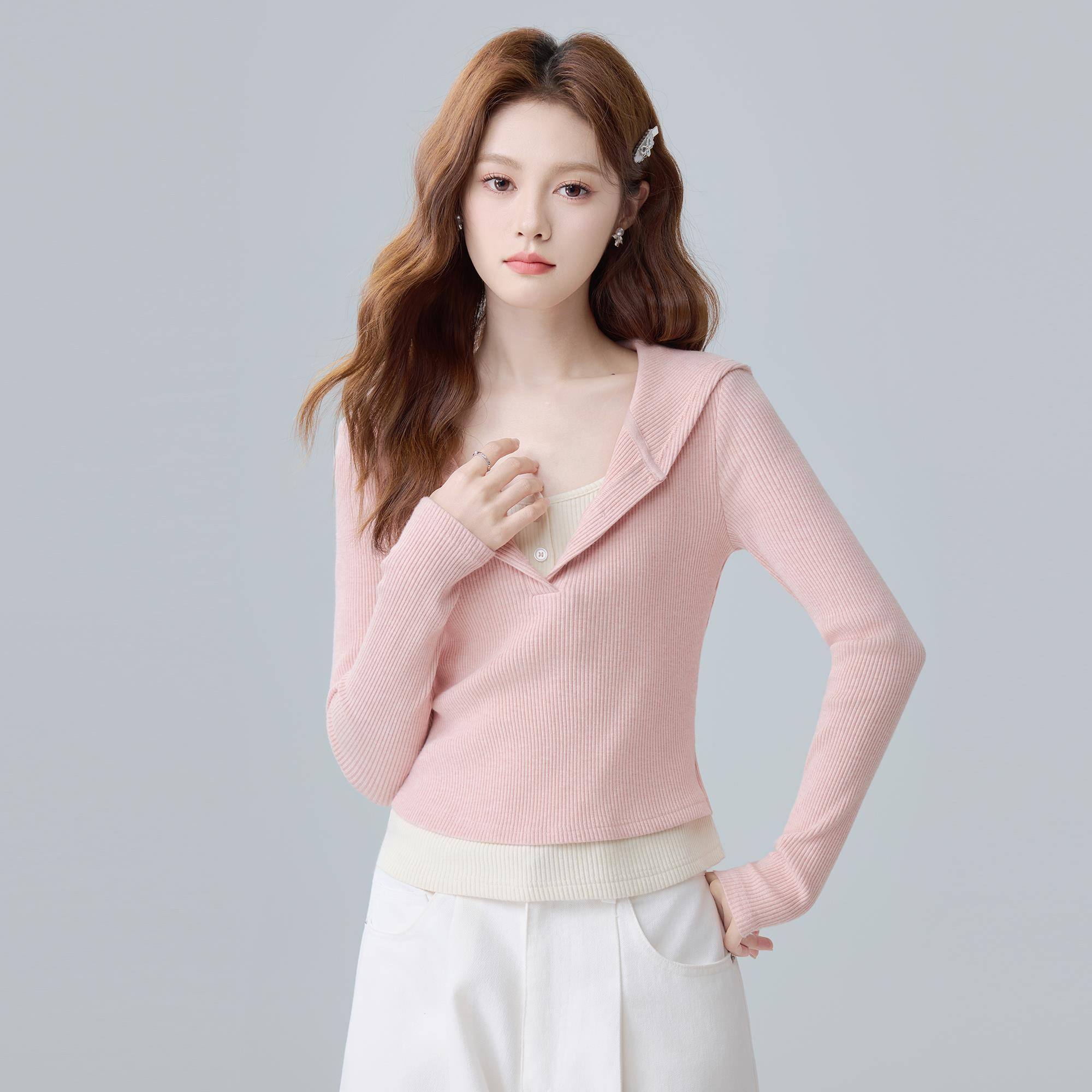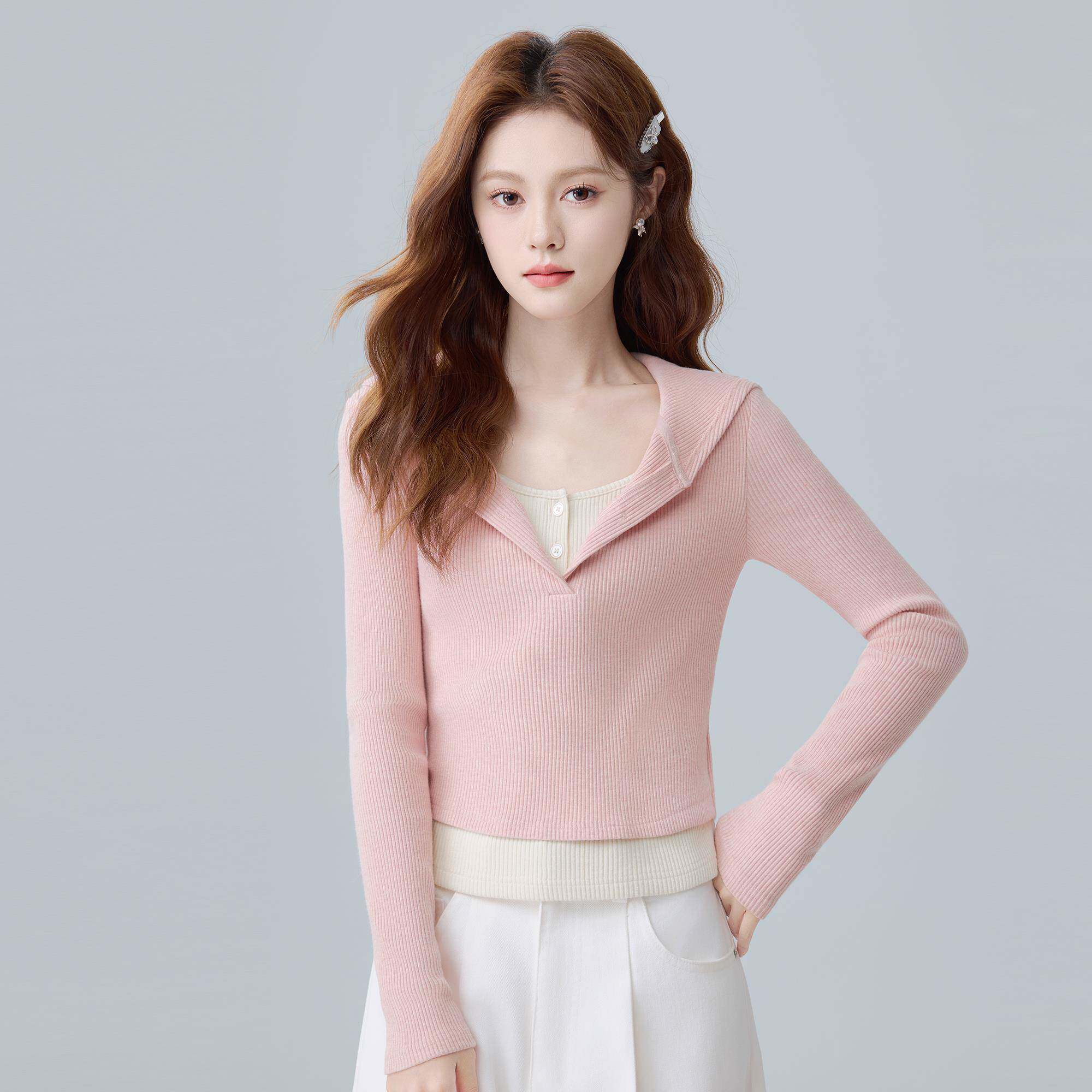 粉色连帽长袖T恤女2025秋季拼接假两件收腰显瘦内搭打底卫衣上衣