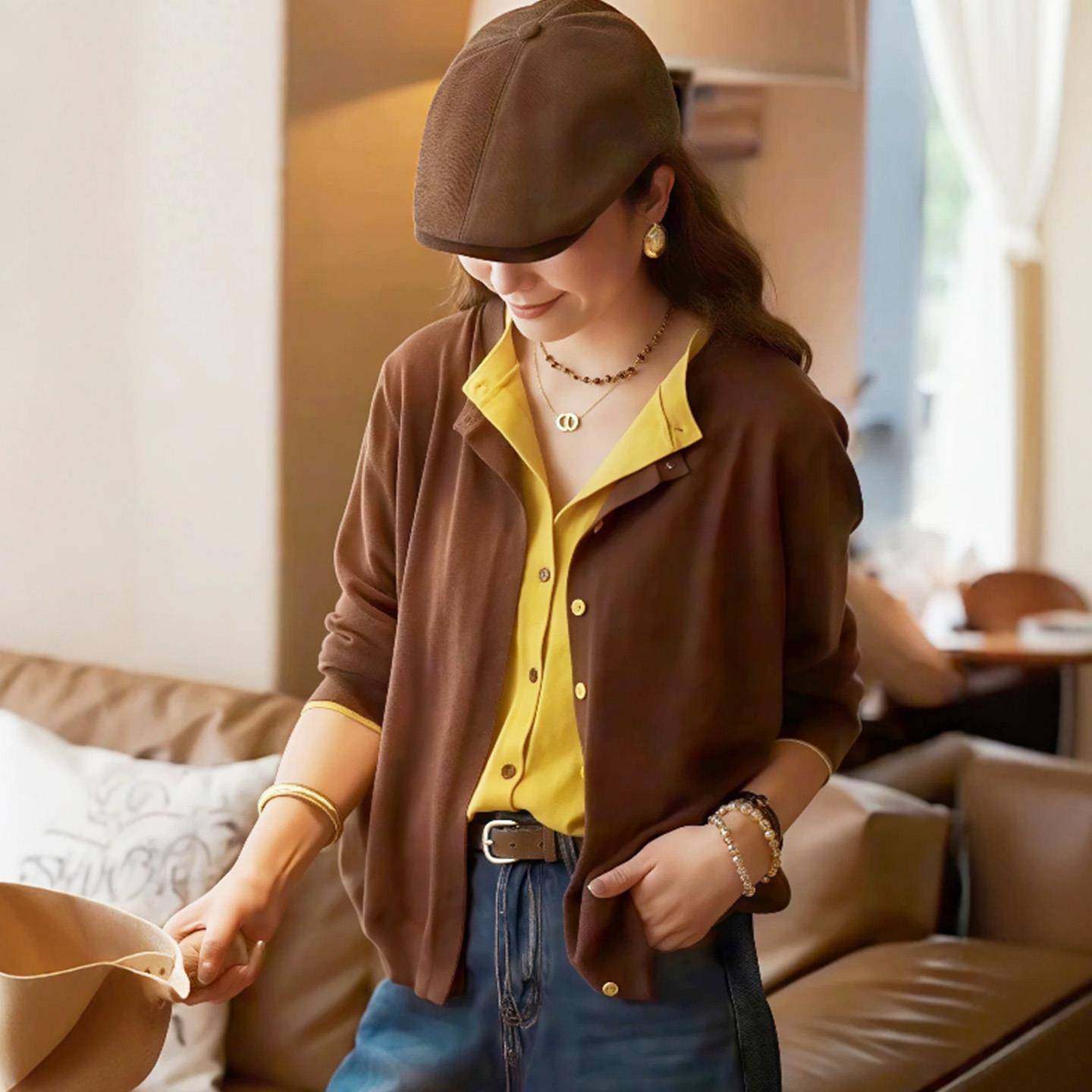 法式复古撞色长袖针织假两件女秋冬别致绝美时尚穿搭宽松外搭上衣