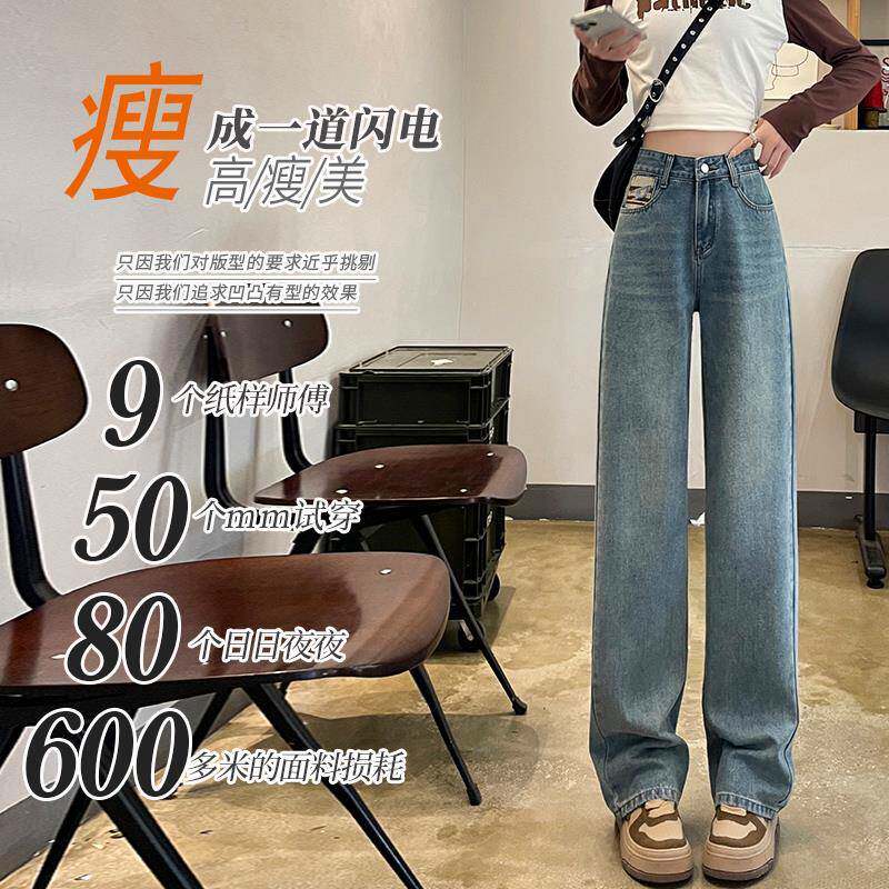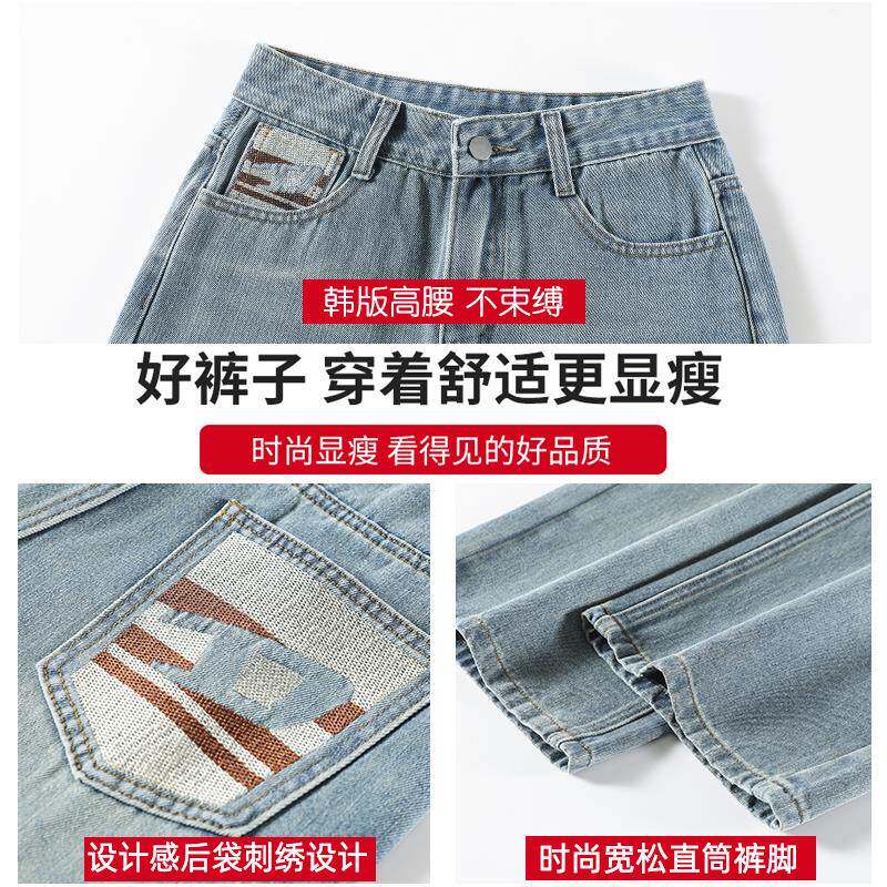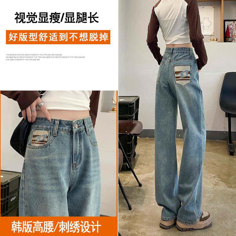 浅色刺绣窄版阔腿牛仔裤女秋季2025年新款小个子复古拖地直筒裤子