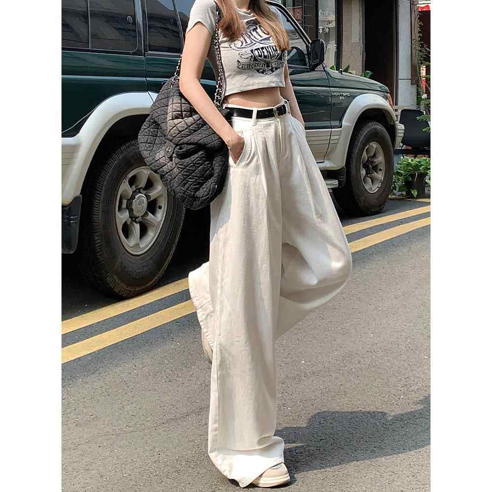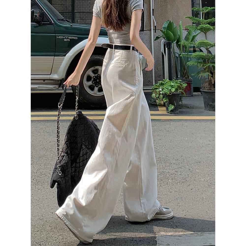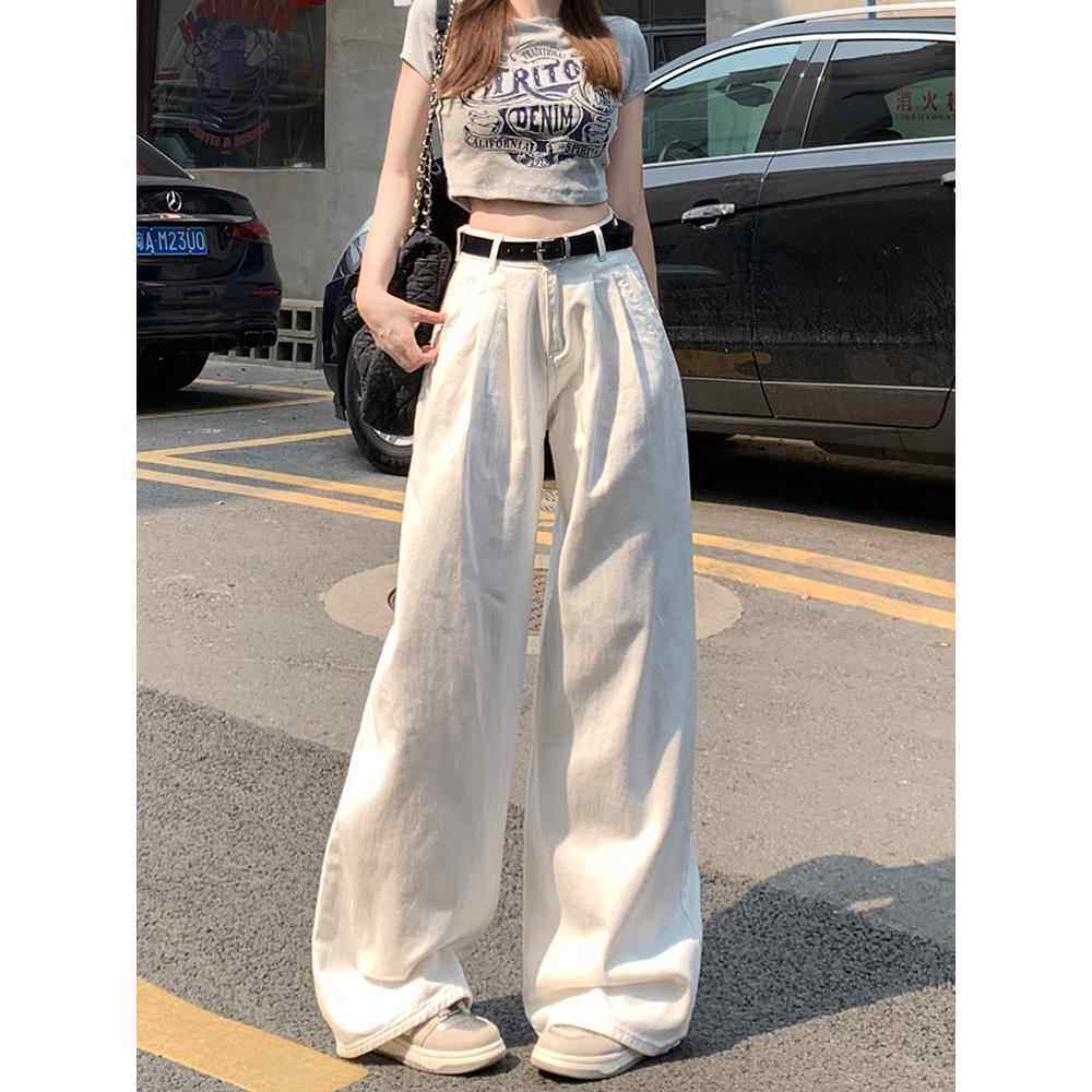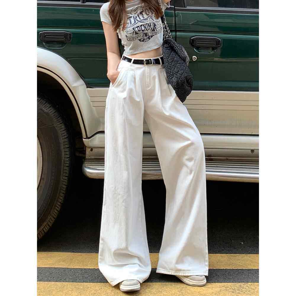 美式白色阔腿牛仔裤女2025秋新款高腰显瘦宽松褶皱慵懒垂感直筒裤