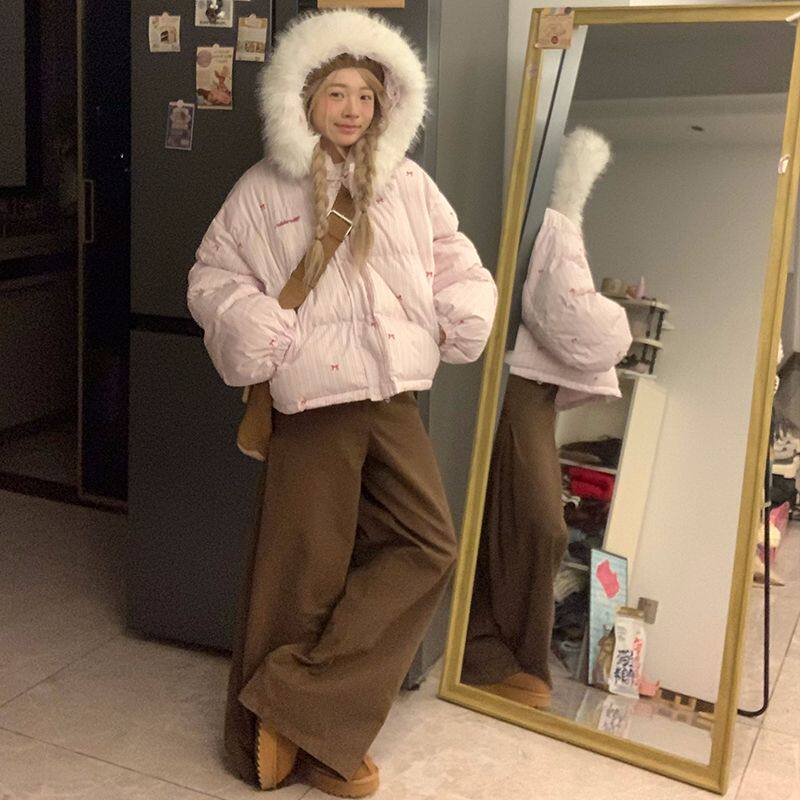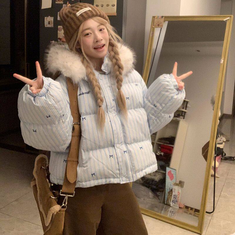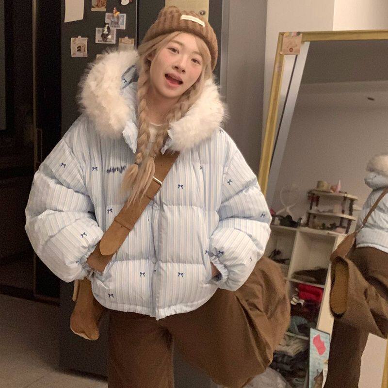 网图美式设计感条纹蝴蝶结毛领连帽棉服外套冬季加厚保暖棉衣女