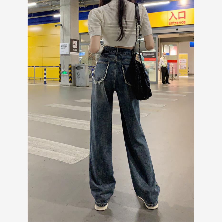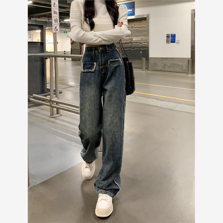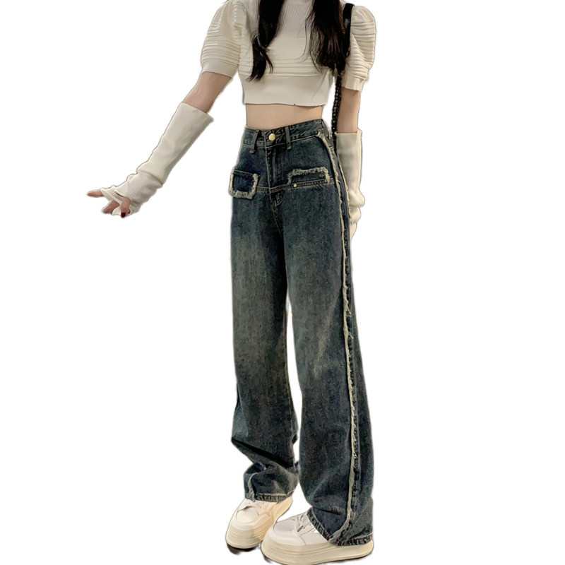 设计感毛边牛仔裤女春秋新款大尺码胖mm高腰显瘦百搭阔腿直筒拖地