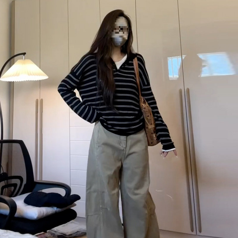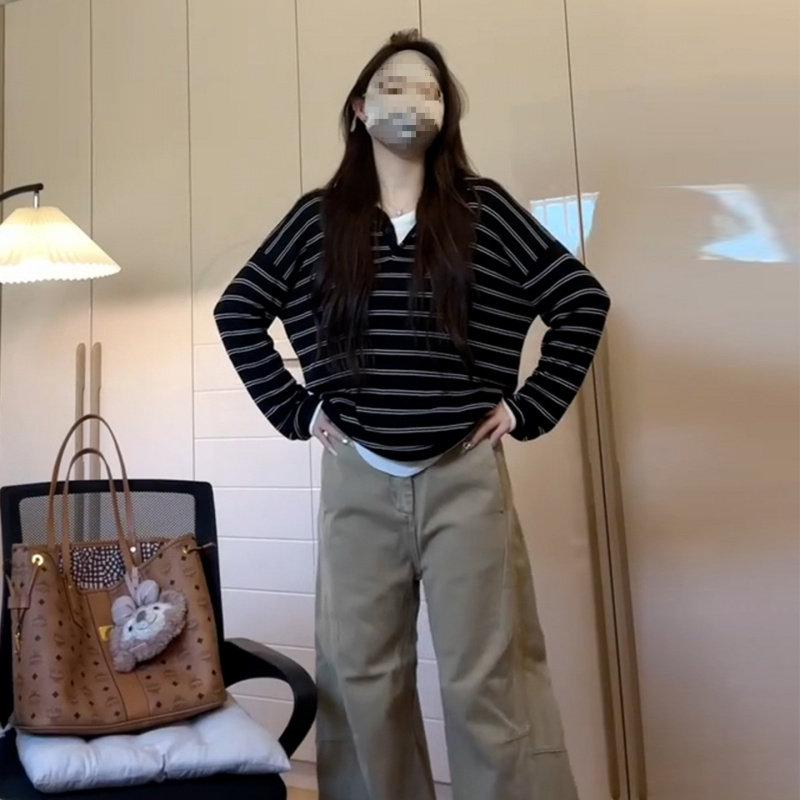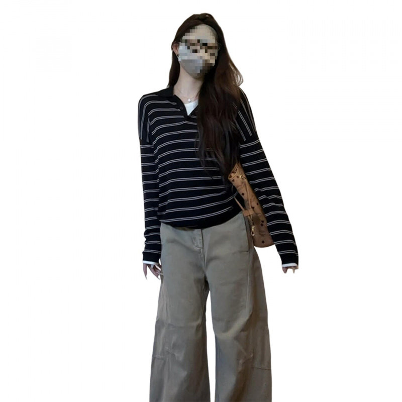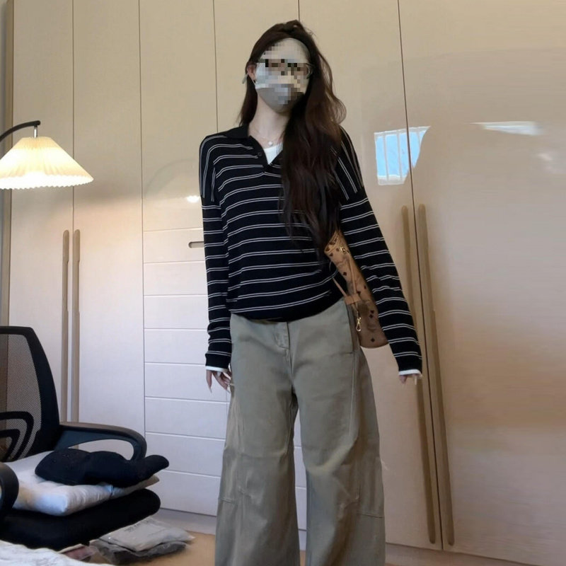 早秋季长袖t恤女2025新款设计感韩系慵懒黑白条纹针织polo衫上衣