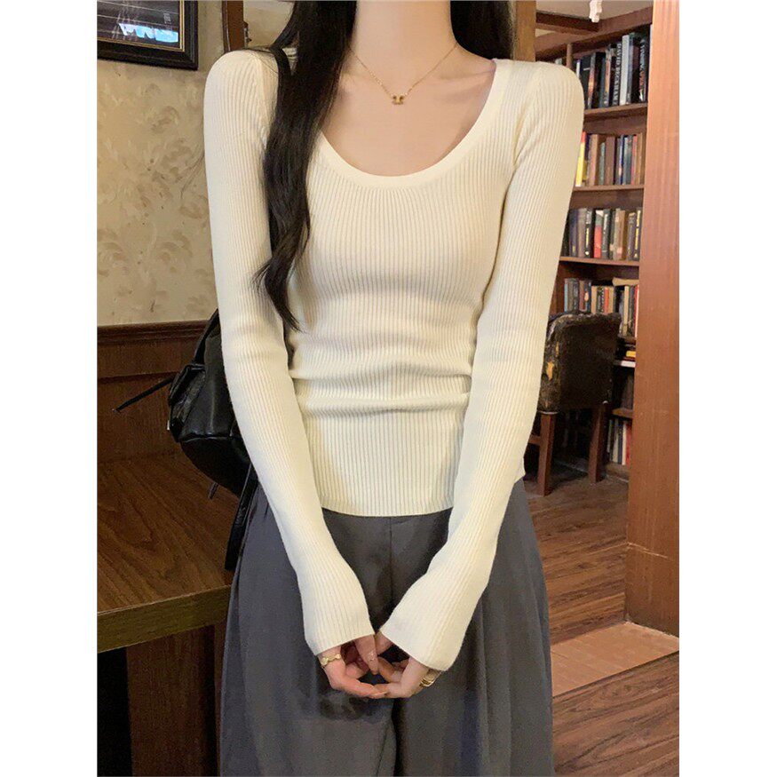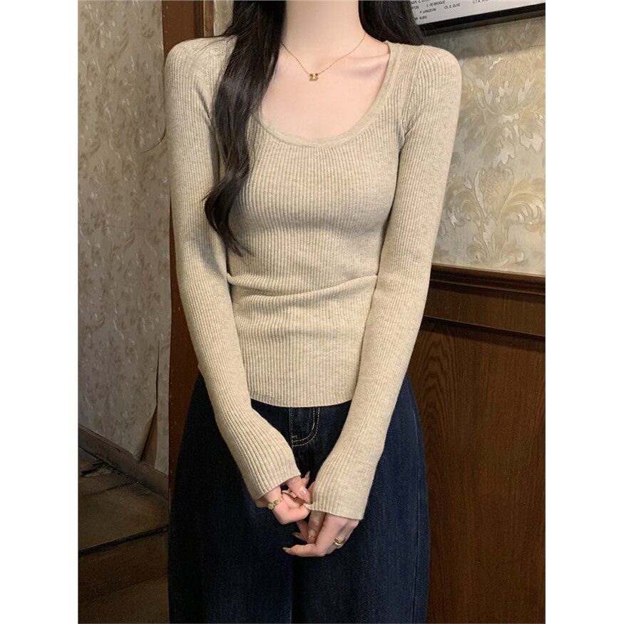 燕麦色U领坑条毛衣针织衫女秋冬时髦正肩长袖打底衫修身百搭上衣