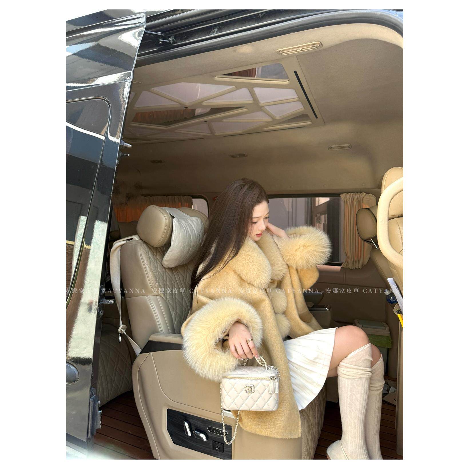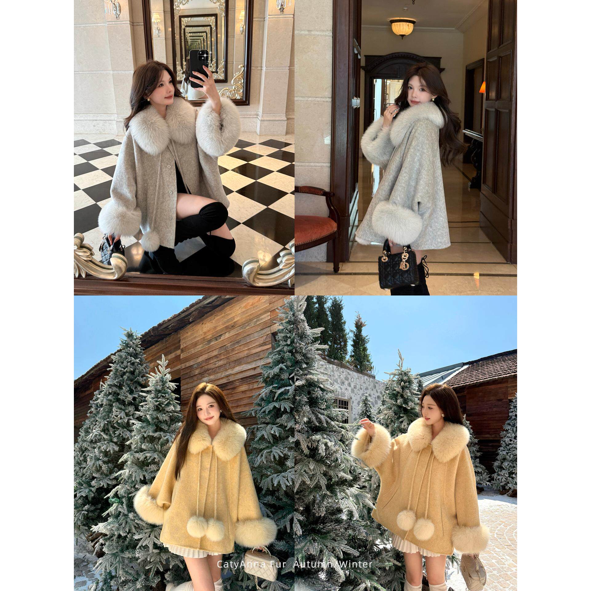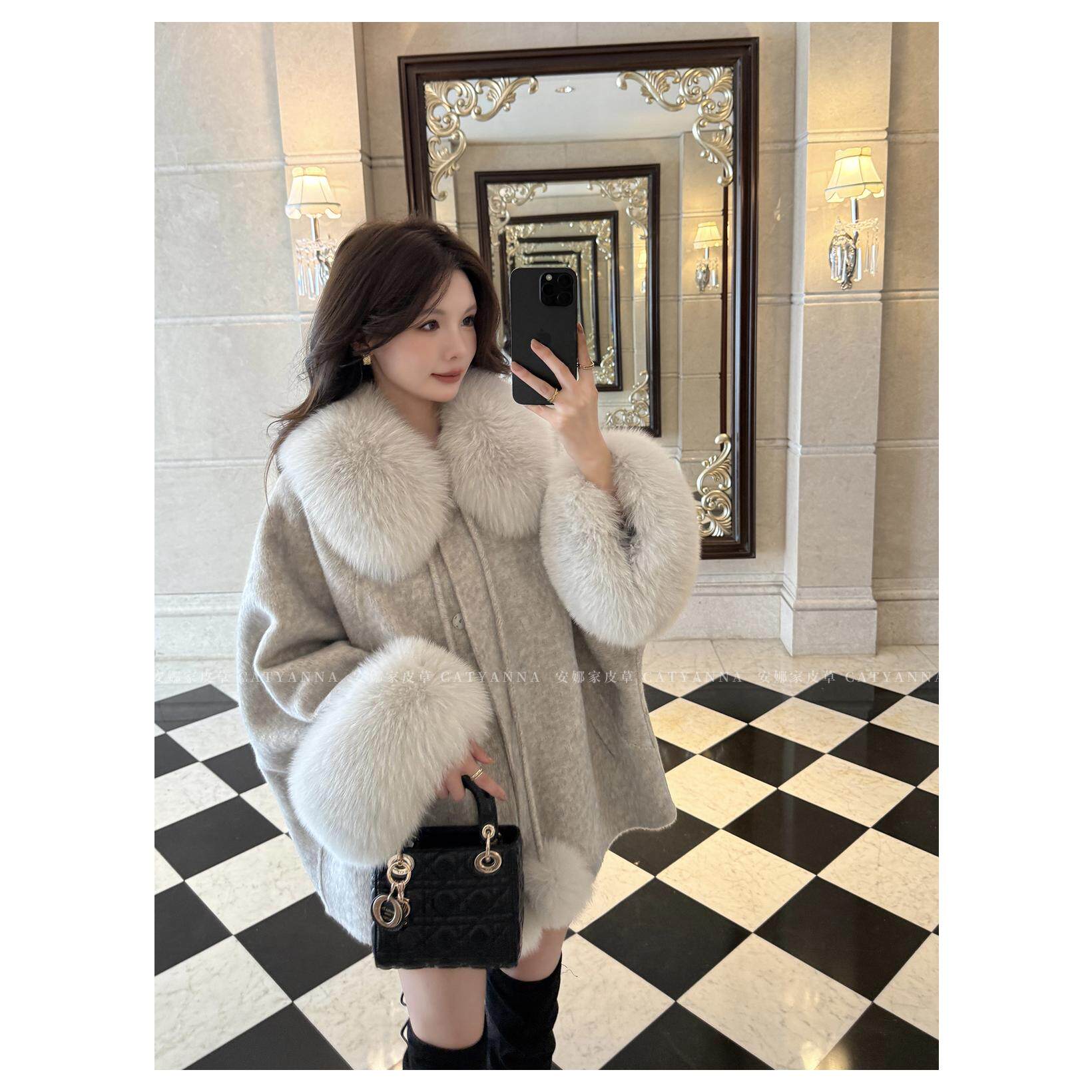 流光晚宴狐狸毛领宽松斗篷羊毛大衣女慵懒双面呢子袖口毛外套