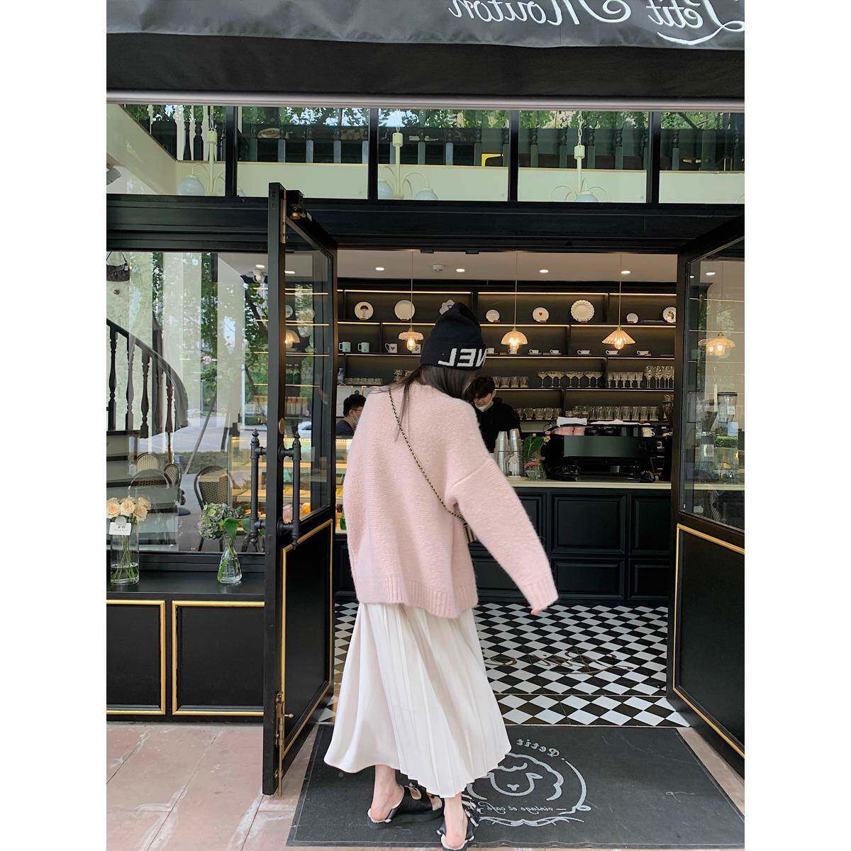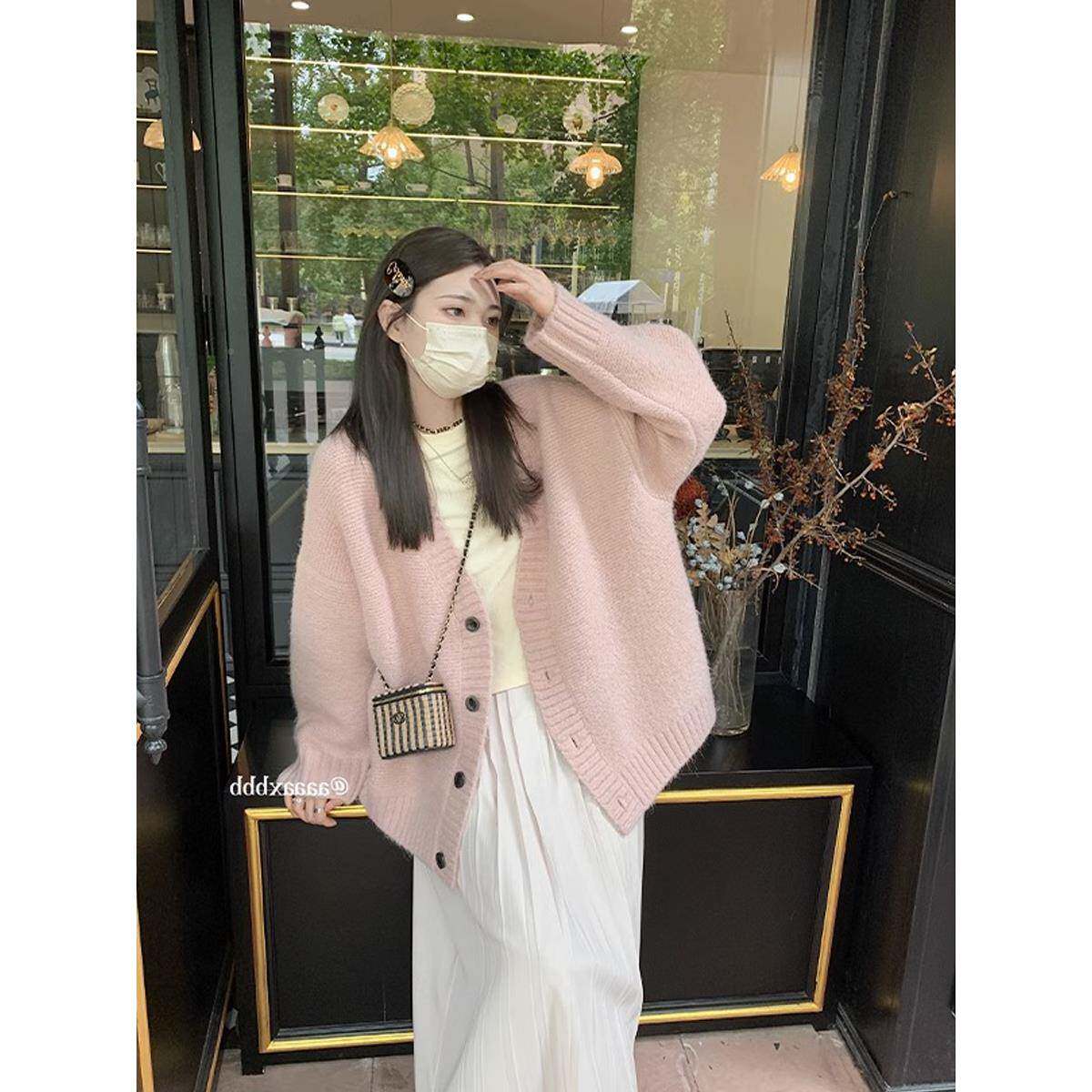 很仙的开粉色V领软糯毛衣套女秋冬加厚宽松慵C0036外中懒风长款针