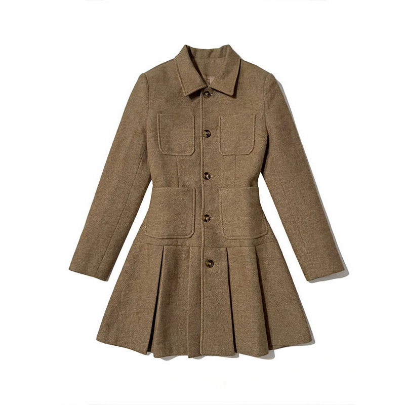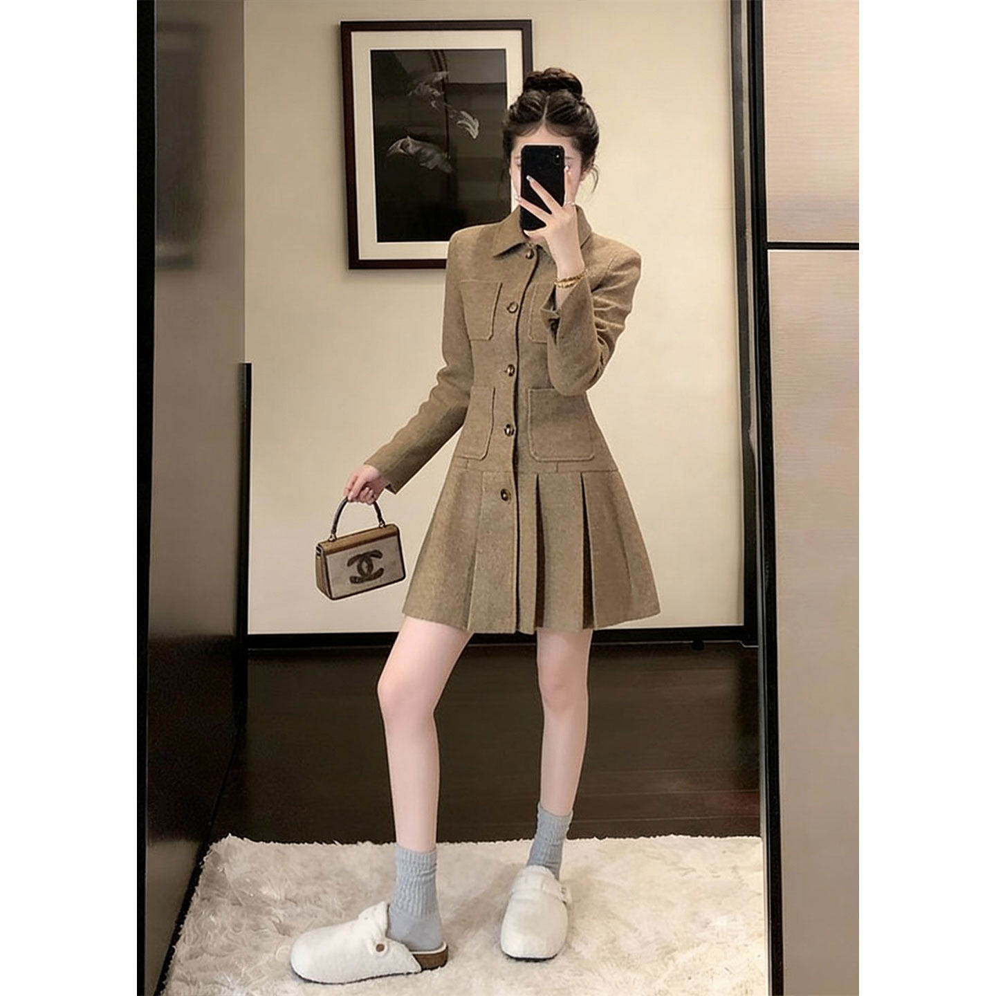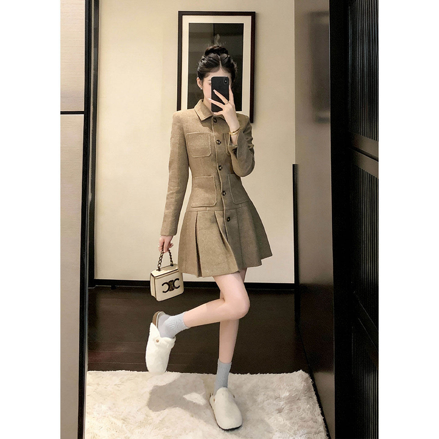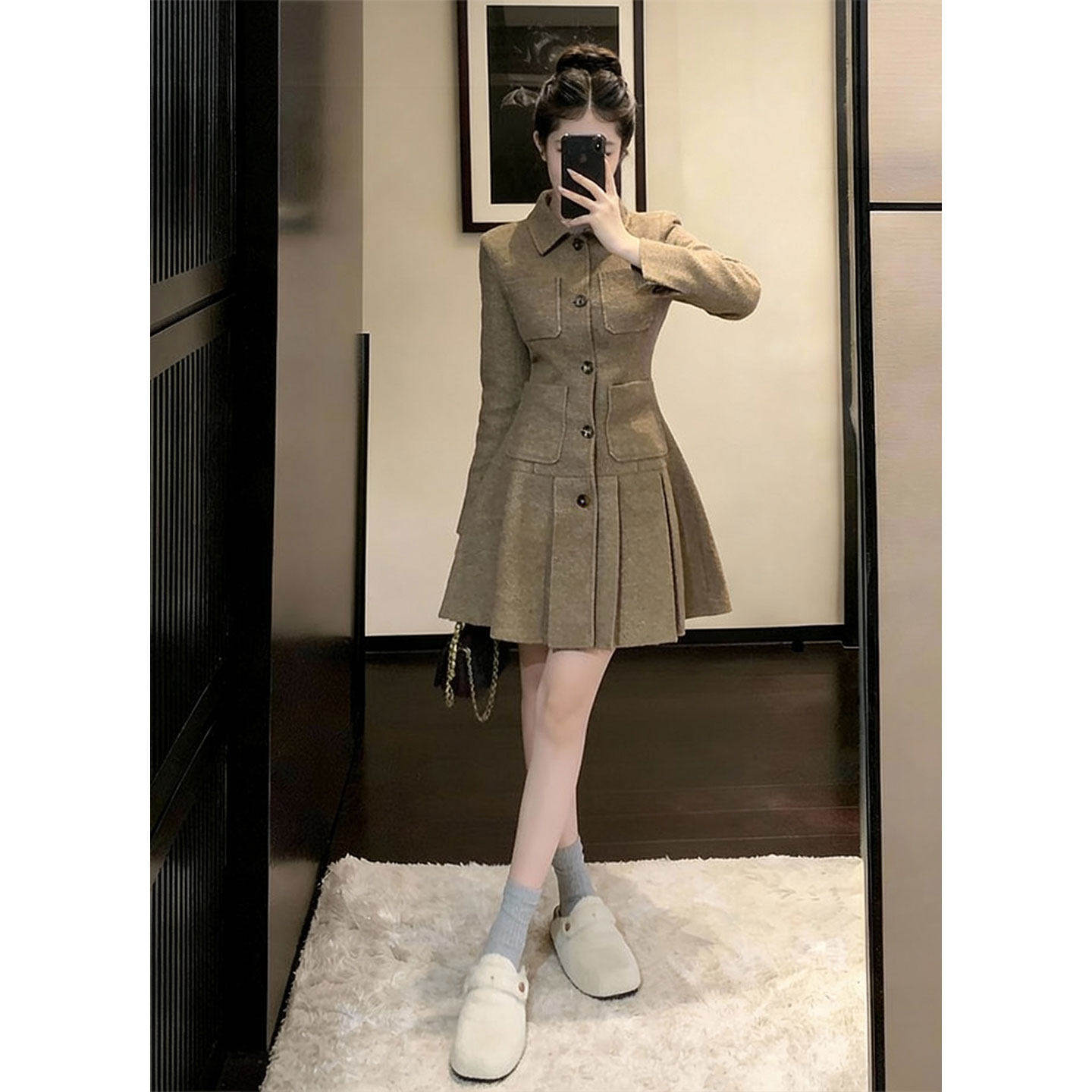 高智感穿搭感小香风漂亮独特收腰棕色百褶毛呢连衣裙子女初春