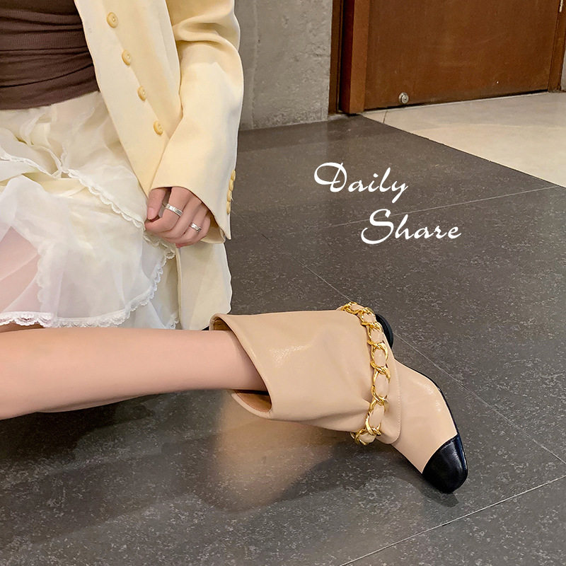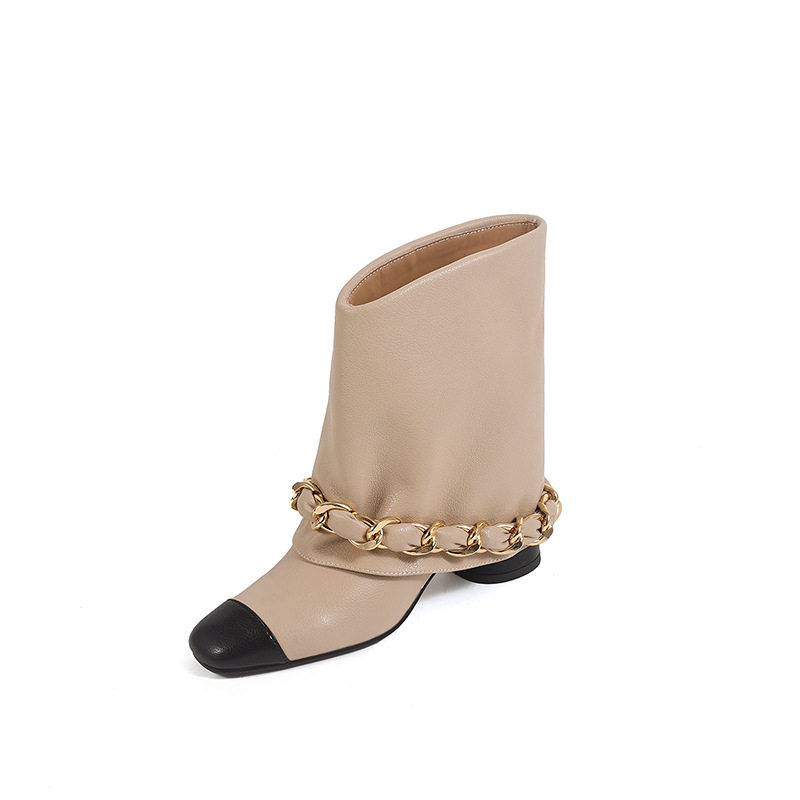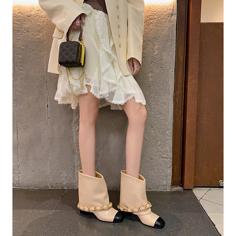 博主推荐~真皮法式小香风方头粗跟链条编织裤管靴巨好看短靴女