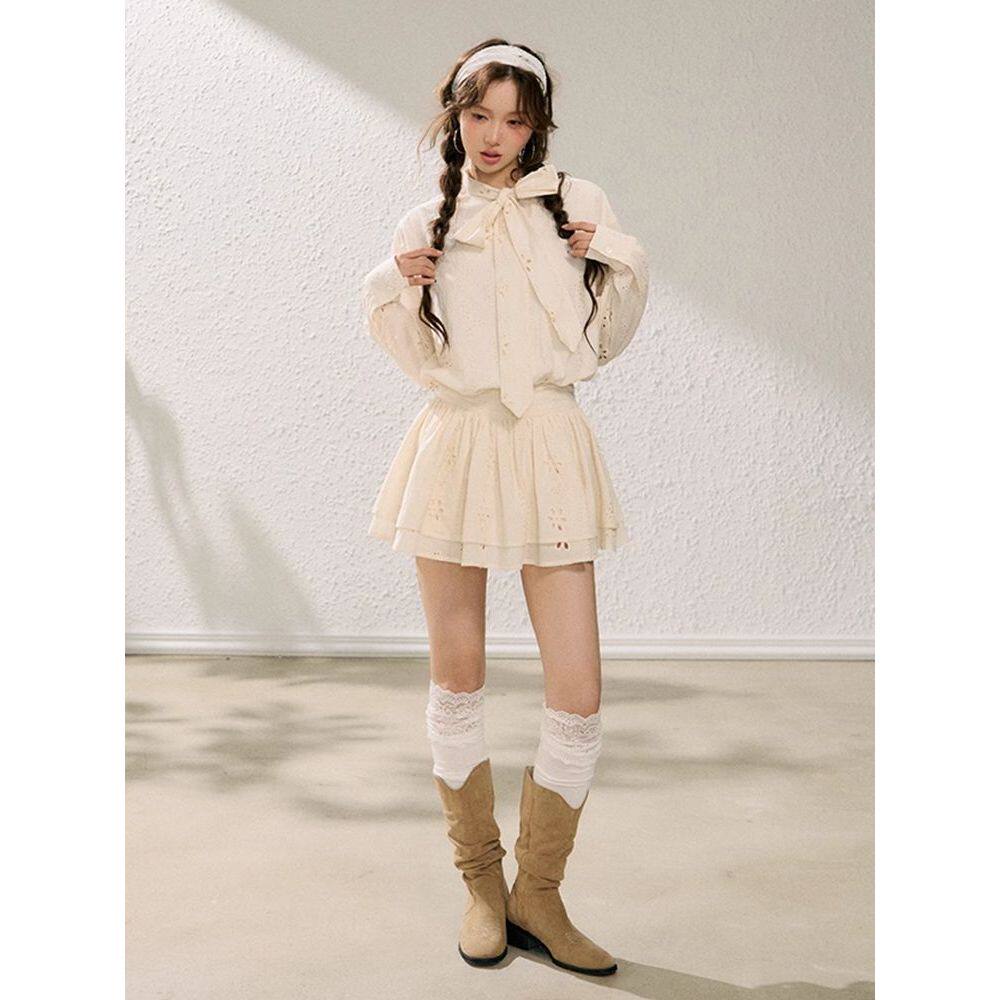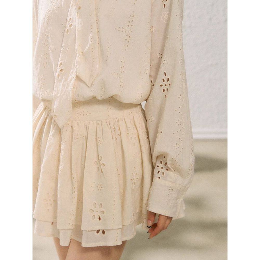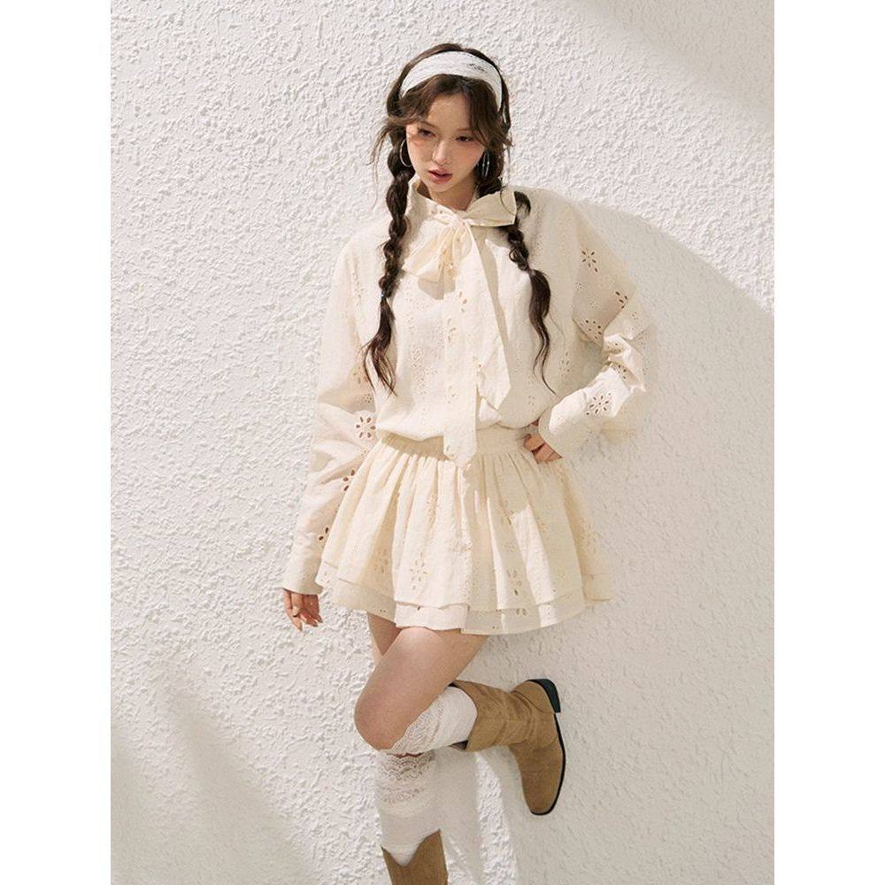 浪漫假日 初秋法式镂空花朵飘带领衬衫女外套显瘦蛋糕裙半裙套装