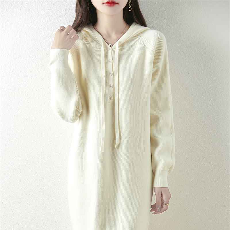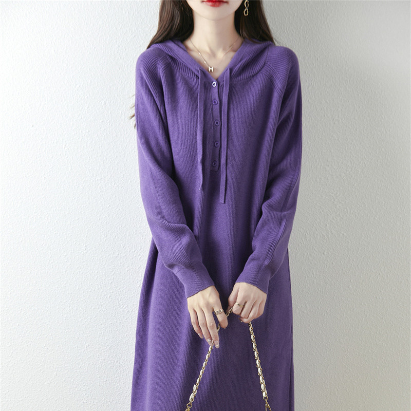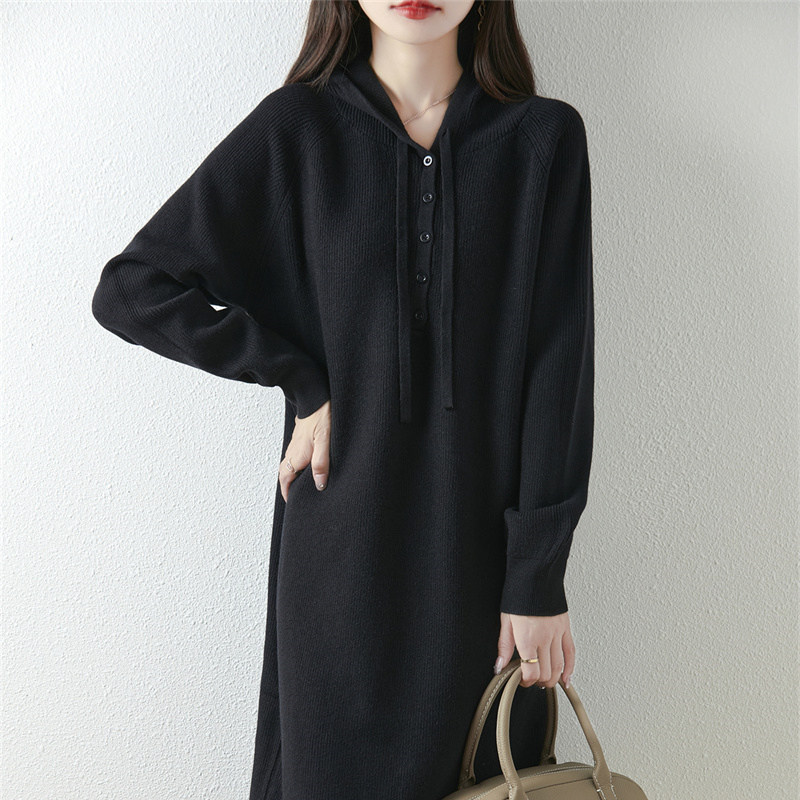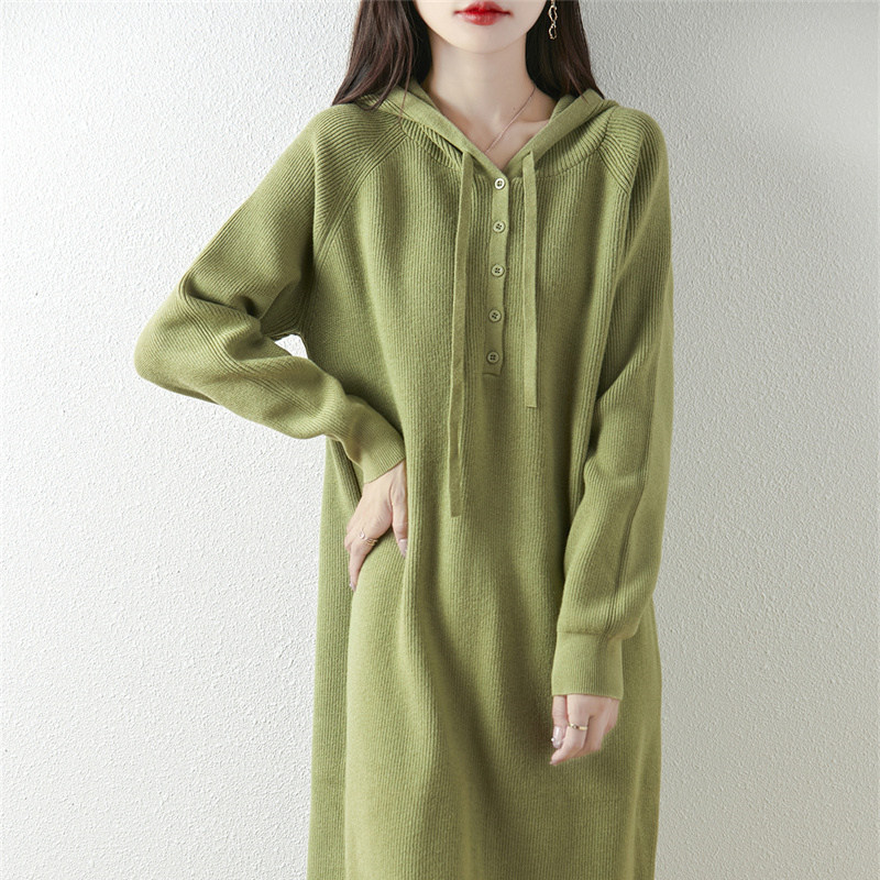 针织连衣裙秋冬新款超好看连帽中长款毛衣裙加厚保暖宽松长款毛衣