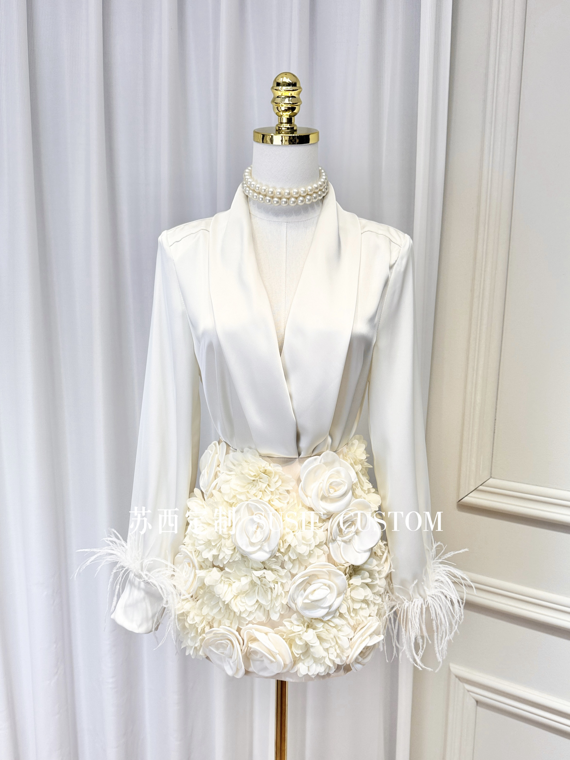 定制显气质V领垫肩翻领羽毛袖口缎面衬衫上衣高腰亮片毛毛半身裙