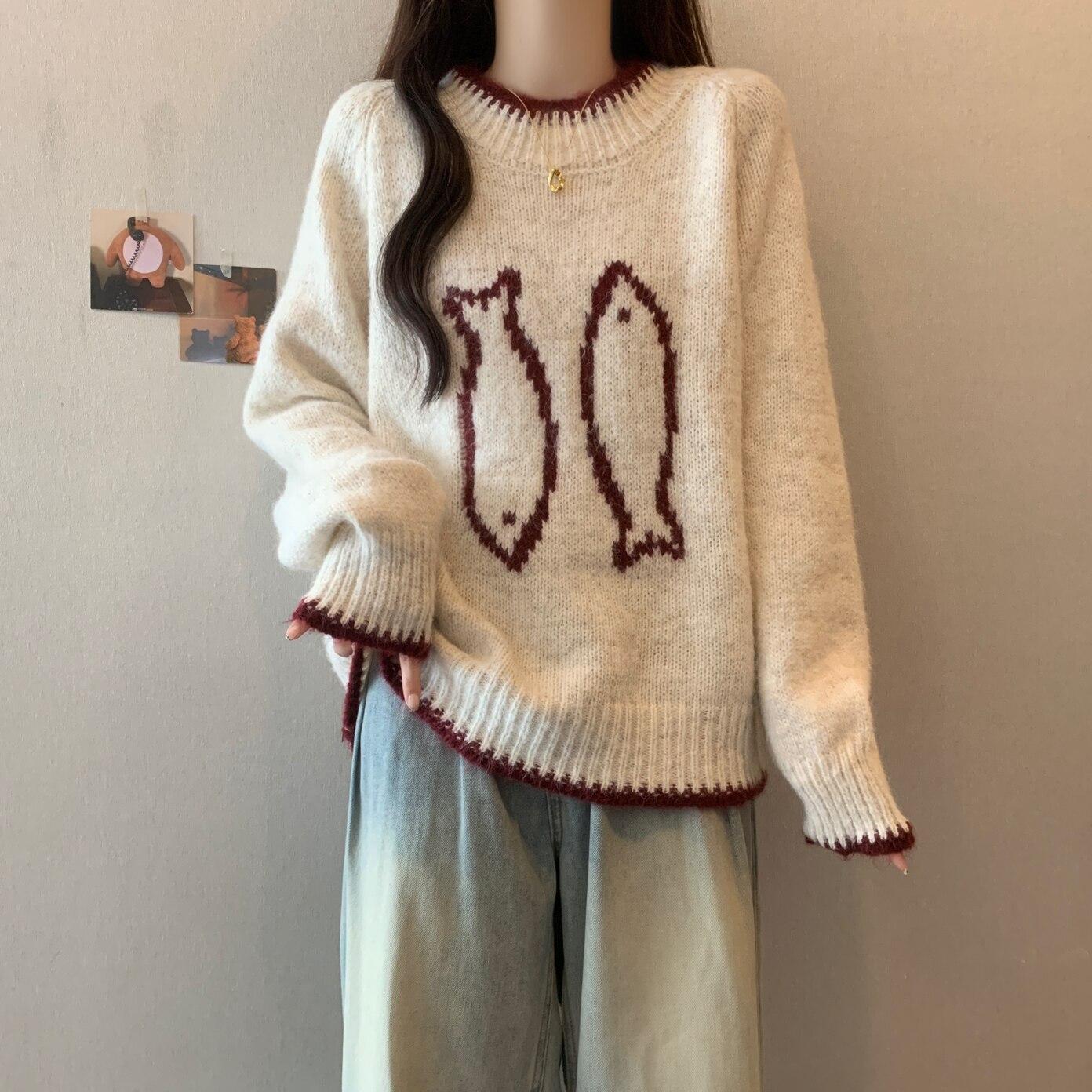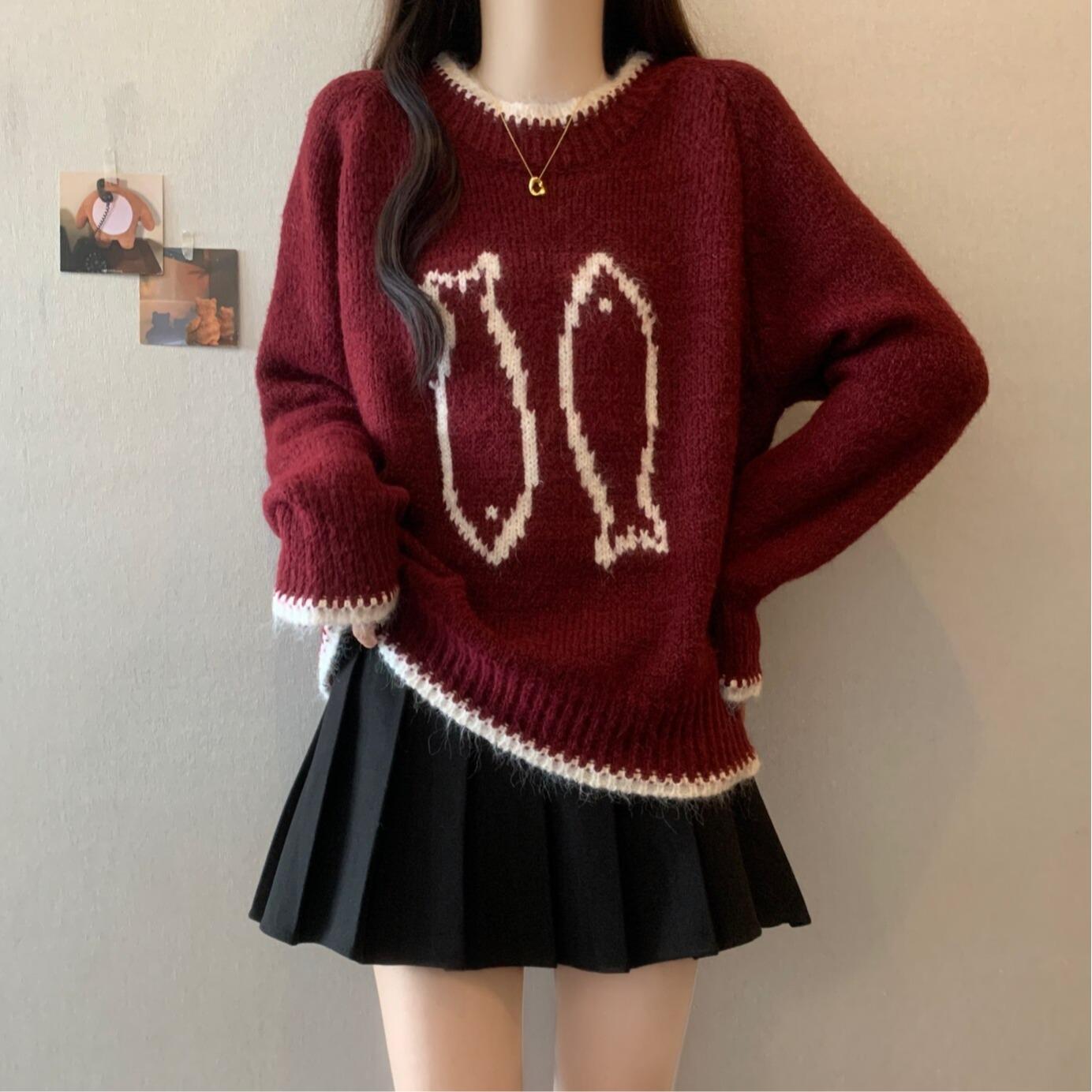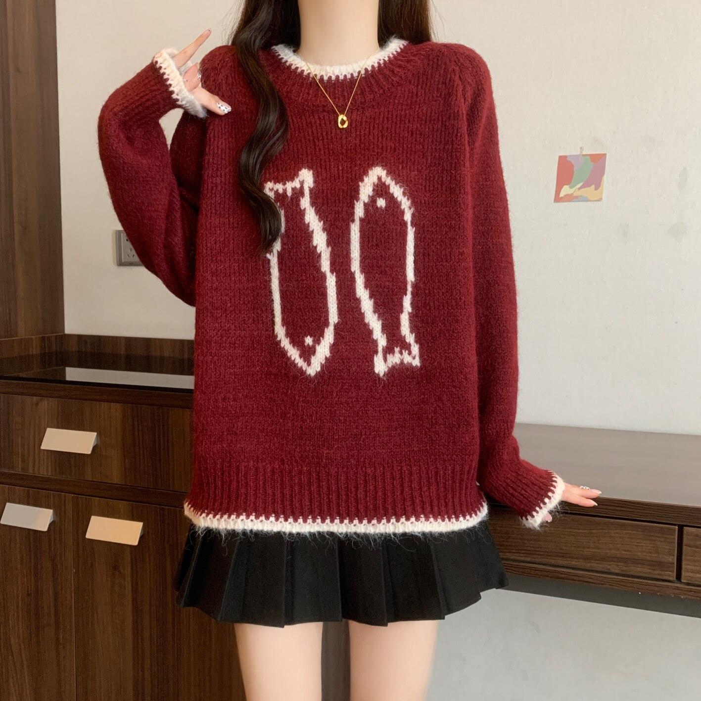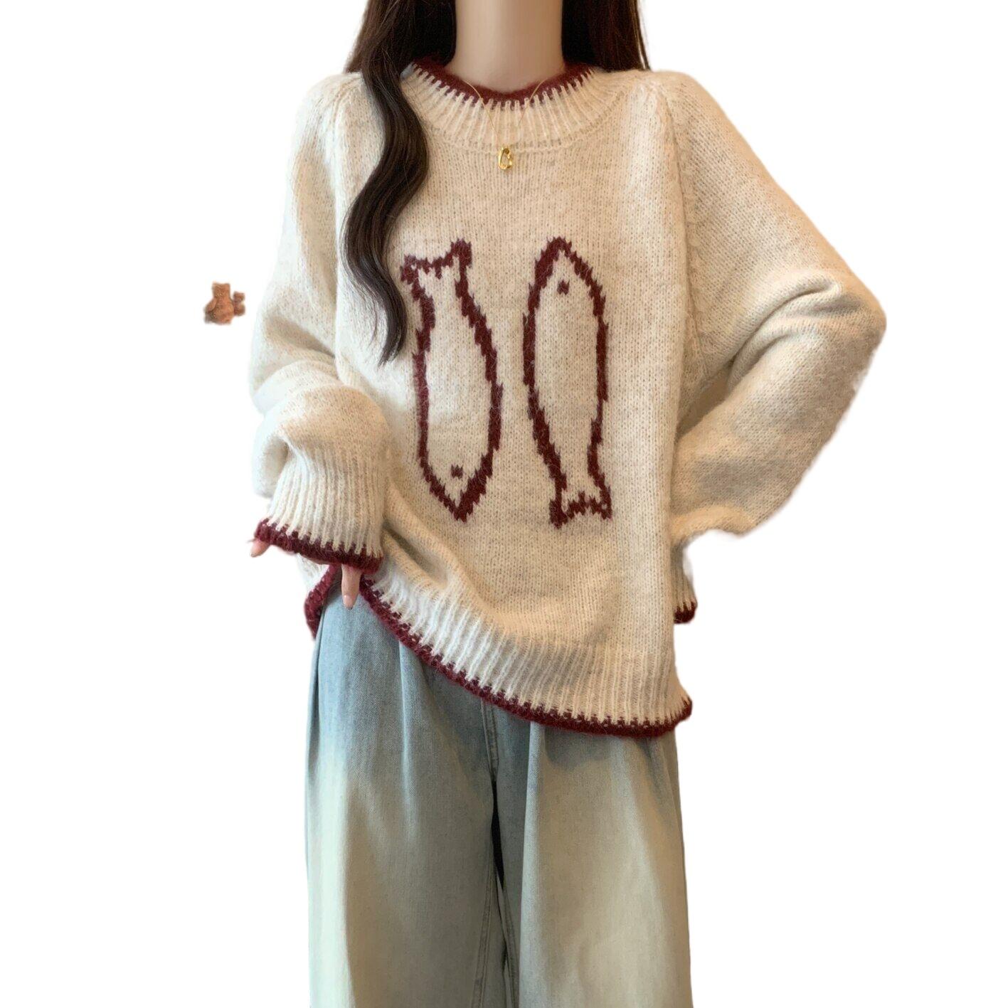 慵懒风小鱼针织衫毛衣女秋冬大码胖mm显瘦正肩宽松软糯打底衫上衣
