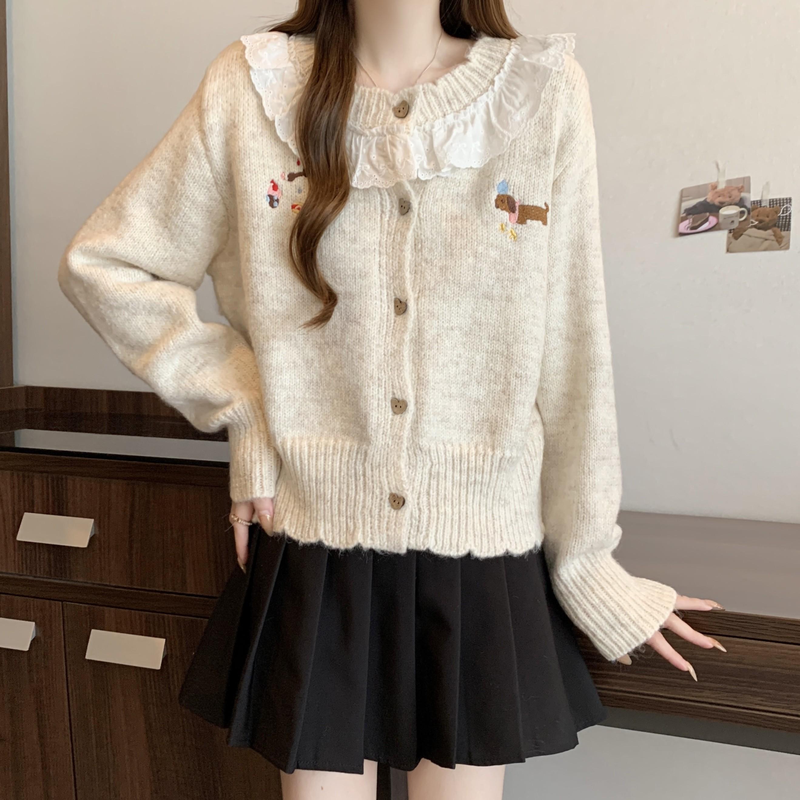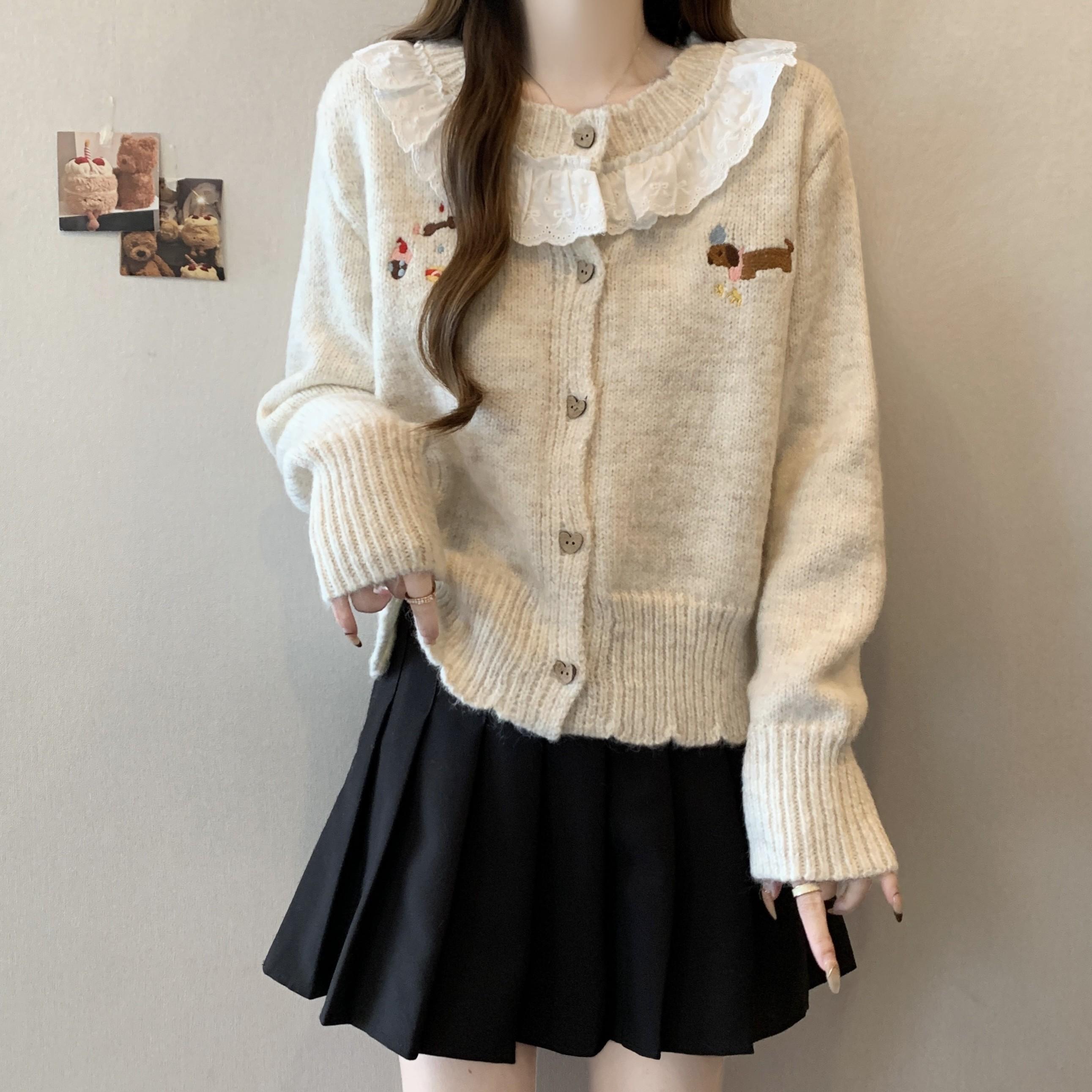 蕾丝娃娃领正肩毛衣外套女2024秋冬大码胖mm腊肠狗爱心扣针织开衫