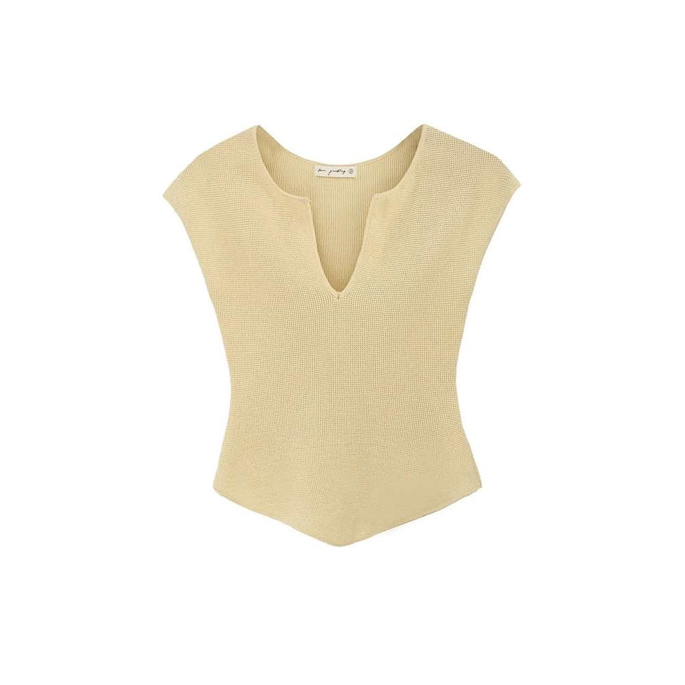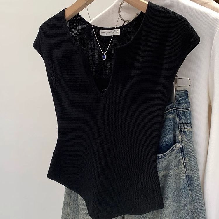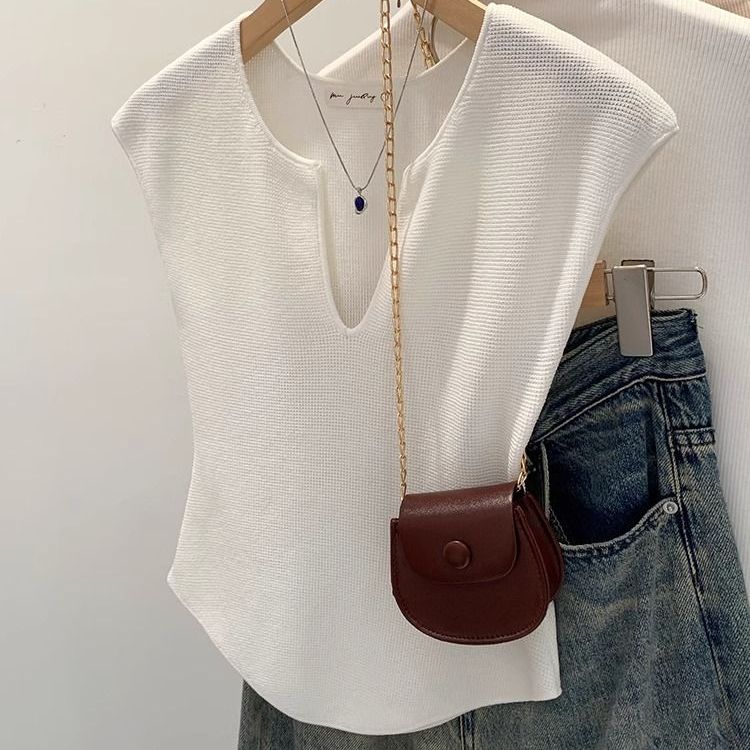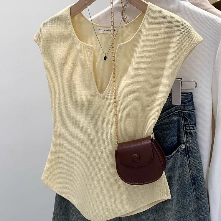 2025新款夏季U型领小飞袖弧下摆针织无袖T恤女休闲外穿背心上衣潮