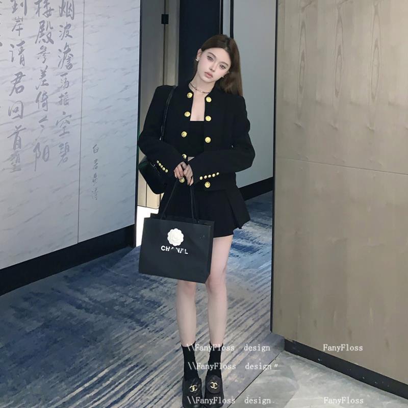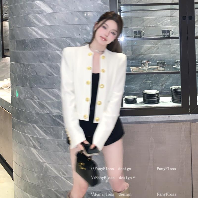 FanyFloss小香风白色粗花呢圆领显瘦西装外套女金扣羊毛短款开衫