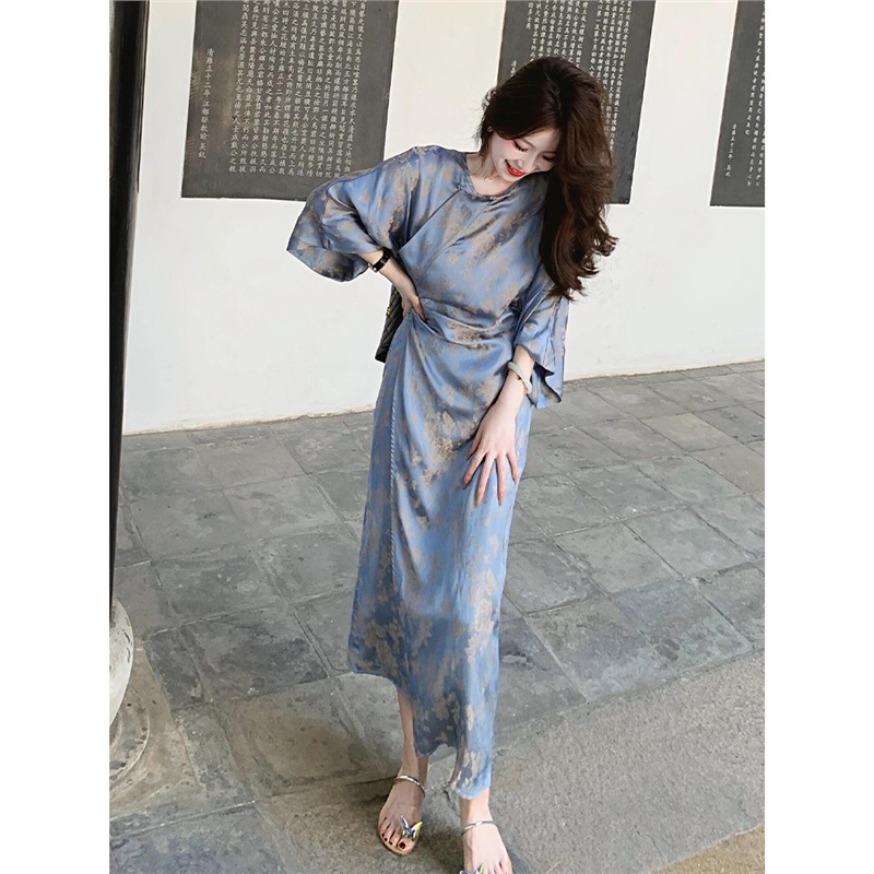 高级感修身显瘦夏季新中式轻国风禅意女装蓝色醋酸碎花改良旗袍