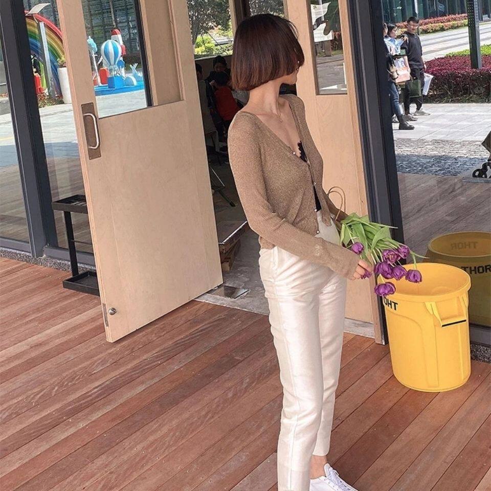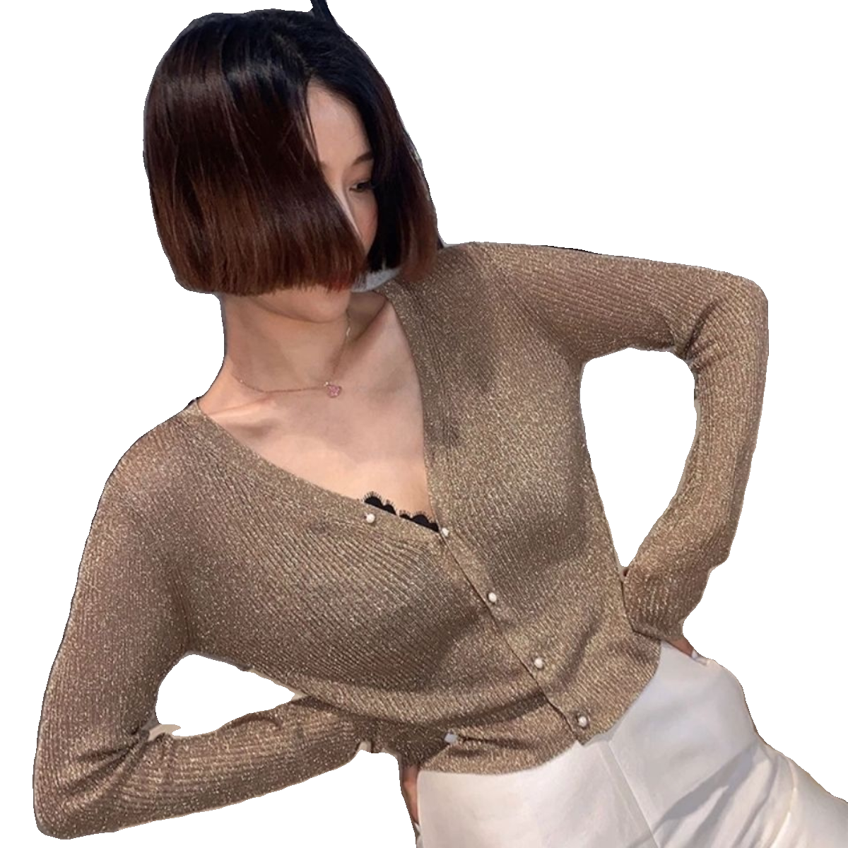 欧洲进口春秋外搭奢侈闪光纱太高级了螺纹针织珍珠扣开衫K1049#