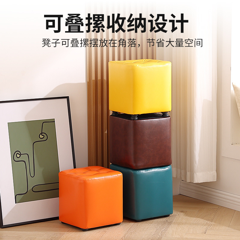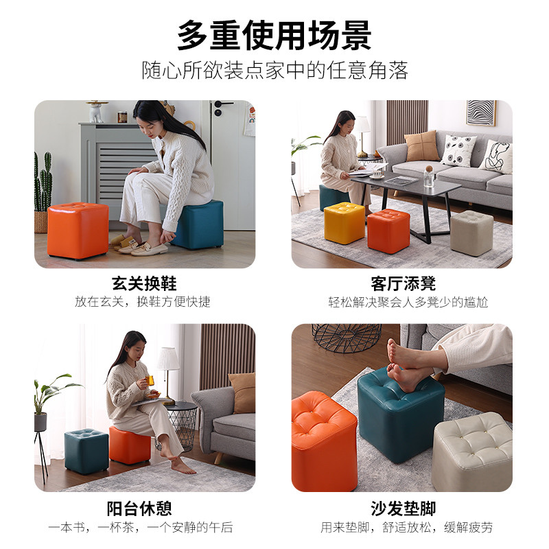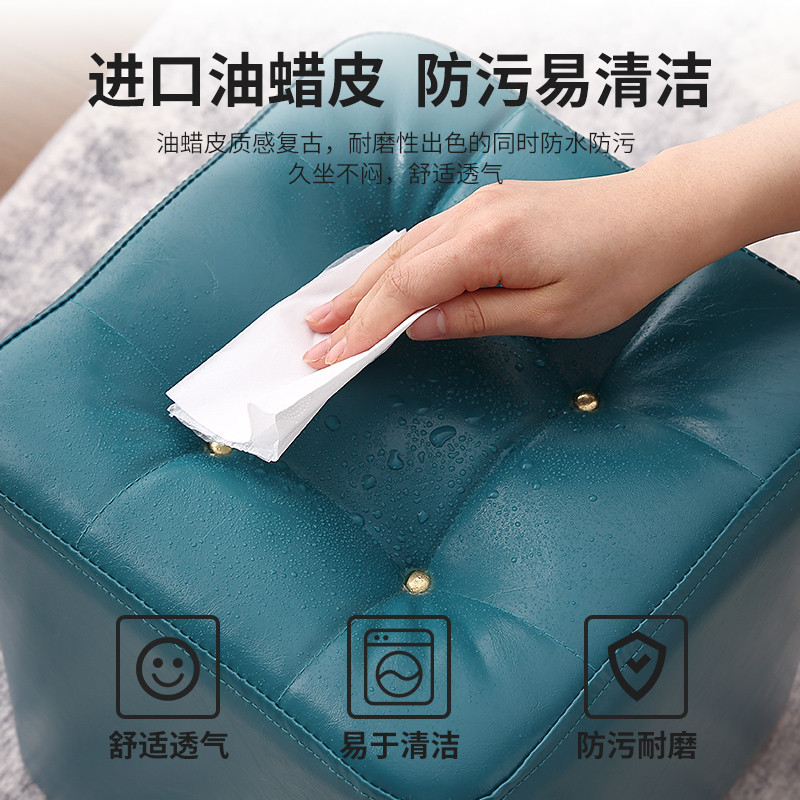 北欧家用创意小凳子矮凳油蜡皮沙发凳实木方凳门口换鞋凳轻奢皮墩