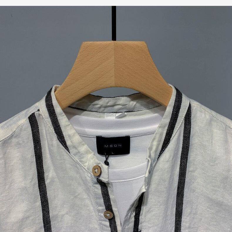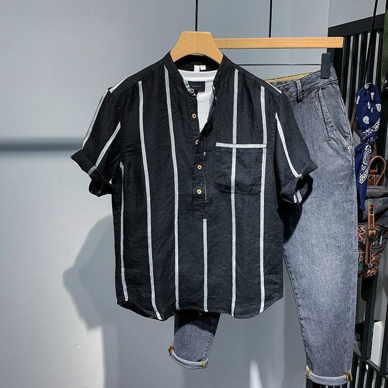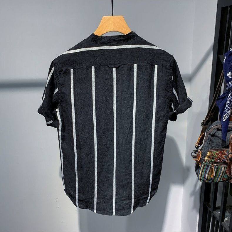 新款条纹立领夏季短袖衬衣男宽松个性男士上衣潮流寸帅气衣寸衣