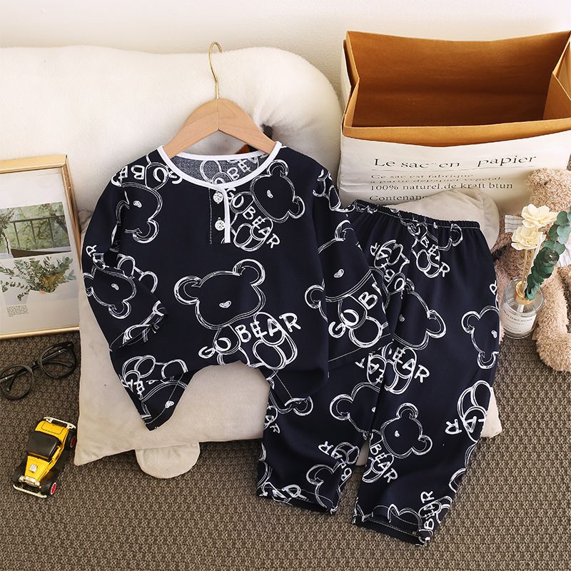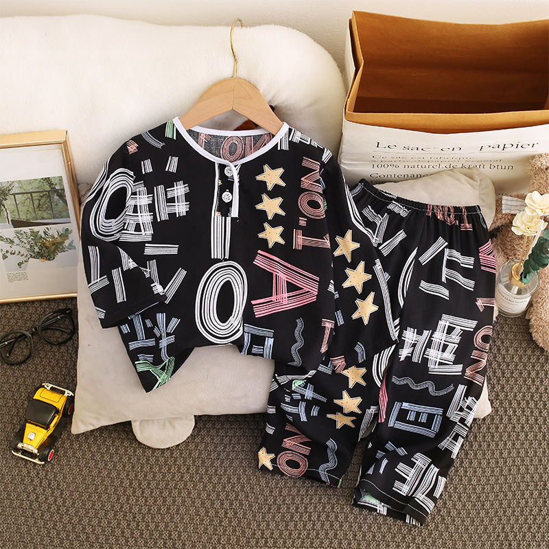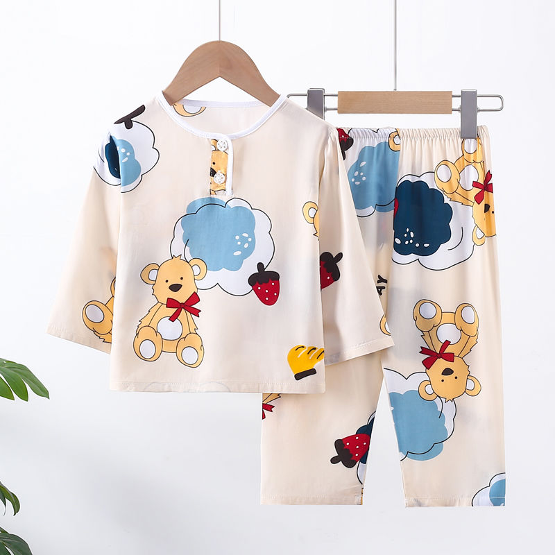 夏季儿童迷彩棉绸睡衣男童女童宝宝绵绸长袖长裤薄款空调服家居服