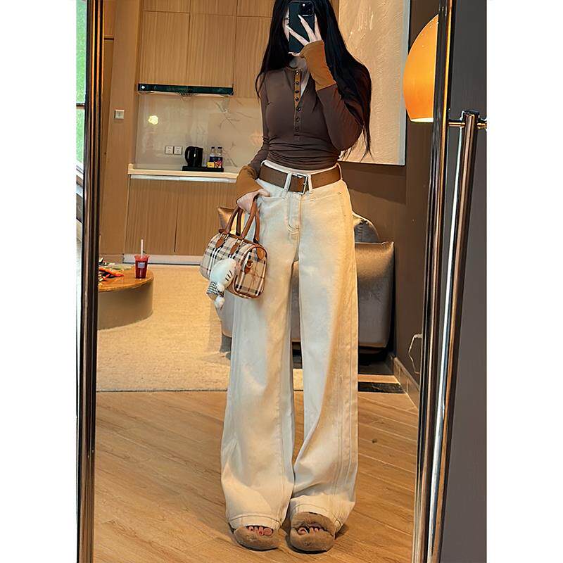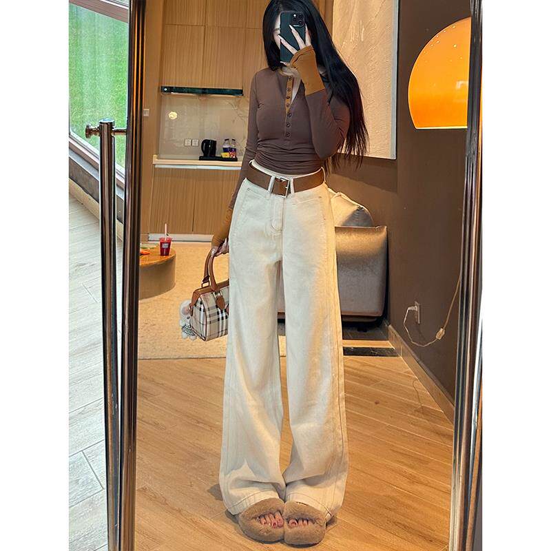 李李杏色原牛腰带加绒阔腿裤牛仔裤女2024秋款高腰宽松显瘦拖地裤