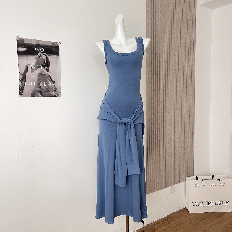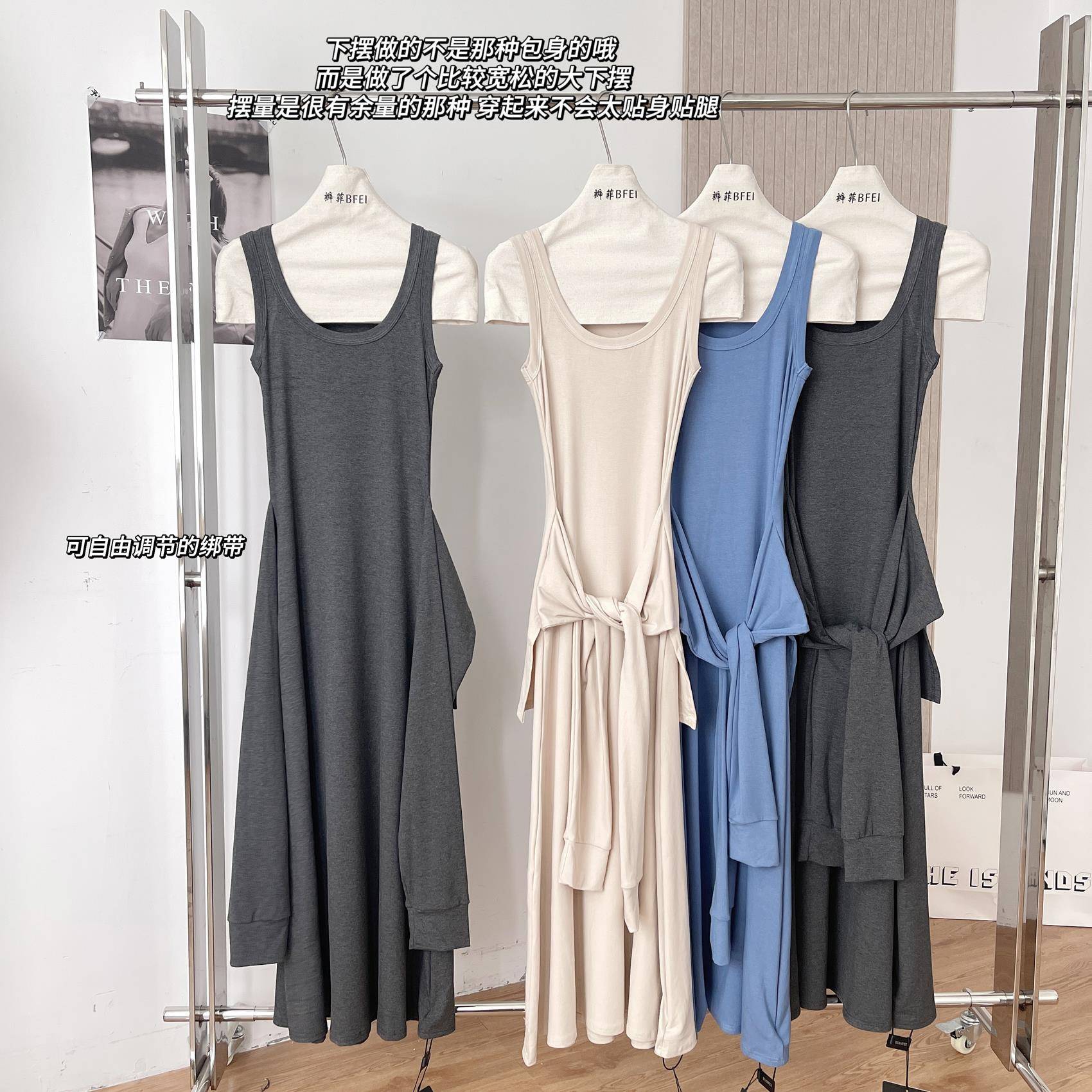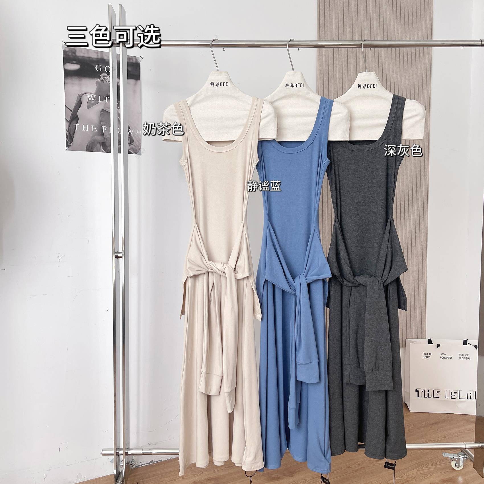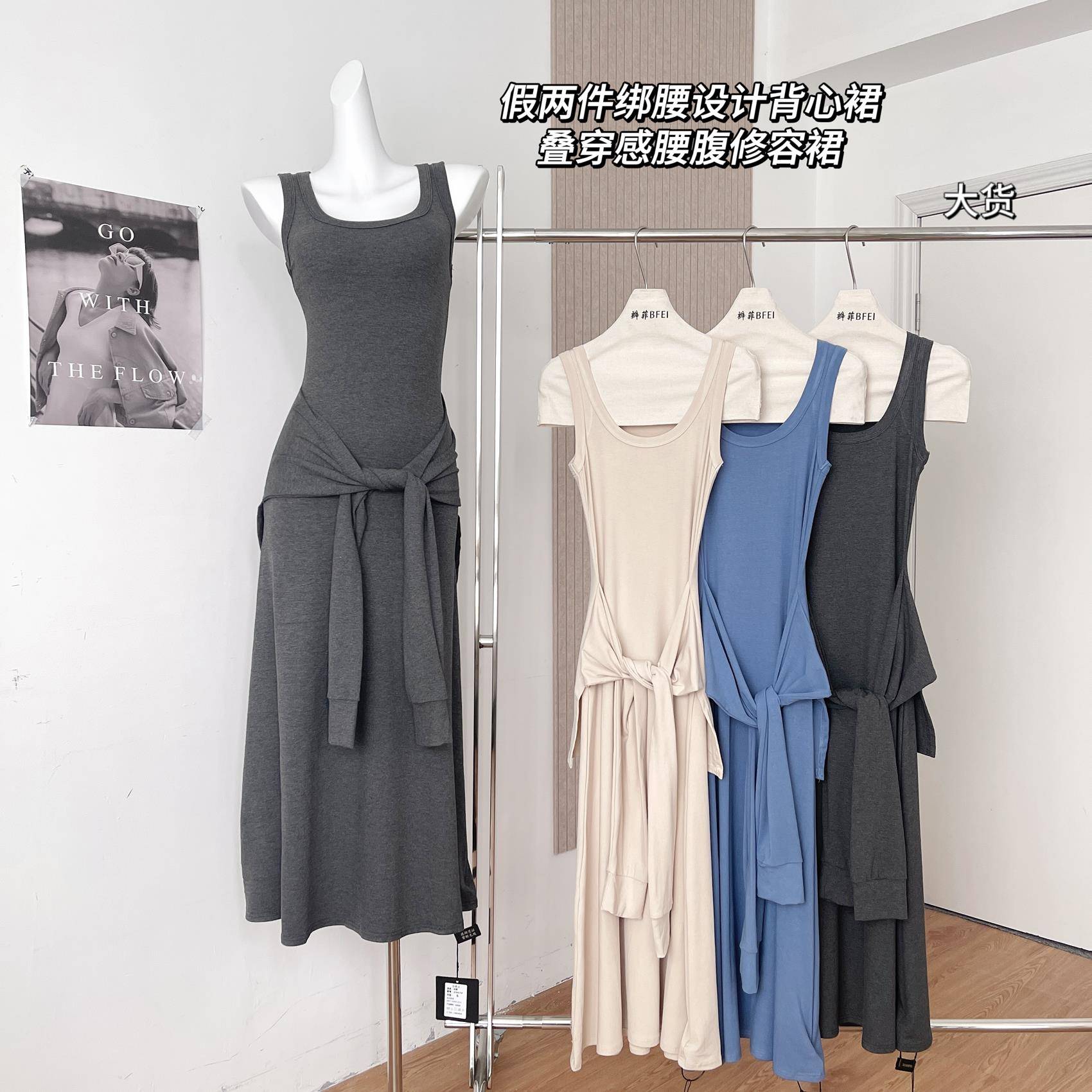 POPW自制 假两件绑腰设计背心裙女夏叠穿感腰腹修容裙长版洋装