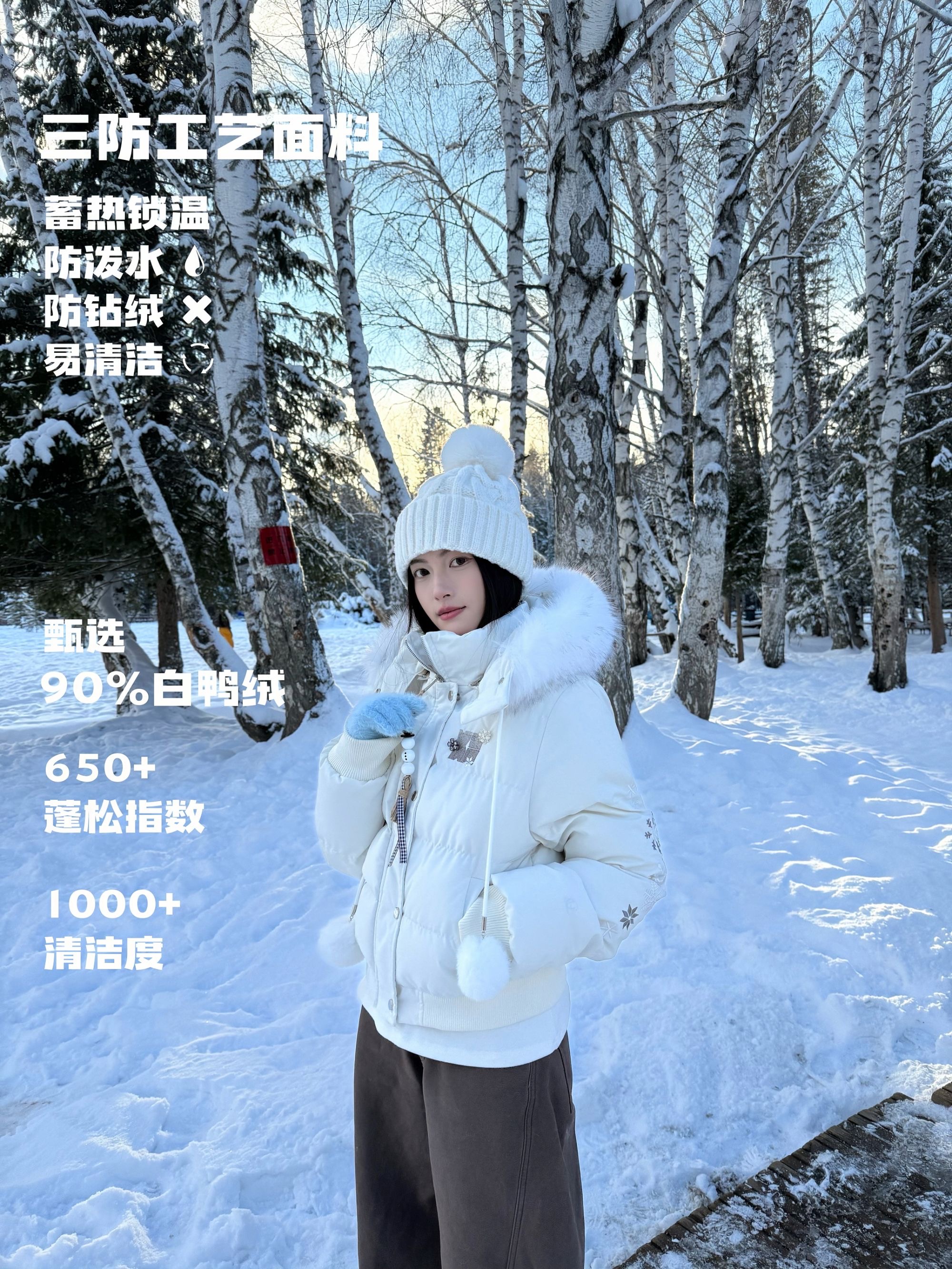 ‘雪花刺绣90羽绒服’AMER 美式冬季短款雪人拉链连帽收腰羽绒服